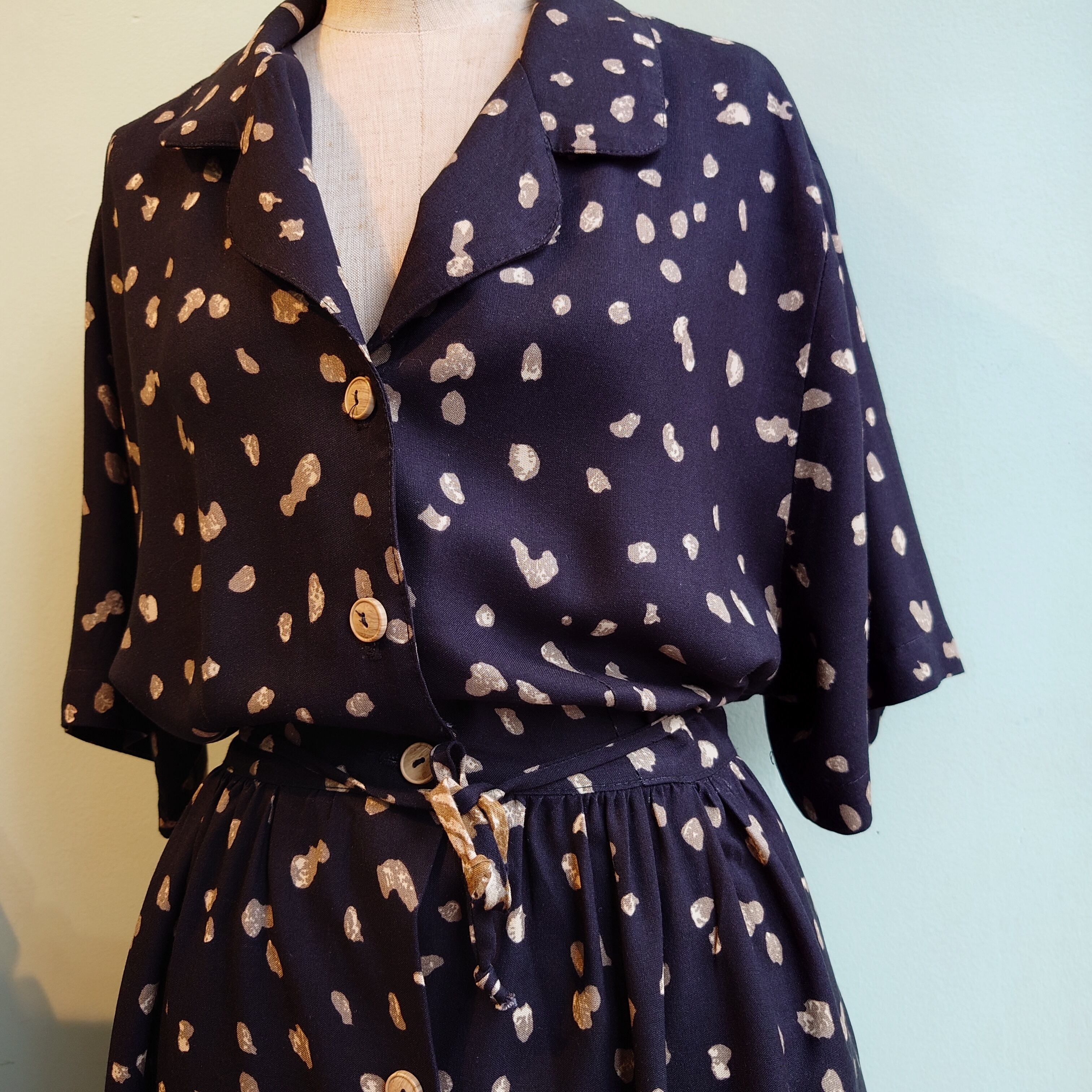 テロっとしたドレスシャツのようなレーヨン、黒をベースにした落ち着いた花柄に惹かれるヴィンテージドレス。後ろに絞り紐付きで、ゆるっとしたAシルエットから、ウエストマークしたようなガーリーなシルエットまで気分で変化OK。木目調のボタンでナチュラルさも持ち合わせた1枚。