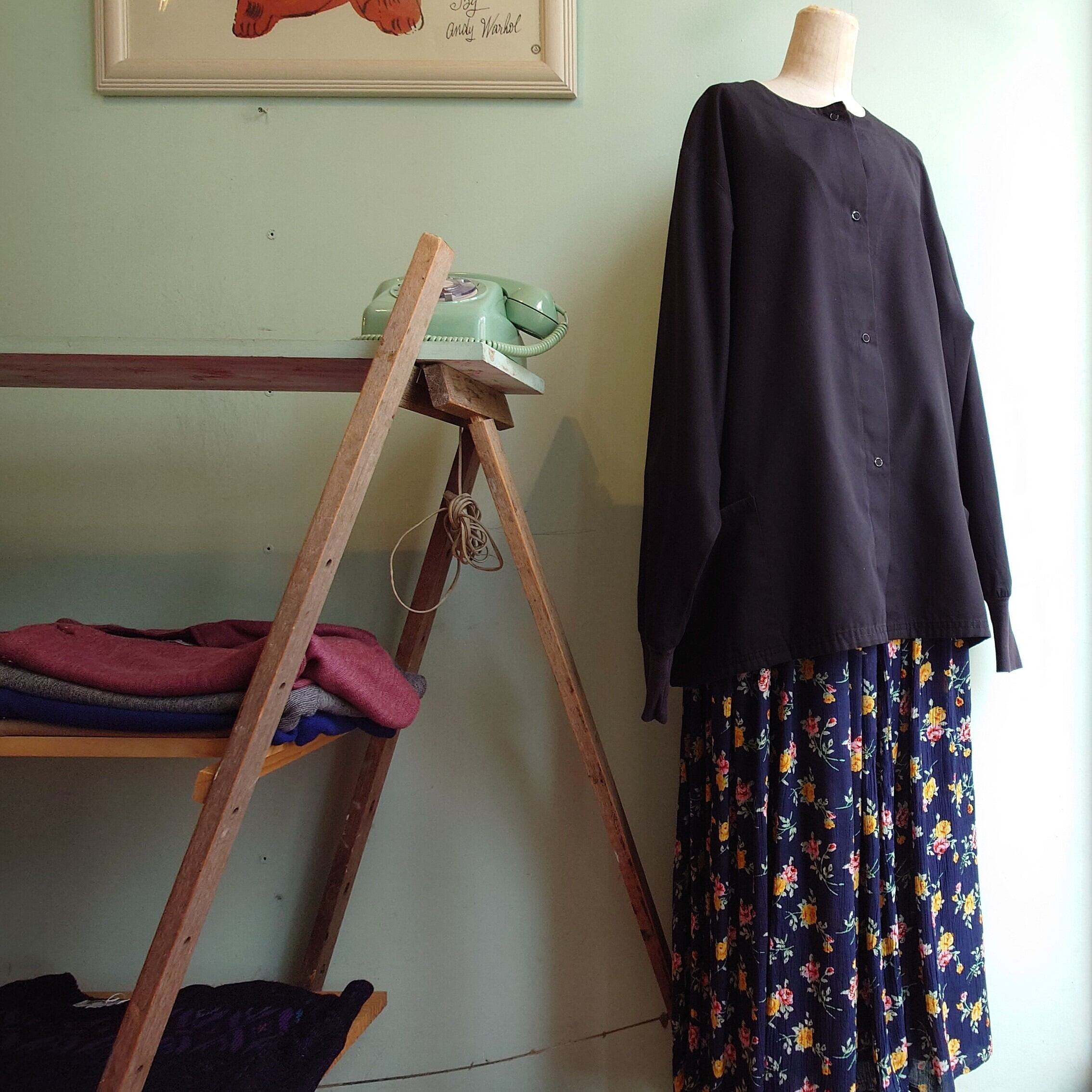 USAで実際に使われていたスクラブ。丸襟、袖リブに、スナップボタンでデザインされた、このタイプだけの作りがレア。ボタンの開け締めでブラウス的なコーデから、カーディガン風まで自在。