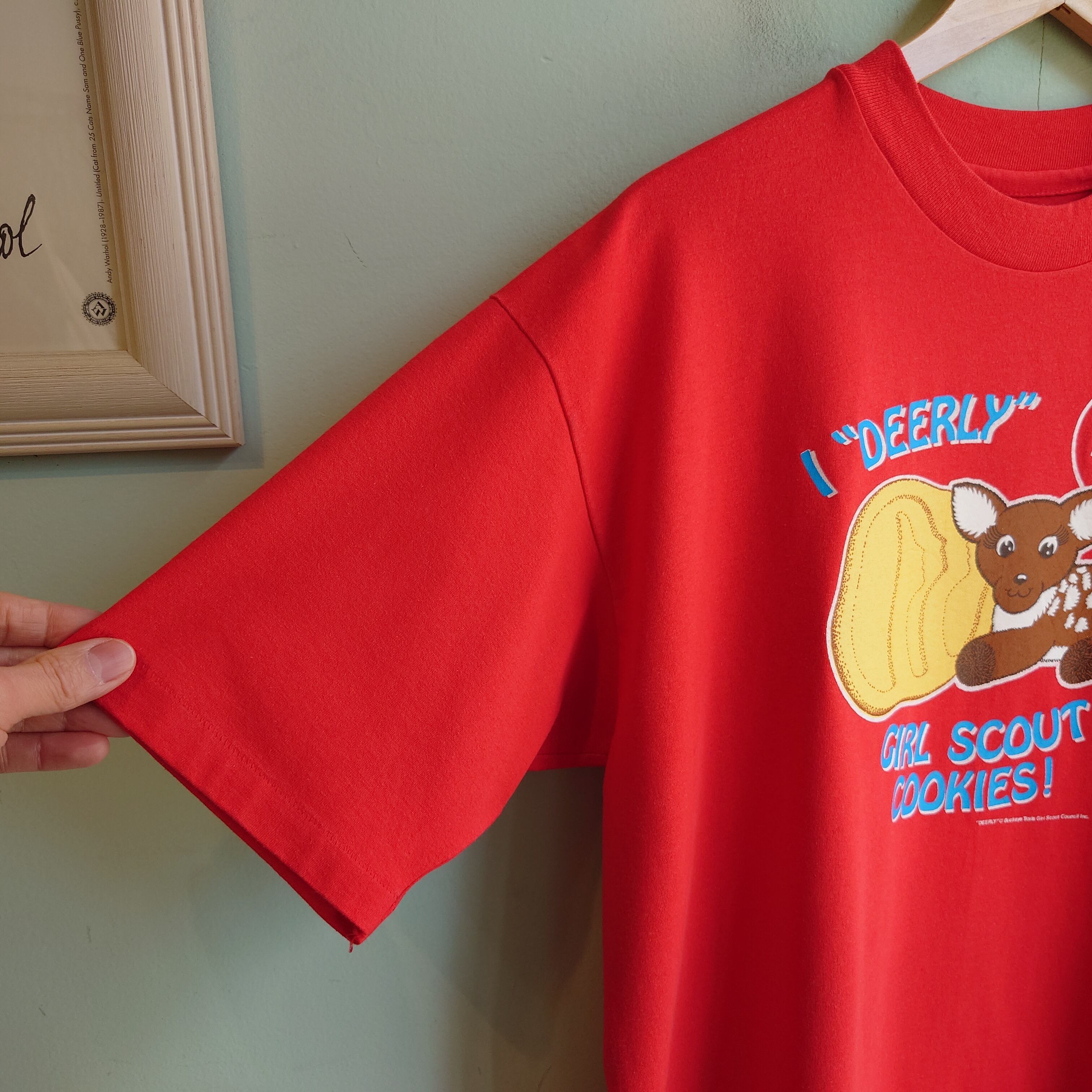 北米ガールスカウトのイベント"ガールスカウトクッキー"をモチーフにしたヴィンテージTシャツ。赤ちゃんシカのキャラクター系プリントもかわいい。オハイオ州らしい伝統のレッド。