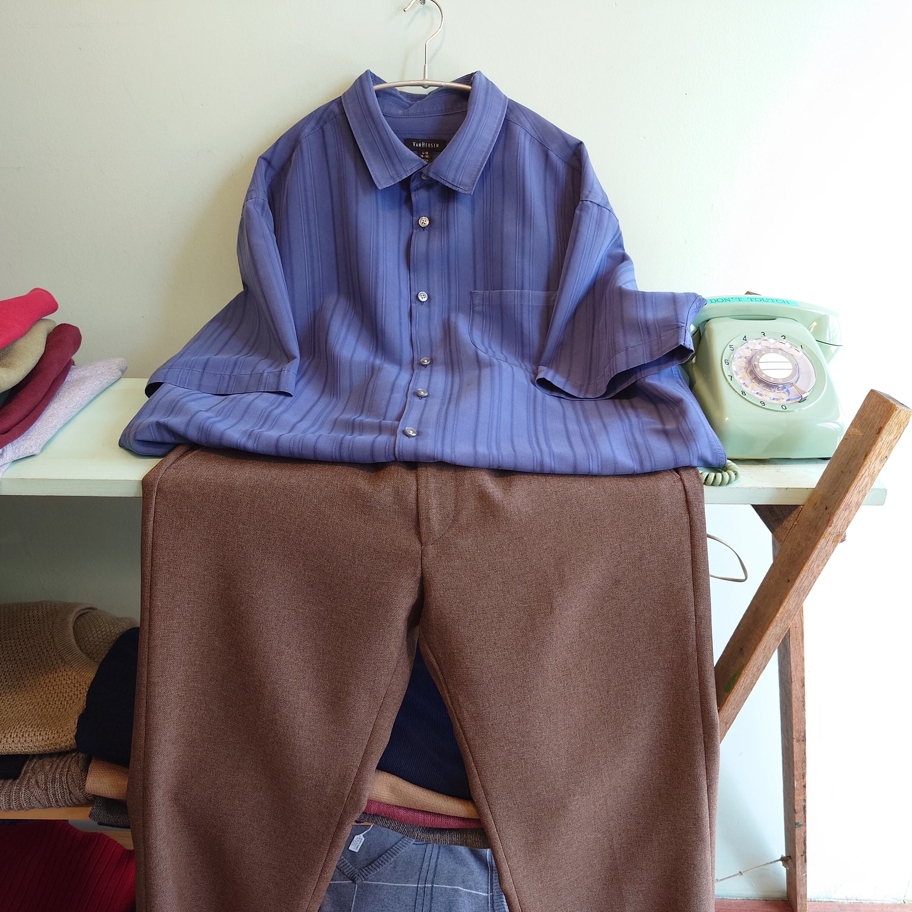 van heusen 90-00s ドレスシャツ ストライプシャツ ボックスシャツ L くすみ 青系