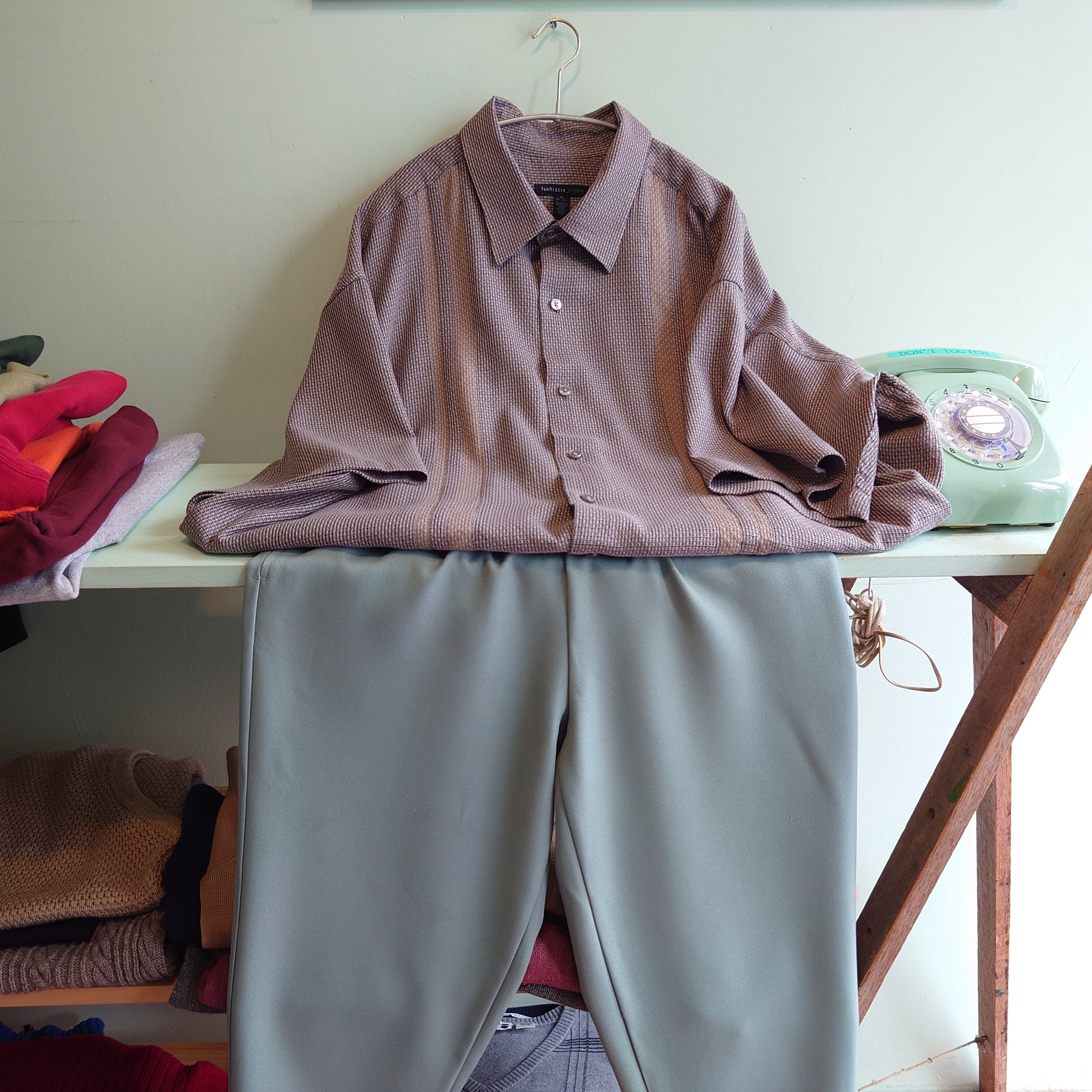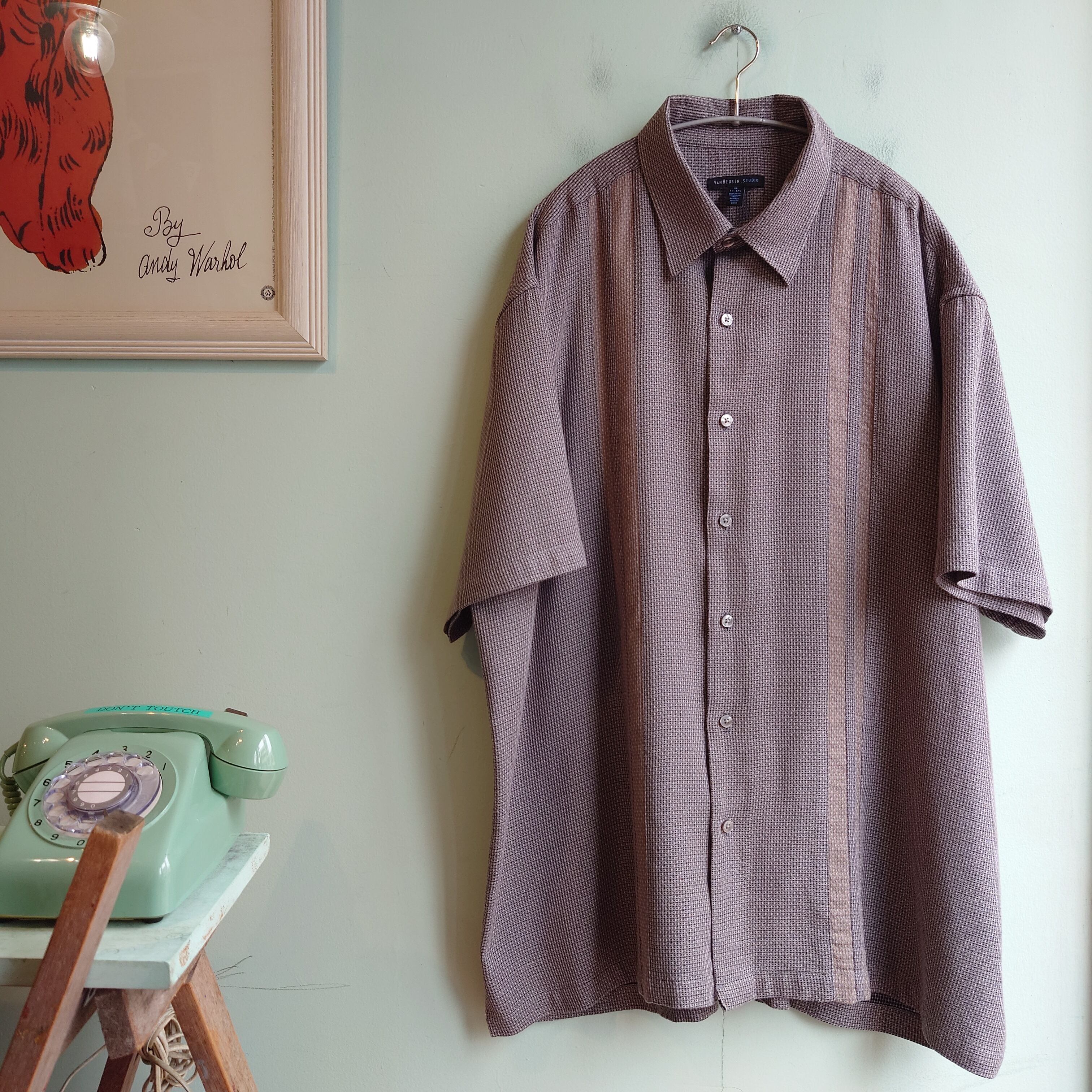 グアヤベラシャツの民族感をベースに、西海岸系のニュアンスで再構築したカジノシャツ。全面に入るラインでボックスシルエットながらシャープさをプラス出来るおすすめジャンルです。こちらの個体はアースカラーのナチュラル食に、サマーニットの様な織りが印象的な変わり種。
