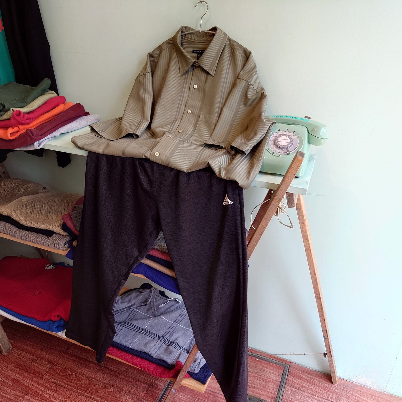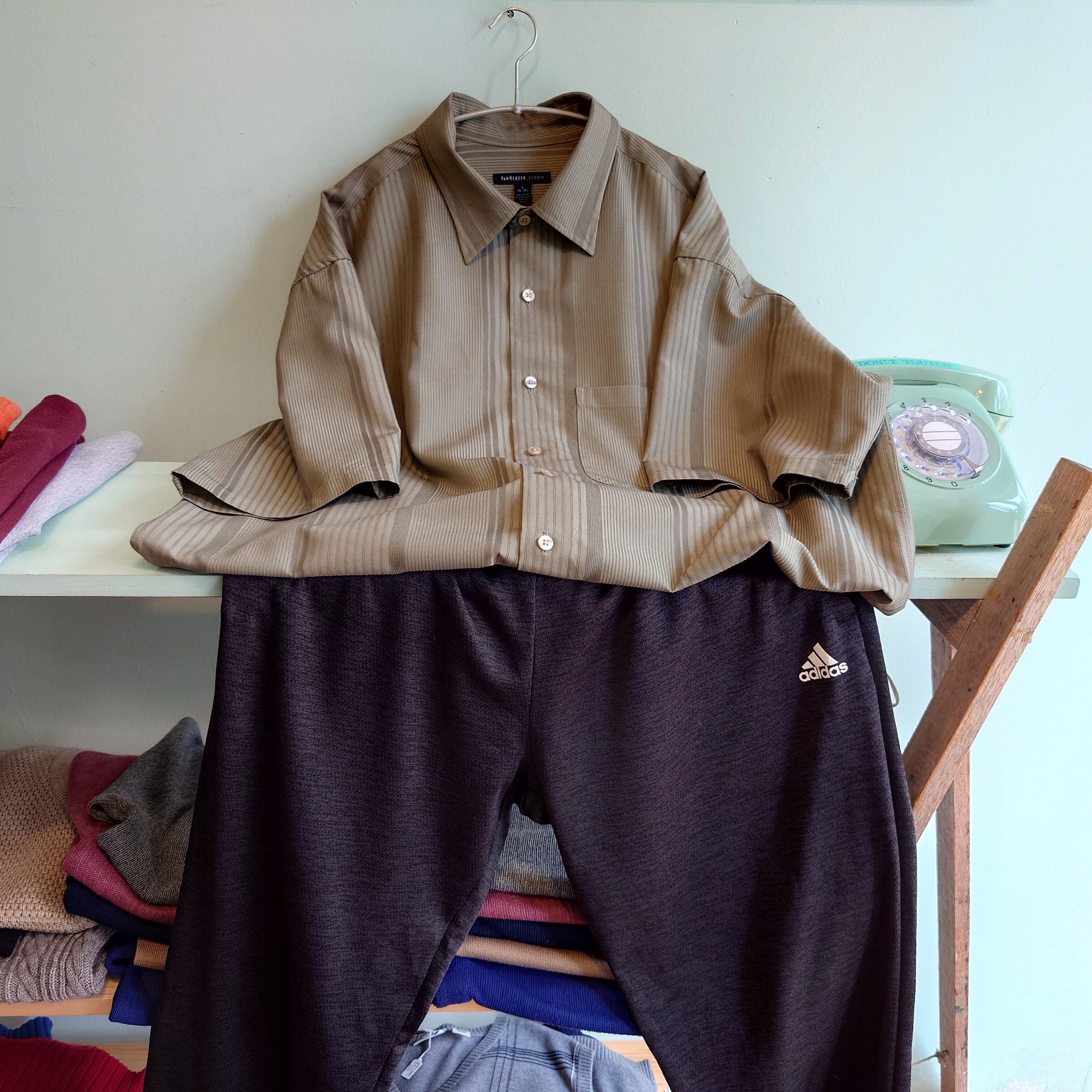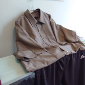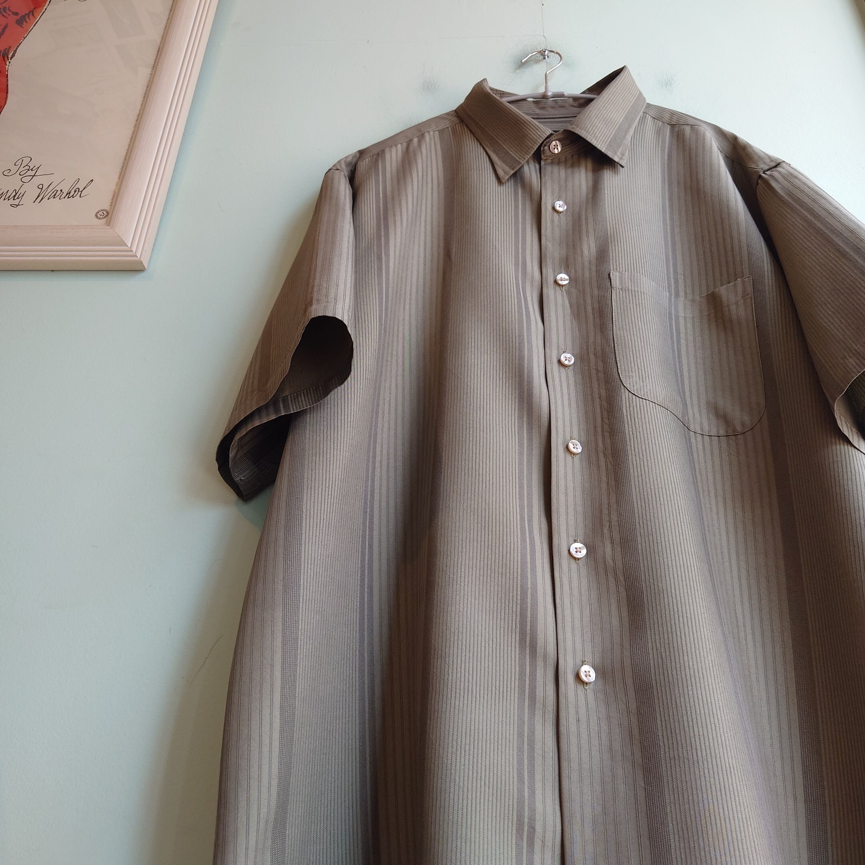 オリーブ色に光沢とくすみ感を加えたドレスシャツ。ストライプは織り目の凸凹感で、立体的なデザインも。合わせやすいボックスシルエットと、とろみも強めでひらひらした動きもばっちり。アロハシャツのように涼しく着られて、それよりも格段に渋めな雰囲気が自慢の1枚。