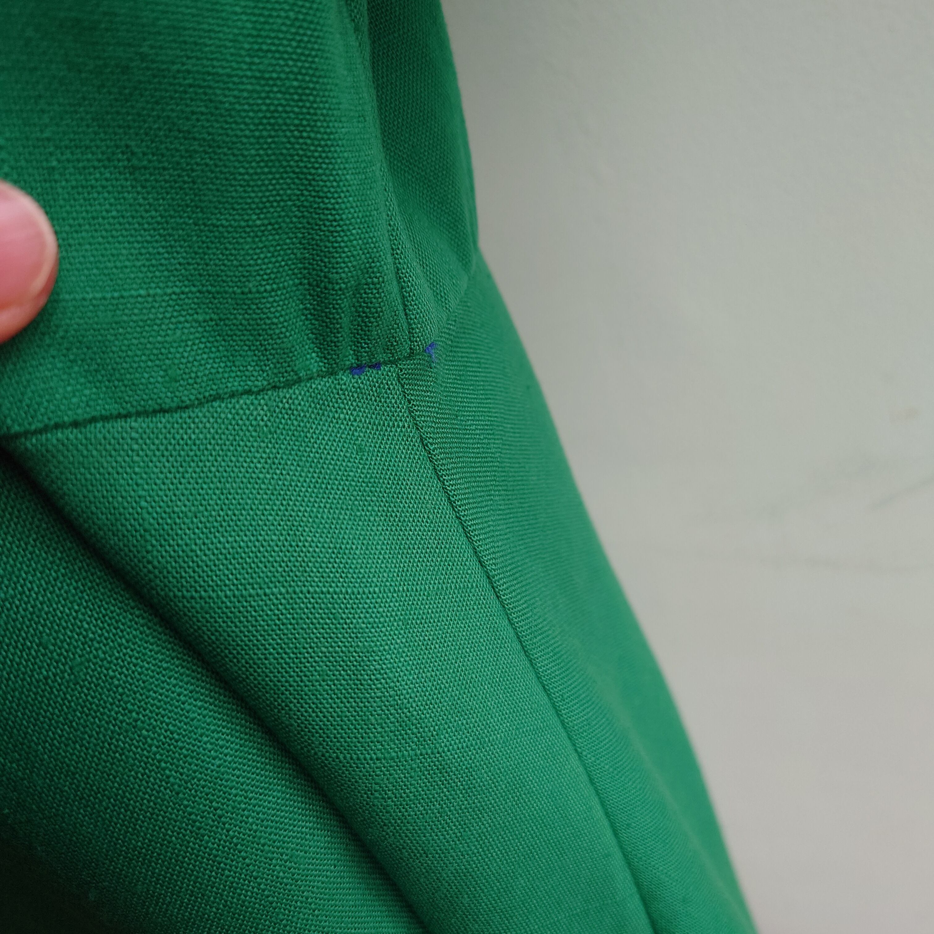 裾にかけてAラインに広がるシルエット、胸元のVラインがレトロフューチャーなヴィンテージドレス。スタプレ系素材のまったり感も70sそのもの。袖周りのほんのりパフも◎。グリーン×ブルーのツートーンをより鮮明に出来るベルトも付属。