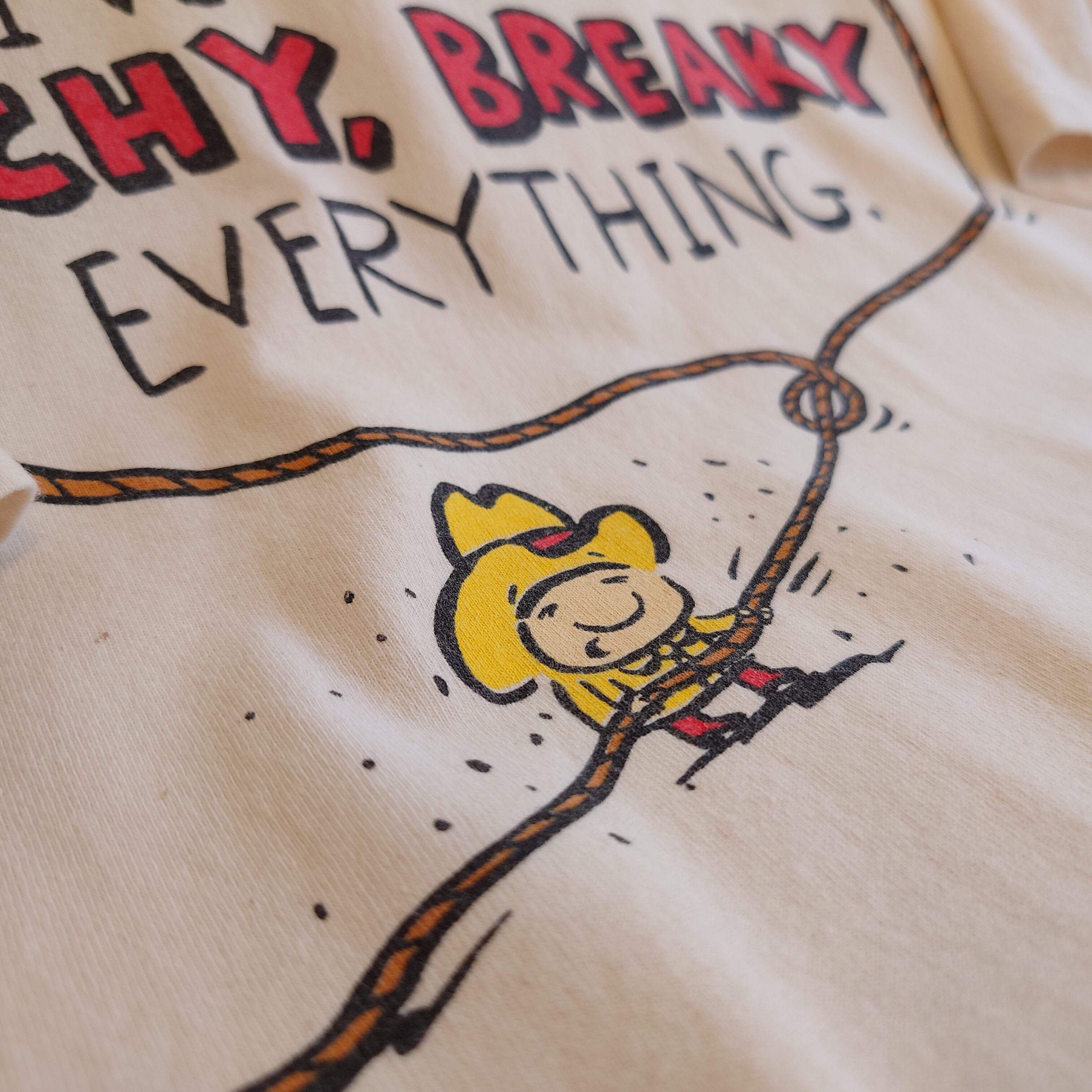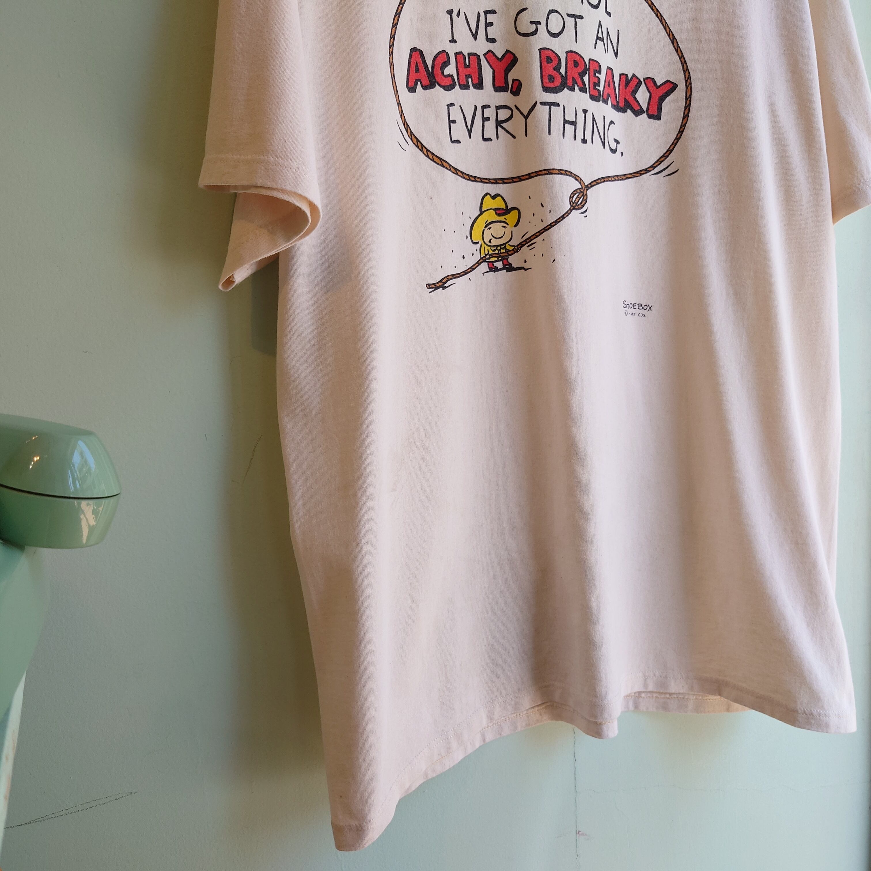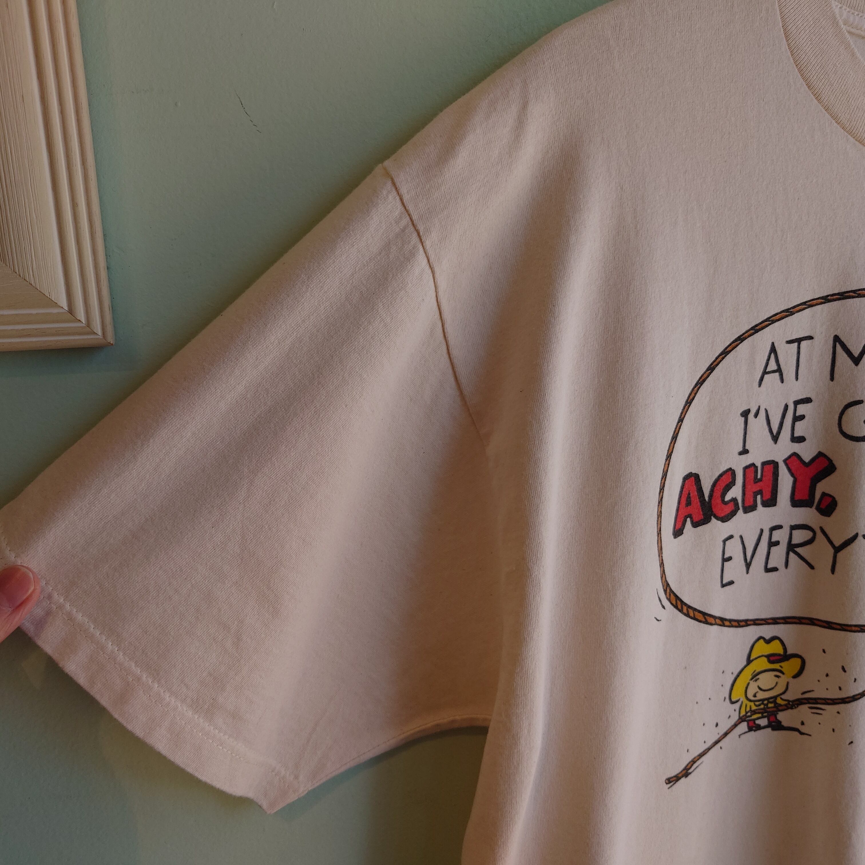 カントリー歌手、ビリーレイサイラスのヒット曲をモチーフにしたヴィンテージTシャツ。珍しい生成り色のボディーに、カウボーイのコスチュームがかわいいキャラクタープリントが雰囲気あり。有名キャラではないけれど、デザインの愛らしさ、かわいさ抜群。