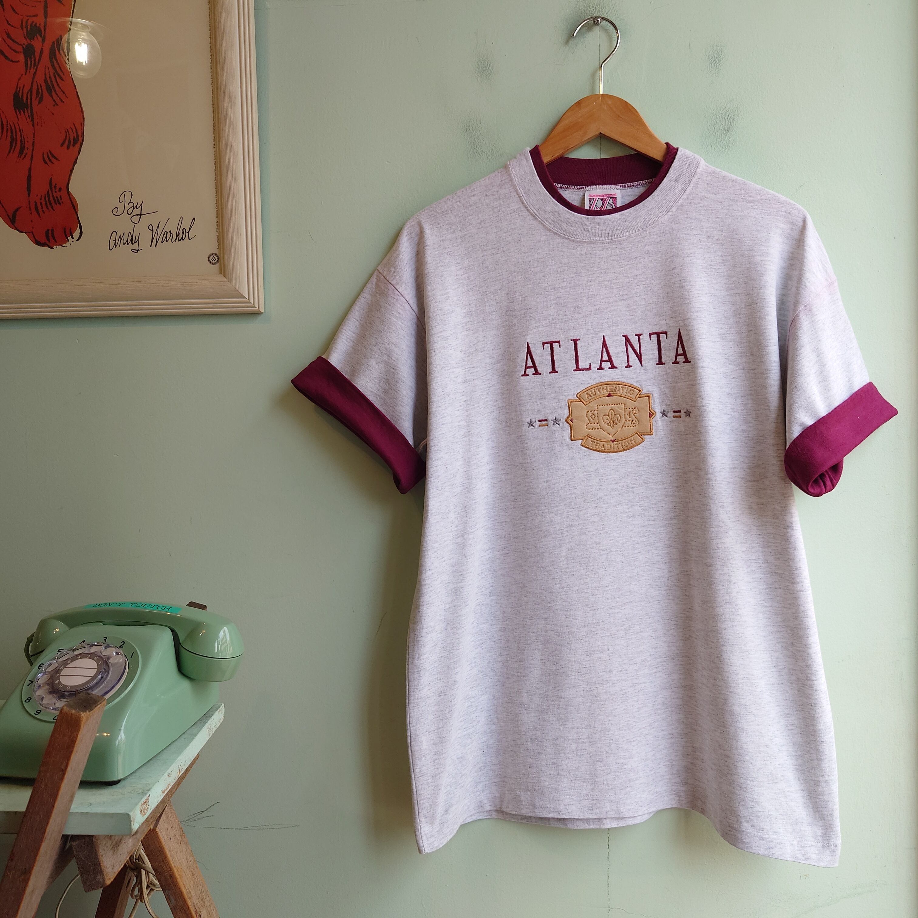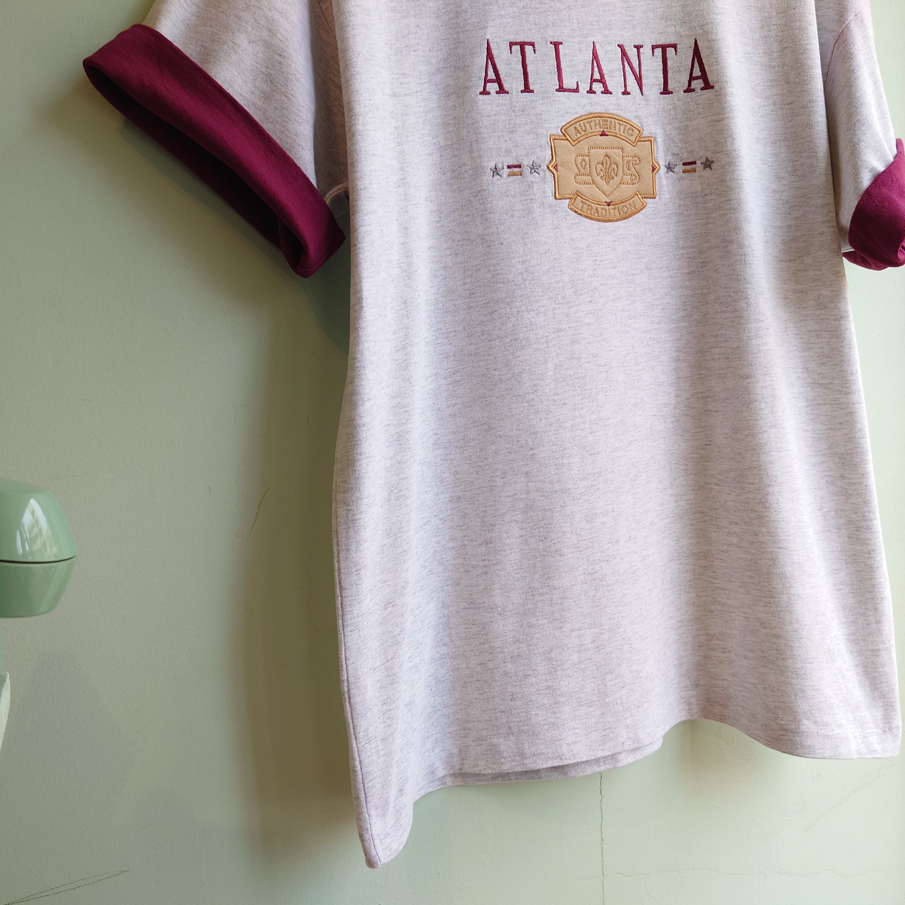 ◎real american 90s vintage ATLANTA ヴィンテージTシャツ スーベニアTシャツ 折返し袖 リンガー USA製 L グレー 白杢