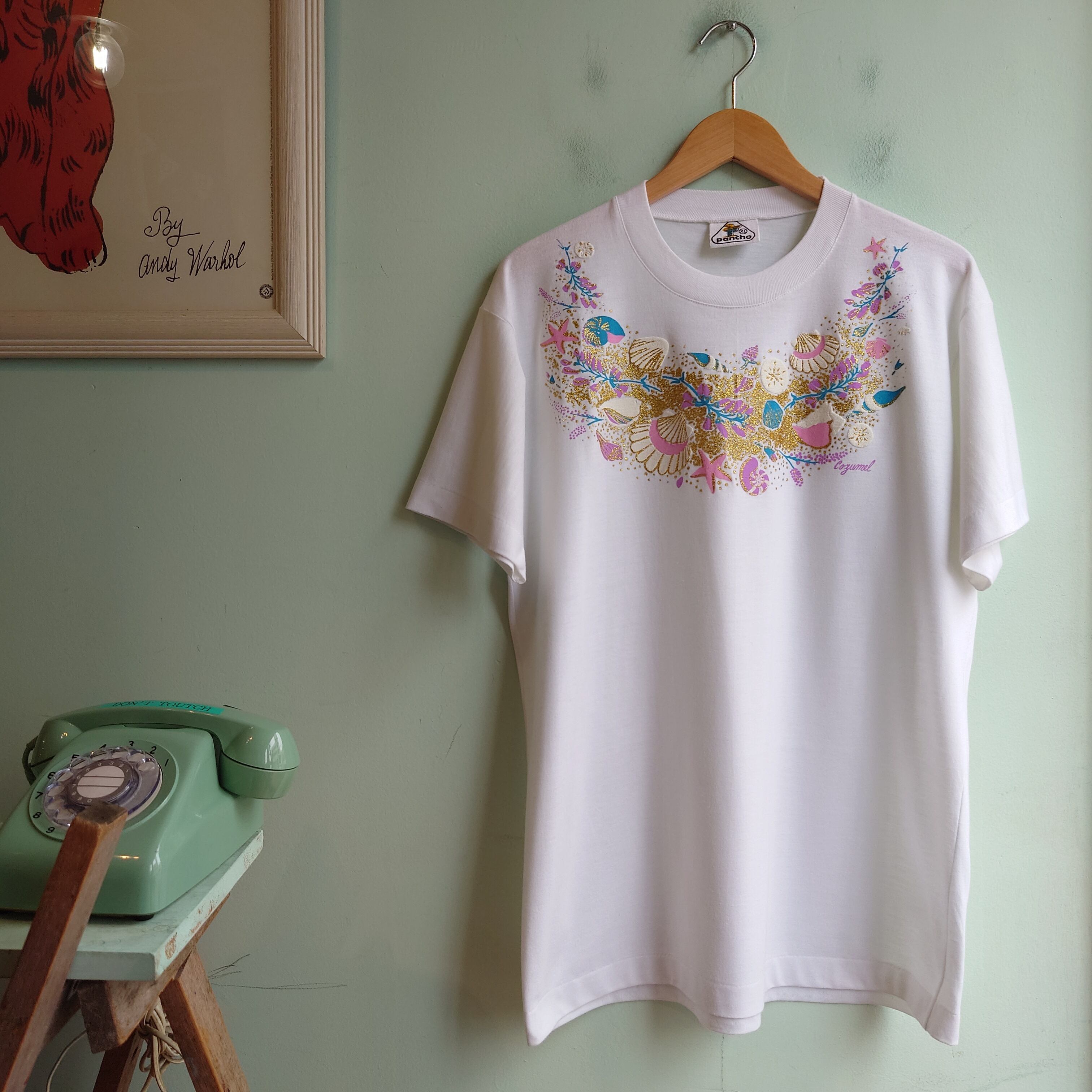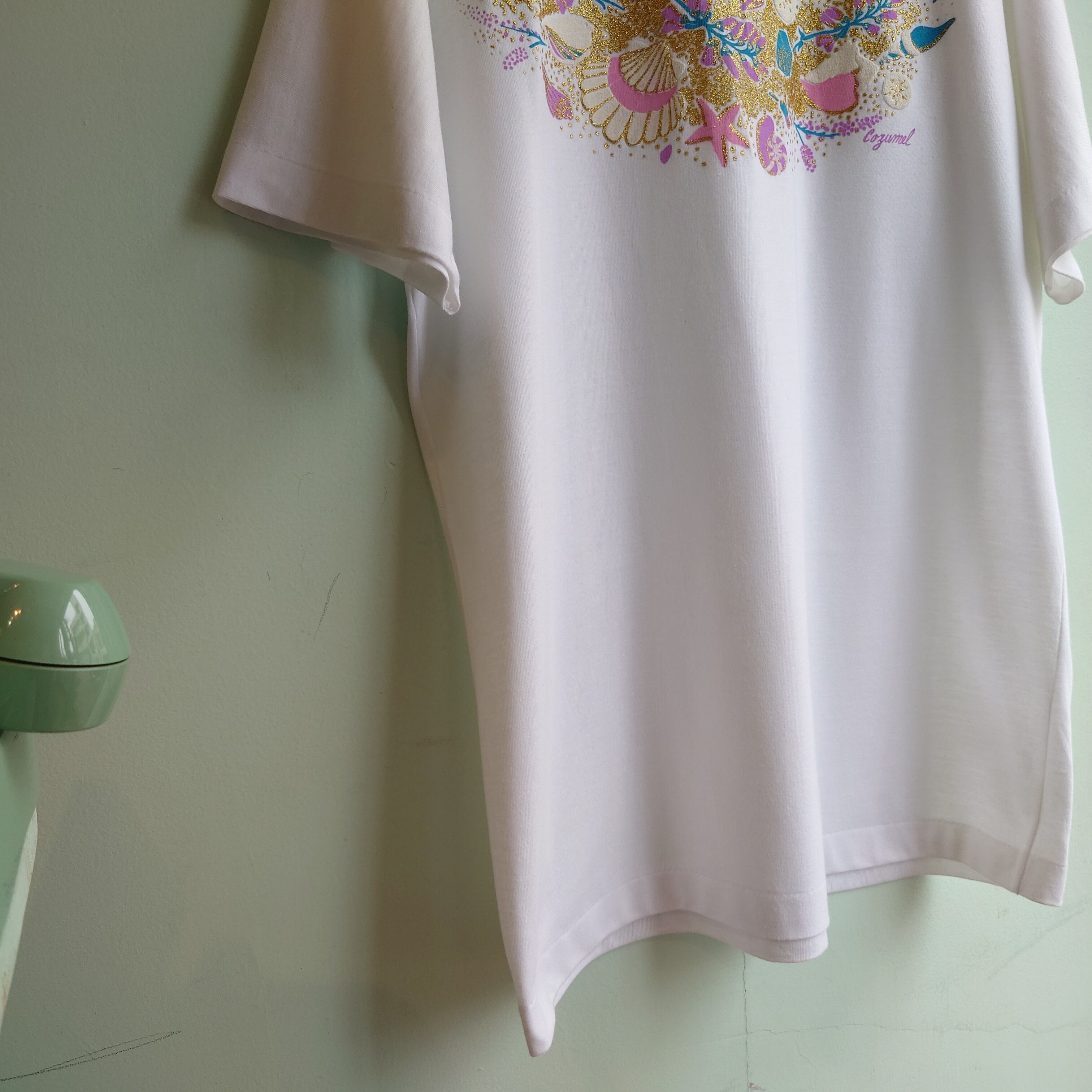 メキシコの人気リゾート、コスメルのヴィンテージスーベニアTシャツ。貝をメインにしたマリンなデザインは、ラメと凸凹感でデコレーションされたガーリーな雰囲気。