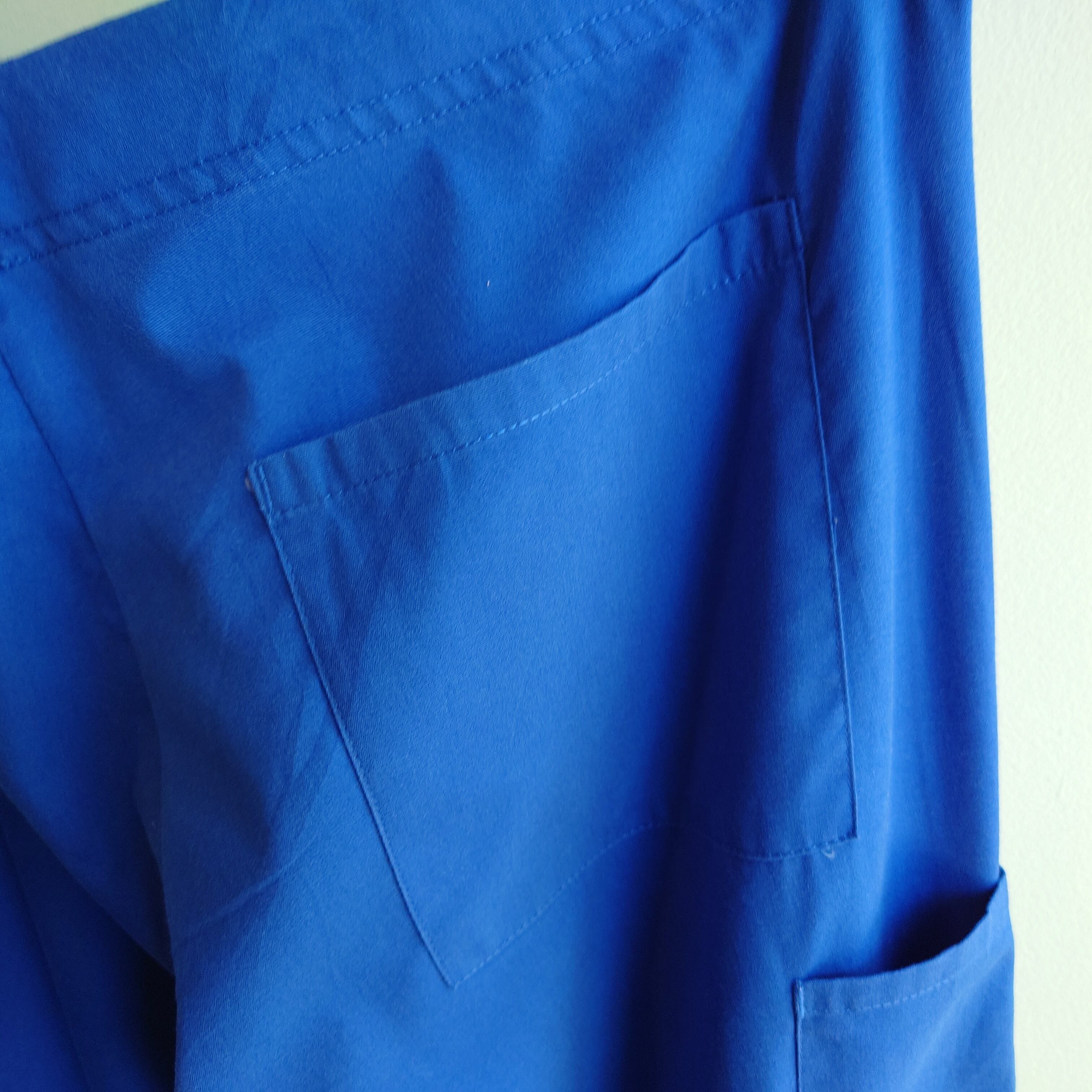 ストンとしたストレートシルエットと、スクラブらしい薄さが快適なメディカル系のイージーパンツ。レアなXSサイズ。サイドのカーゴポケットがワークライク。女子はドレスのインナーなどレイヤードにも。
