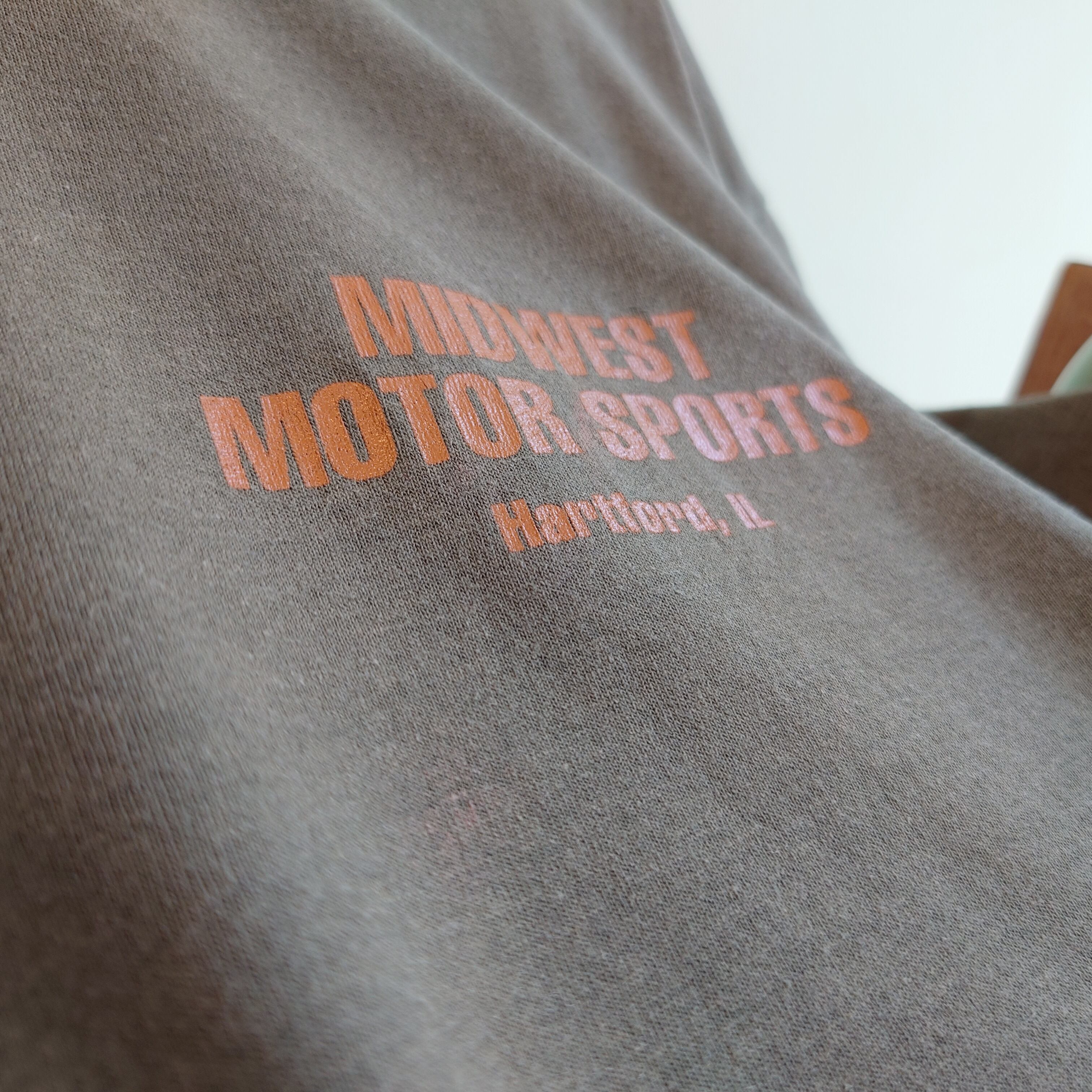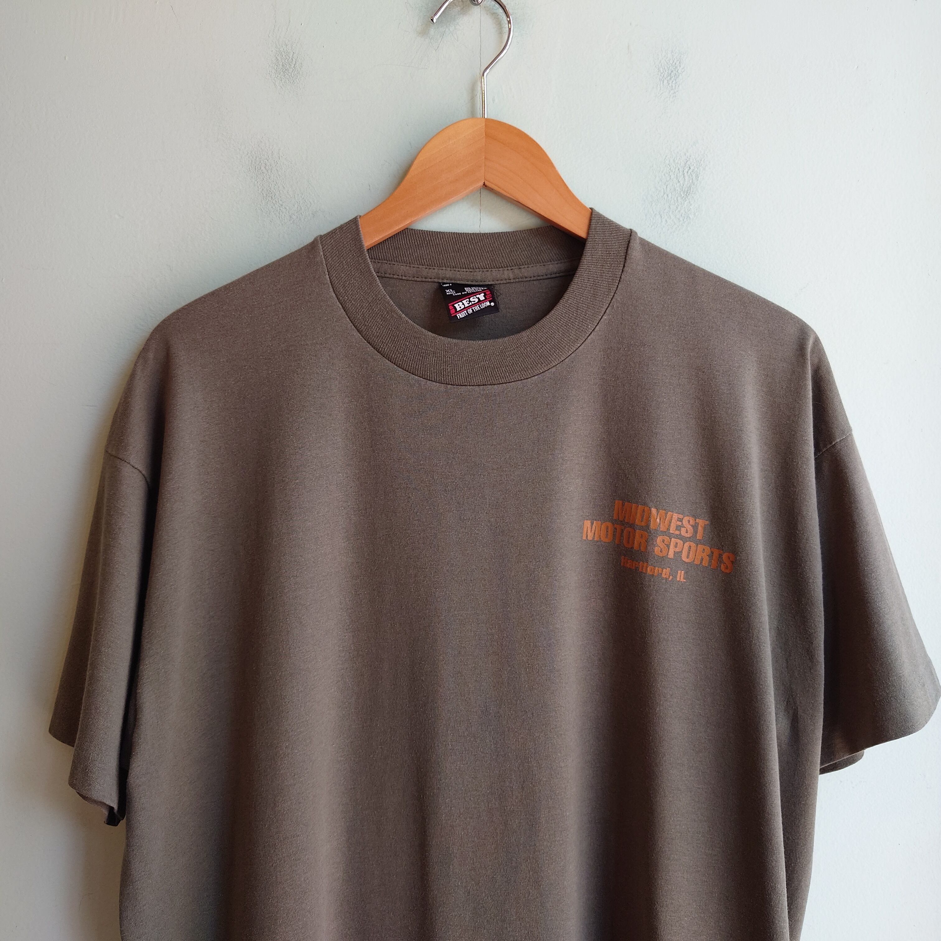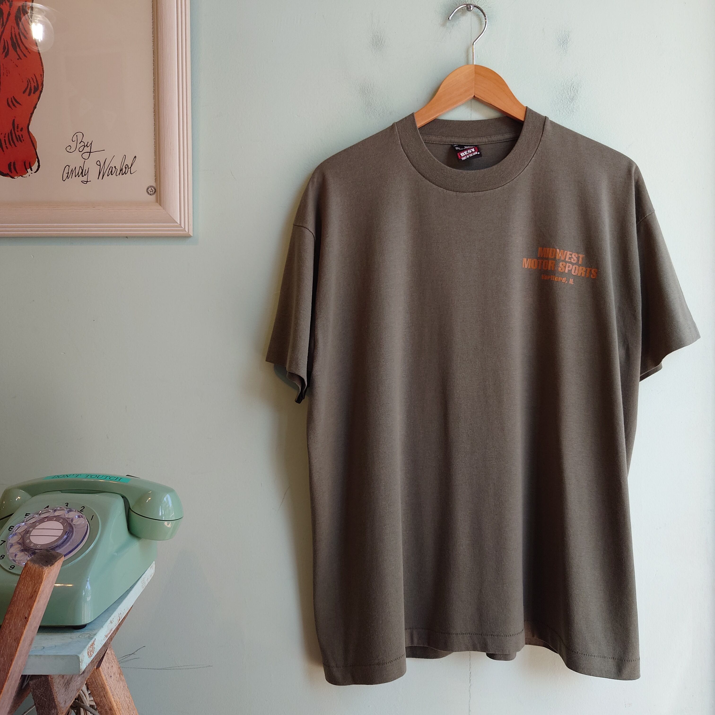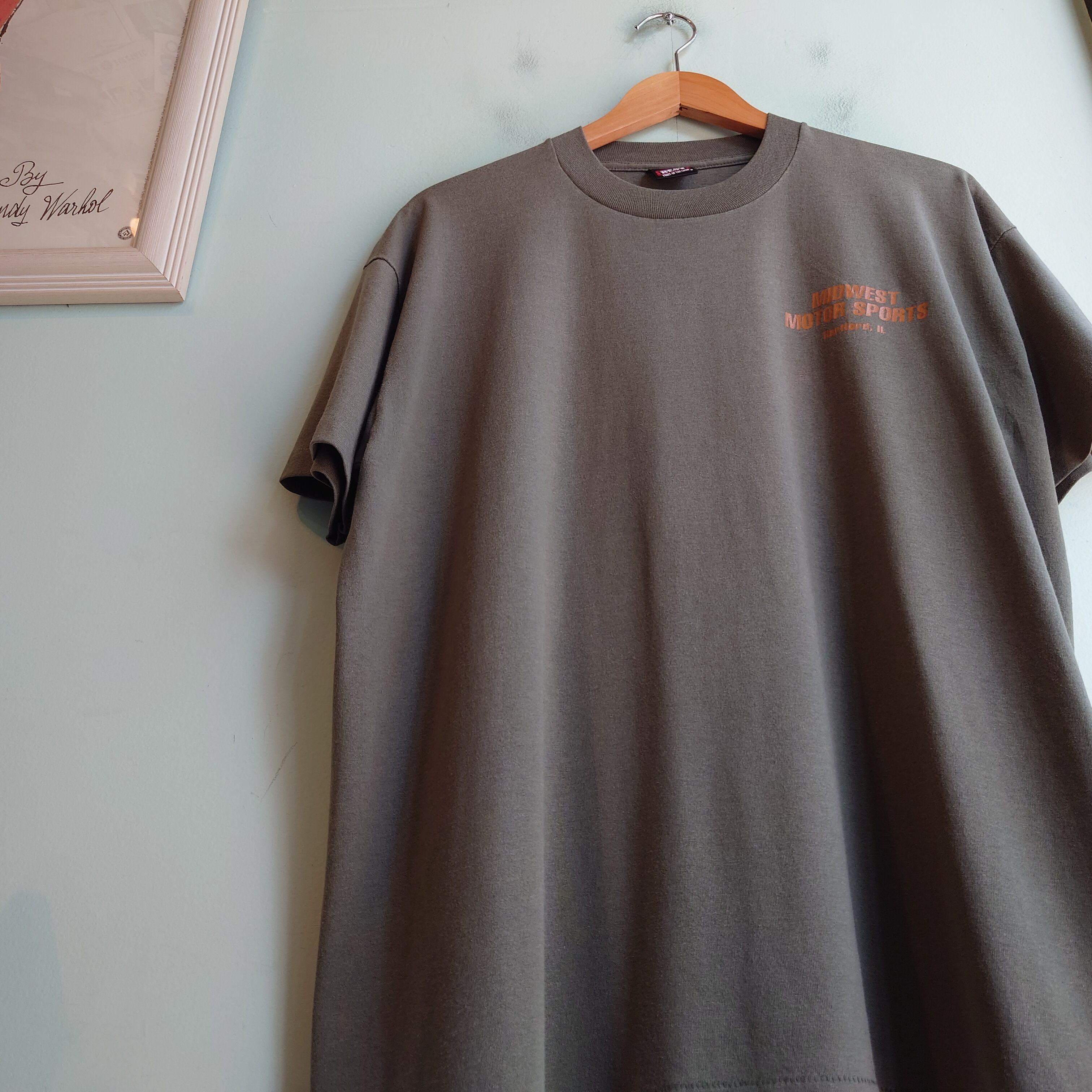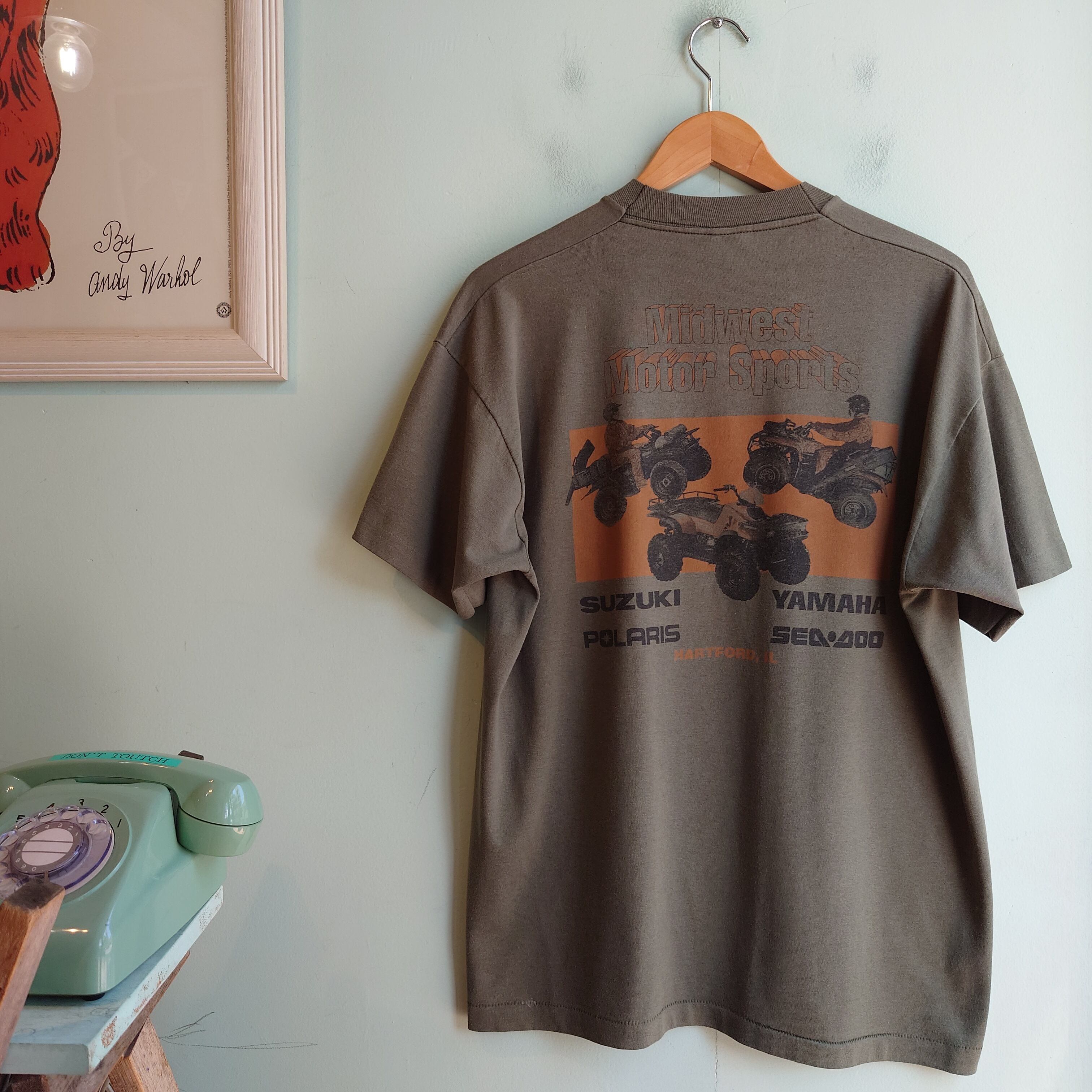 米国らしいレジャービークル四輪バギーのバッグプリントに惹かれる、カーキ色のヴィンテージTシャツ。ウィスコンシン州に現在も実在するディーラーのもので、SUZUKIやYAMAHAの逆輸入的なロゴも嬉しいポイント。ミリタリーライクな雰囲気も最高。