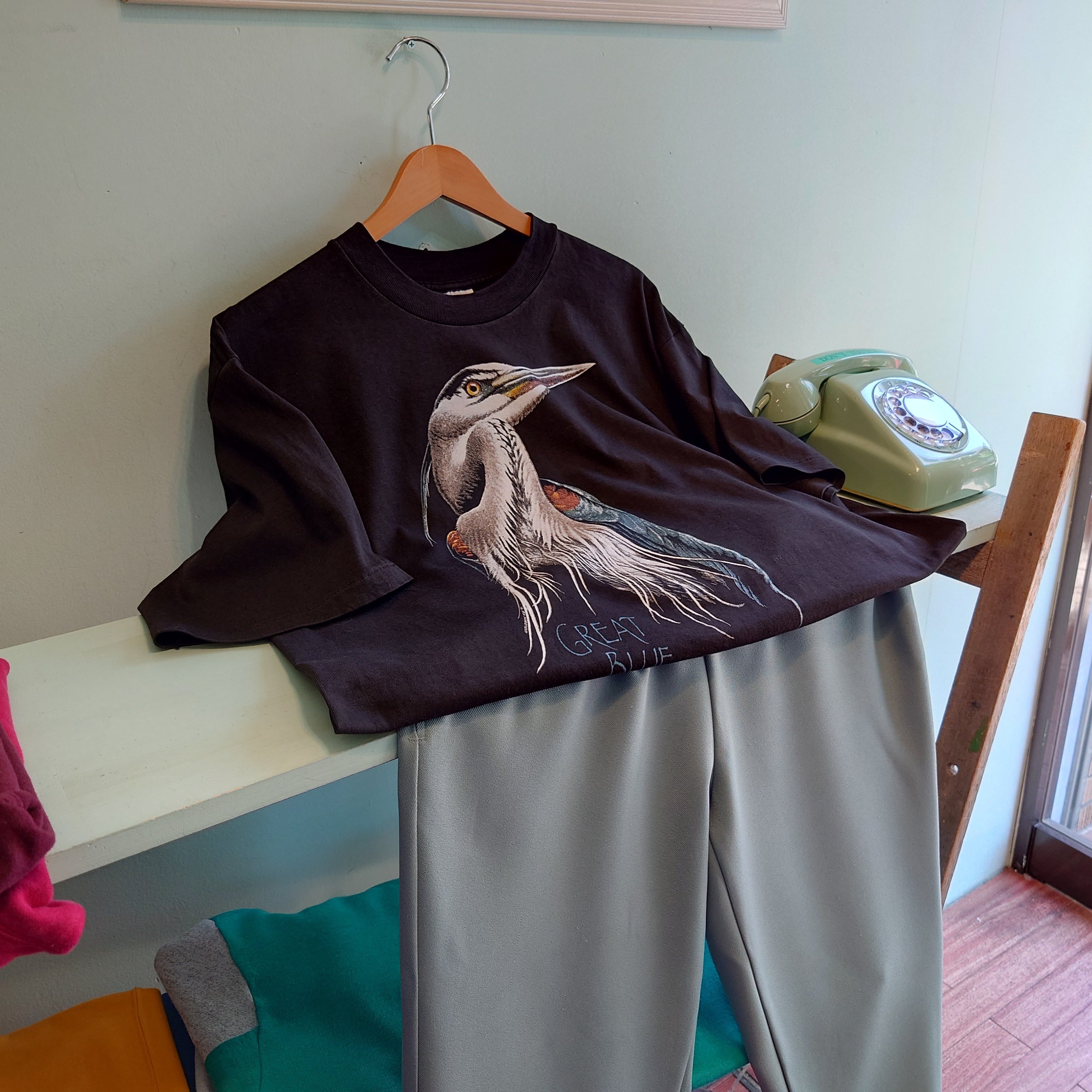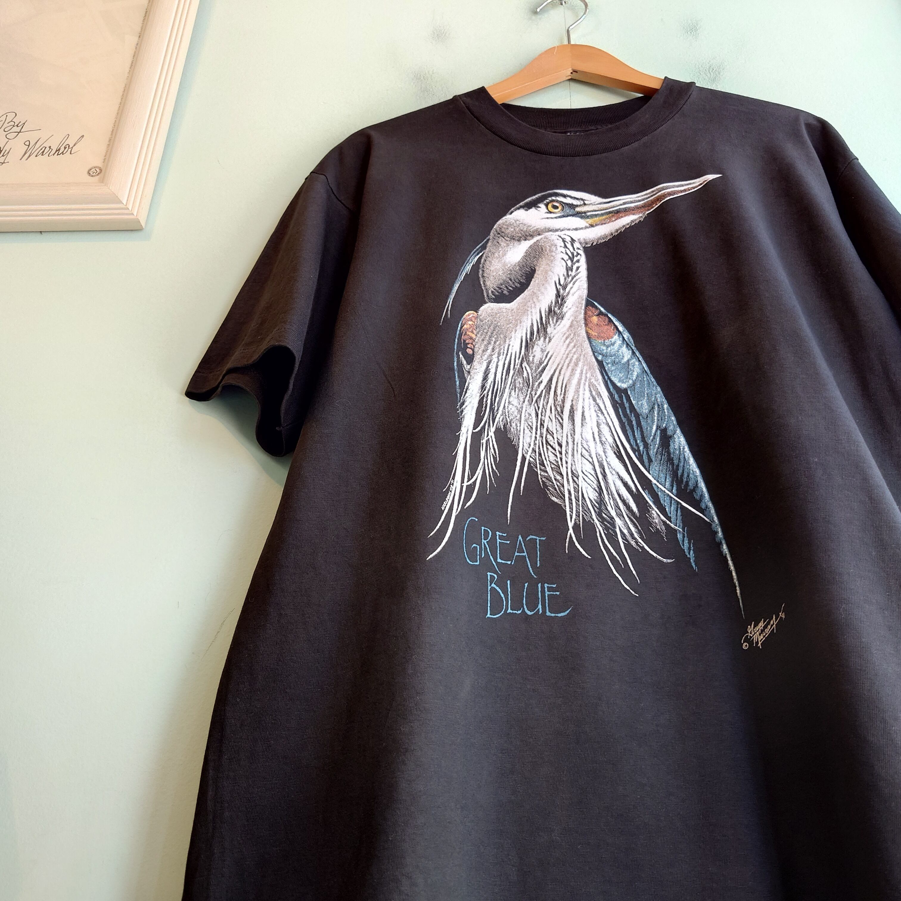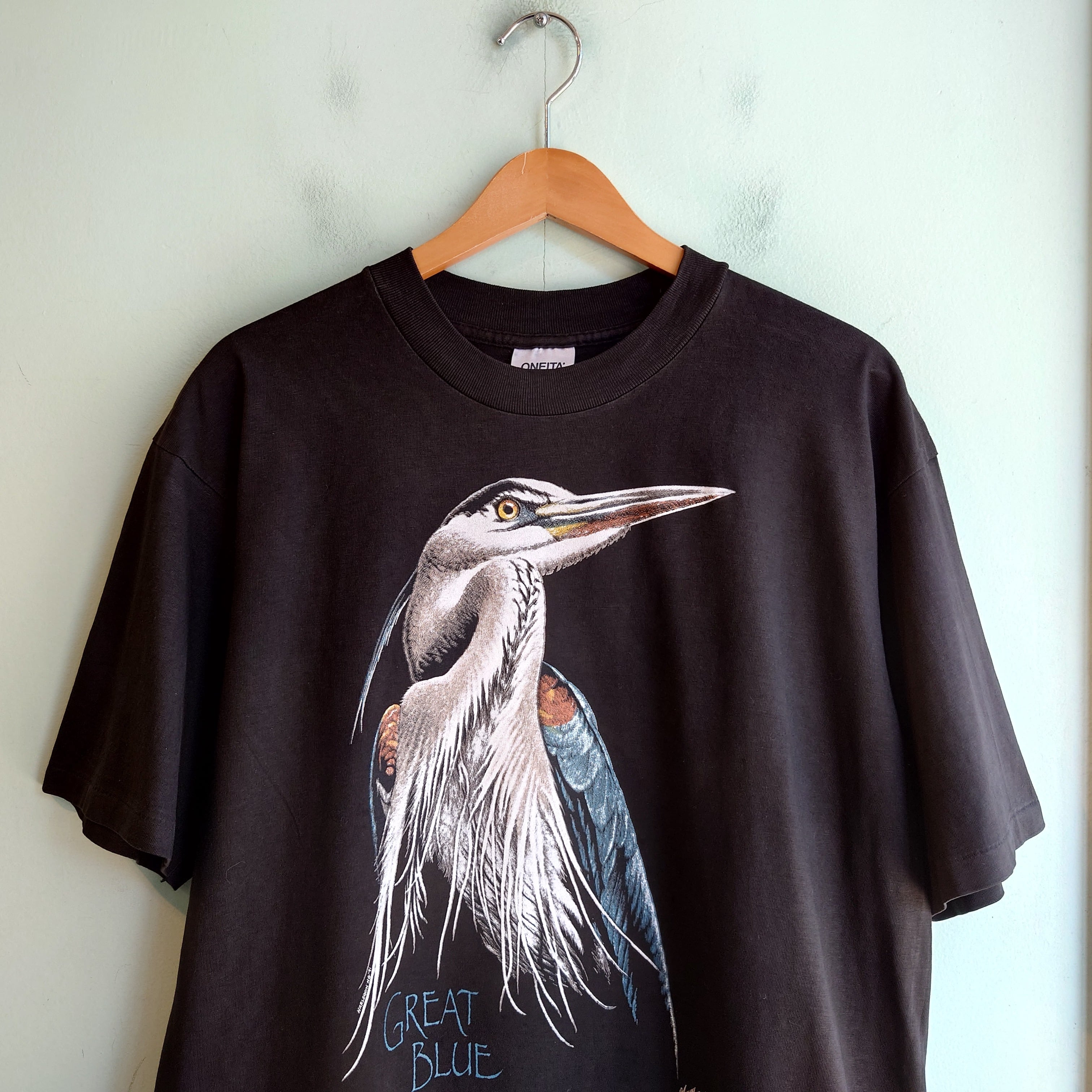 great blue こと、オオアオサギをモチーフにしたヴィンテージTシャツ。黒に繊細なプリントが際立つ、味わい深い一枚。雰囲気のあるONEITAのオールドボディーは癖がなく、ひと目でぐっと奥行き感があるコーデに。