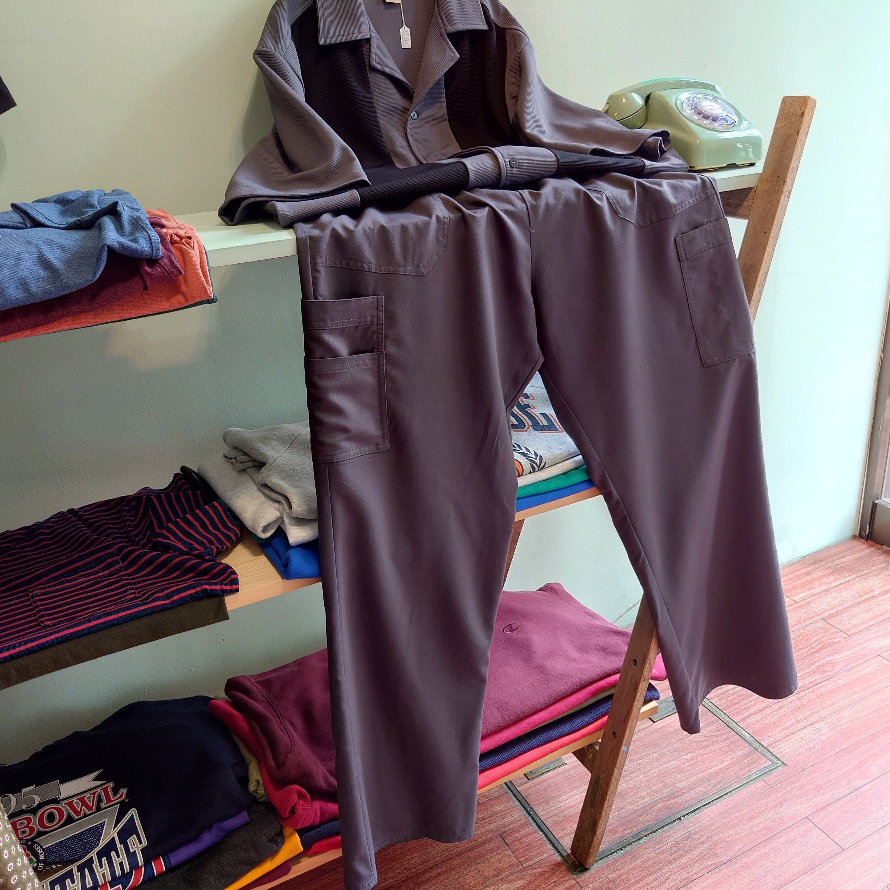 腰回りのバイカラーや、マルチポケットのディテールから、ユーロのギミックパンツのようなデザインが面白いメディカル系のイージーパンツ。ワイド感のあるフレアシルエットのルーズさも◎。ダークトーンながら、夏の快適さは折り紙付き。