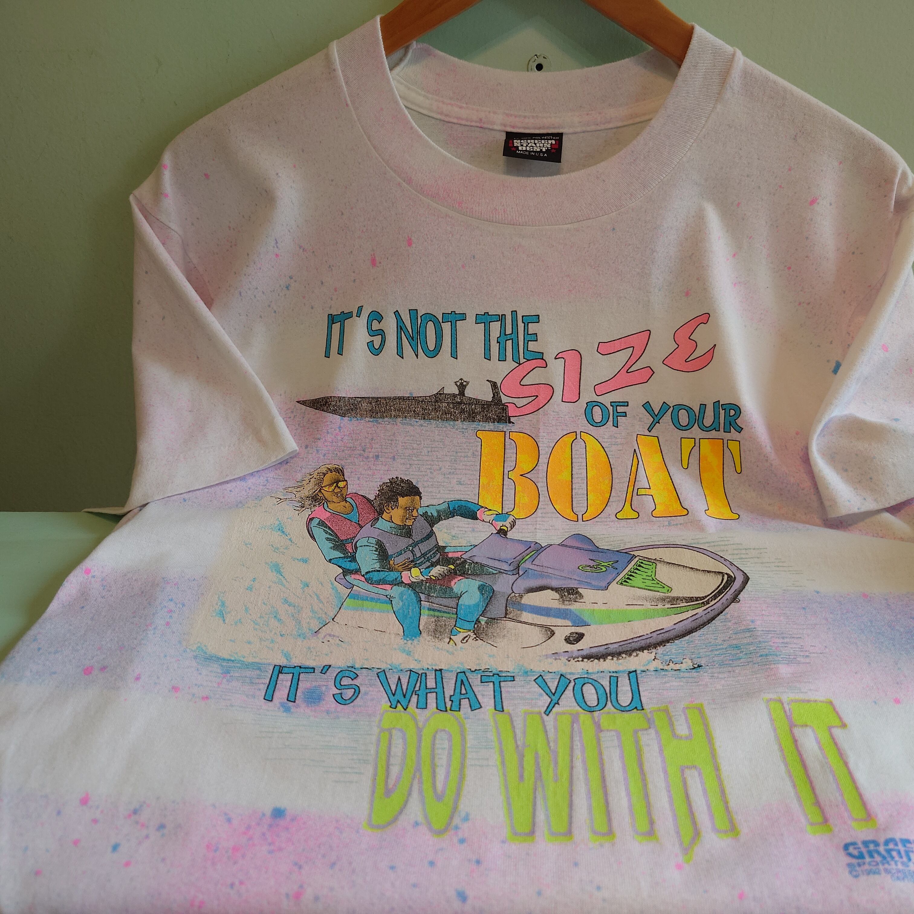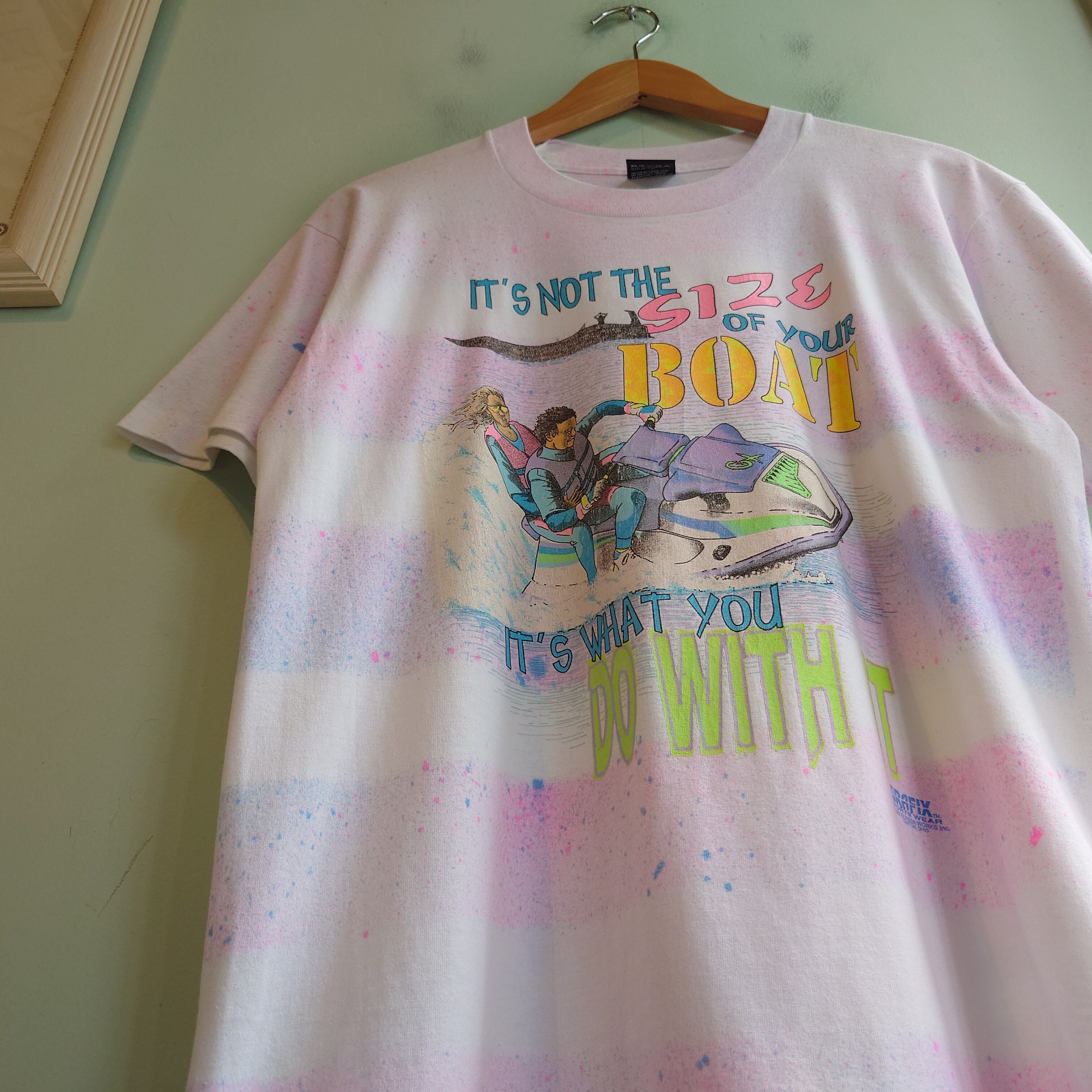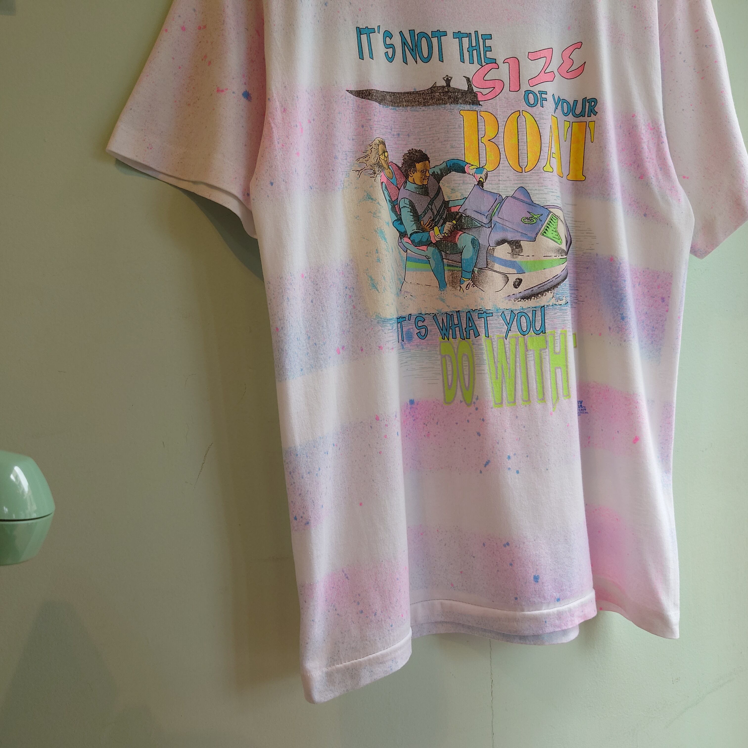 水上バイク、モーターボートをモチーフにしたヴィンテージTシャツ。90年代らしいパステルな色付い、ボーダー状に入るスプラッシュが最高にかっこいい。味わいあり、可愛さあり、非常にデザイン性の高いアイテムです。