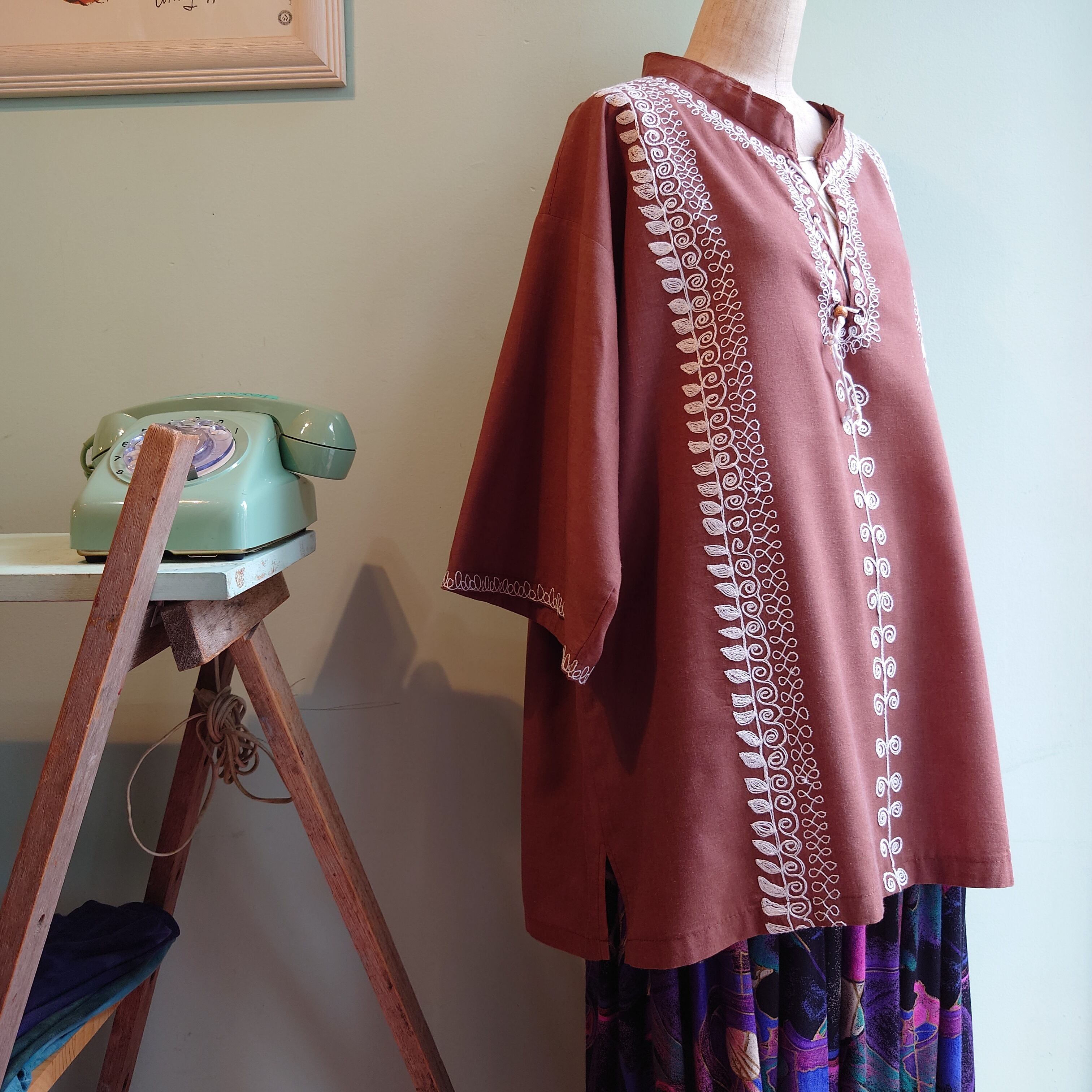 ガーゼのような柔らかい生地にチョコレートカラーが珍しいバティック系のプルオーバーシャツ。メキシカン系デザインに、ほんのりチロルな雰囲気が漂うアイテム。ユニセックスな雰囲気でひらひら着こなせる、かぶらない1枚。