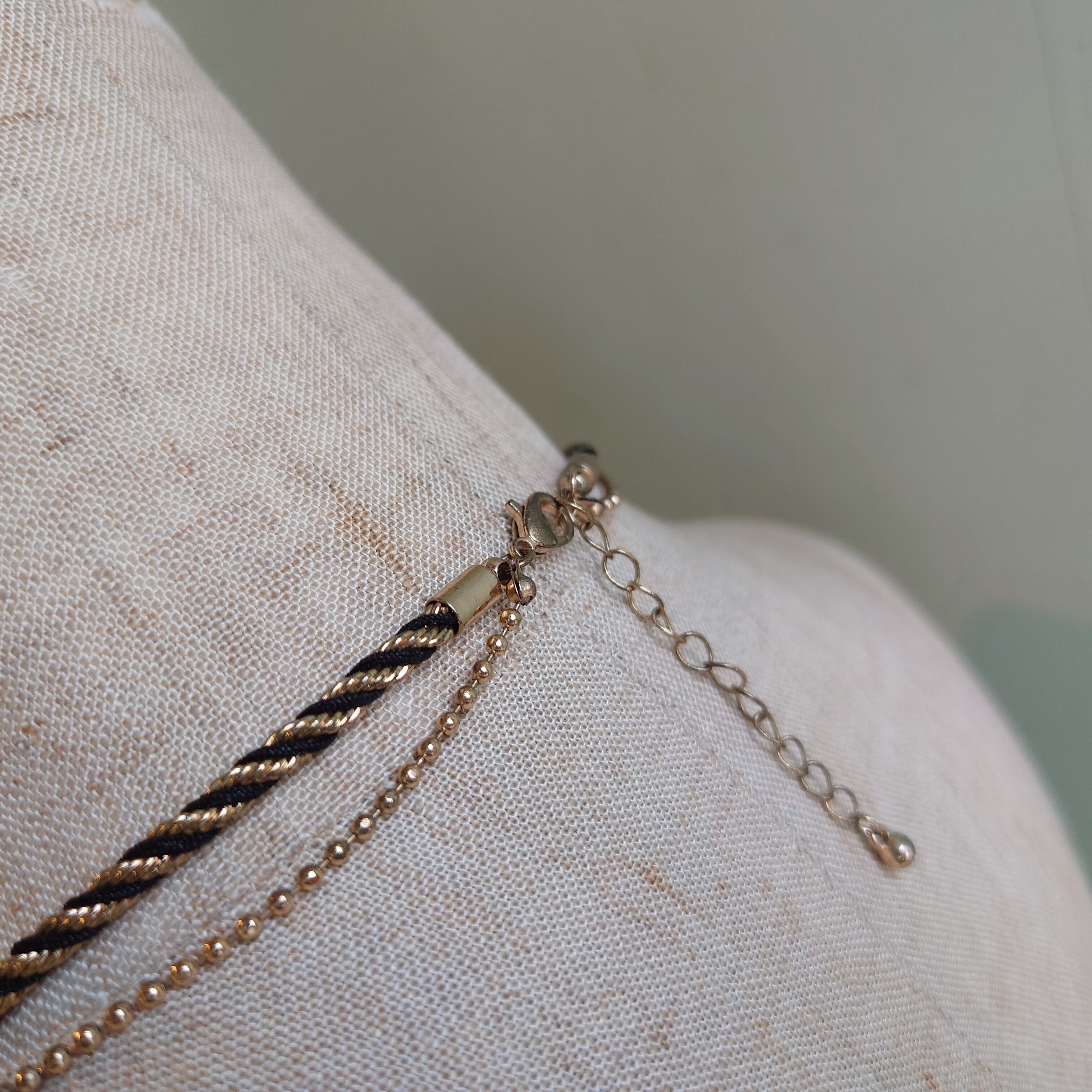 ボールチェーンタイプと、ツイストタイプのネックレスがドッキングした、コンビネーション系のチェーン。ゴールドながら渋い光沢と、ブラックの入り方で大人っぽく合わせられる。ユニセックスで使い回せる雰囲気。