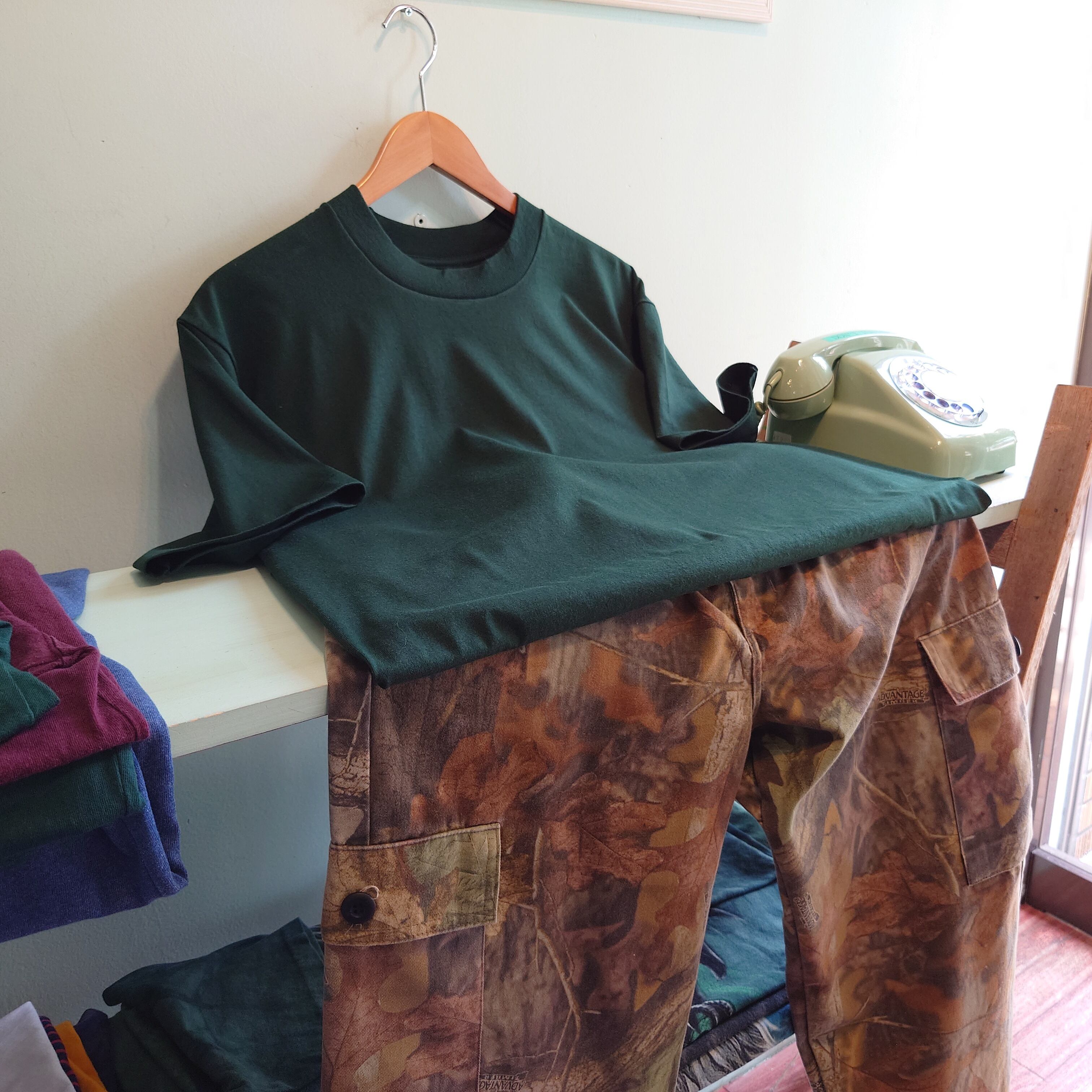 素直なシルエットと古着らしいしっとりとした着心地を両立した、ザ・いいボディーのフルーツ。こちらはプリント無し、ダークグリーンの無地。よりシルエットの良さが際立つのはもちろんのこと、全く頼りなさを感じない存在感。いい無地Tをお探しのお客様へ。