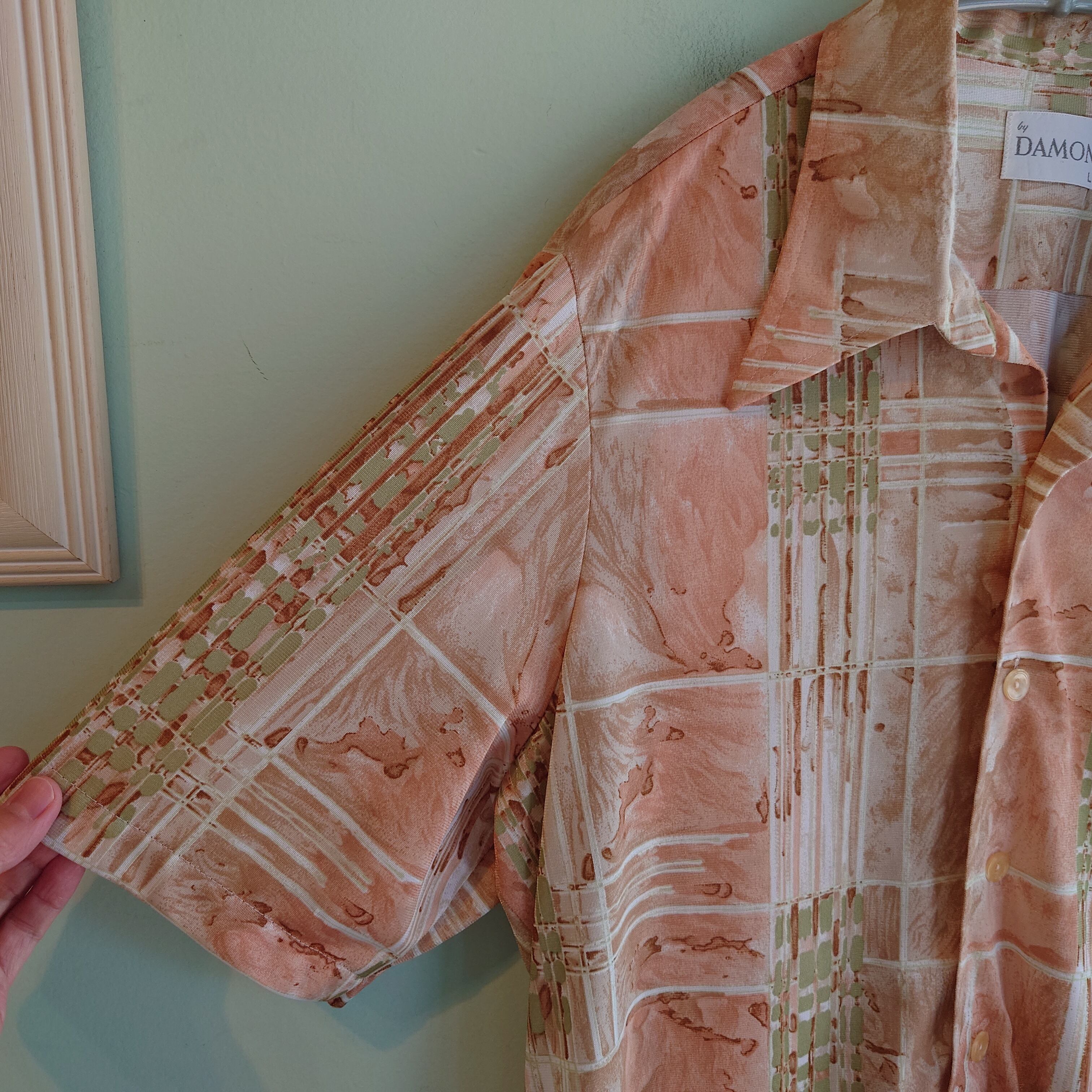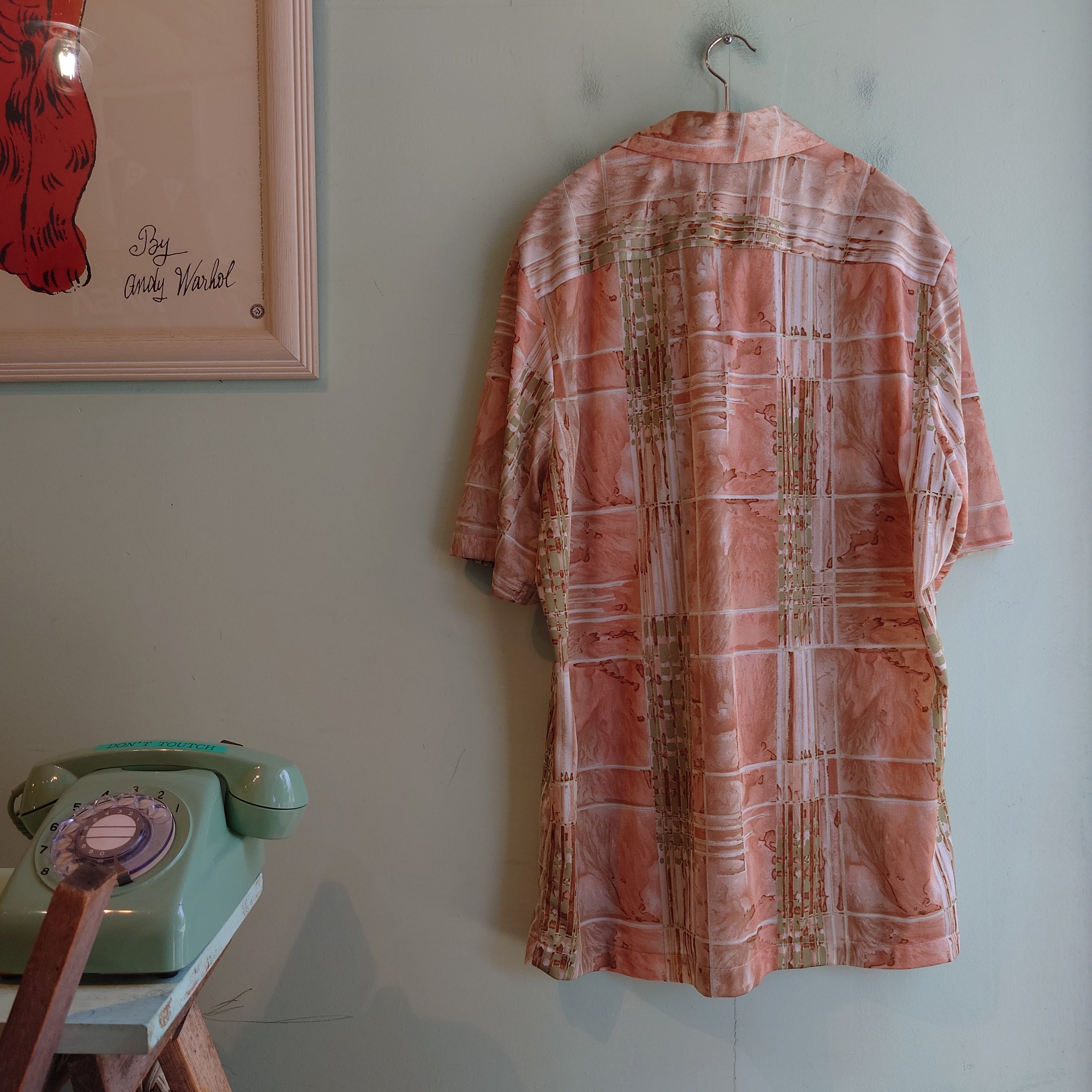 ★レトロなタイルにも見えて、絵画的にも感じる、アートライクなマーブルに惹かれるスタプレ系シャツ。サーモン系からミントグリーンに変化する、独特な色使いはこのシャツだけの世界観。70年代らしい個性が光る1枚。