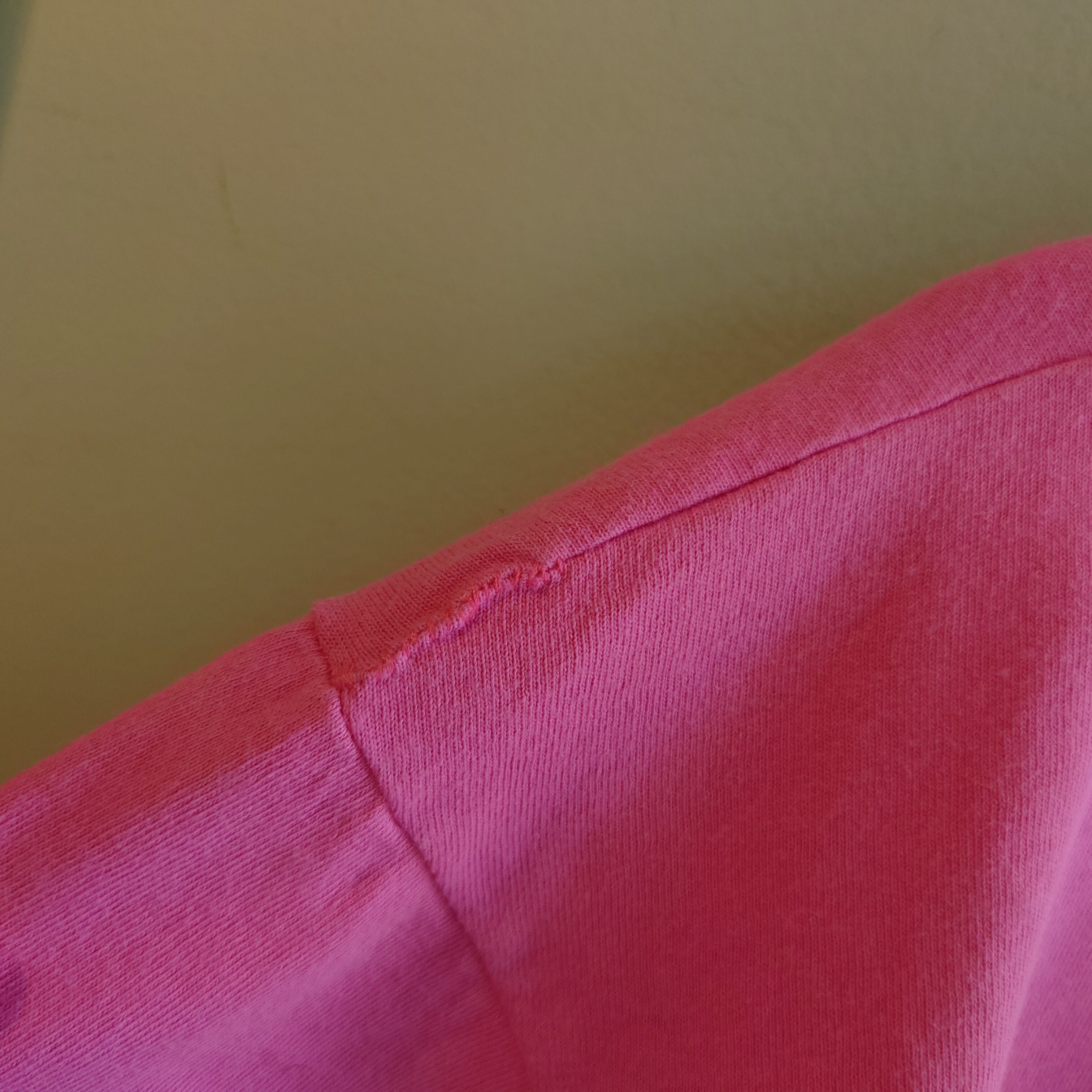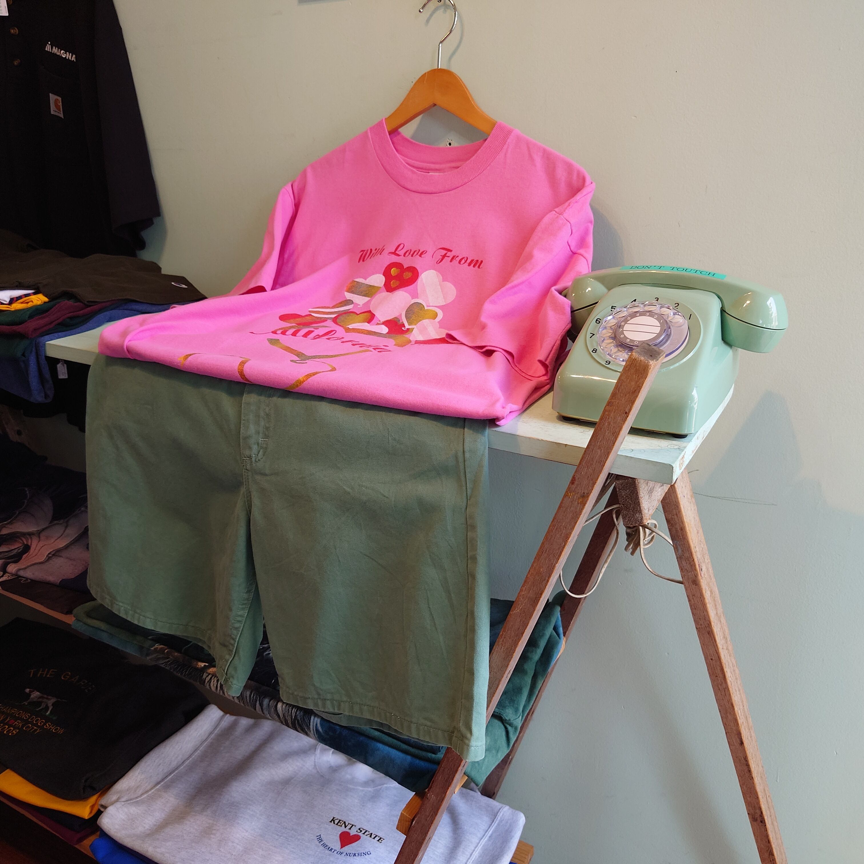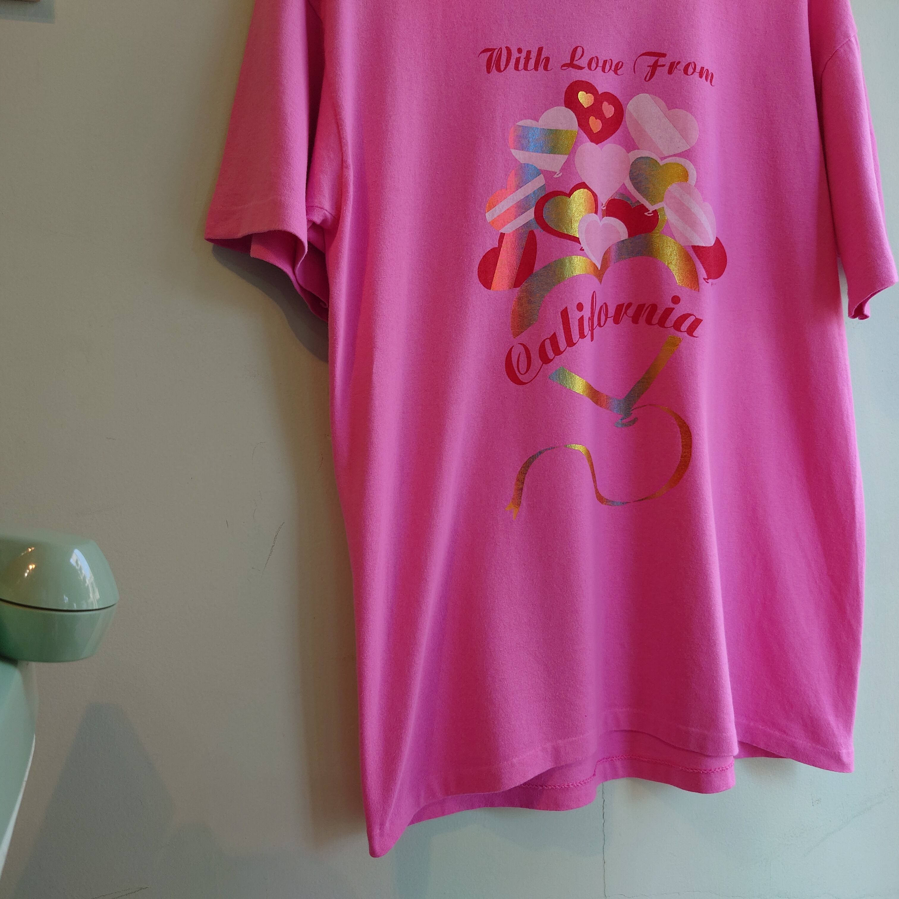 ラメとハート、ガーリー要素強めが珍しいカリフォルニア州のスーベニアTシャツ。まったりしたピンクに、オーロラのような色合いのラメ。ナチュラルな風合いのコットン、しっかりT字を描くいいシルエットもおすすめポイント。