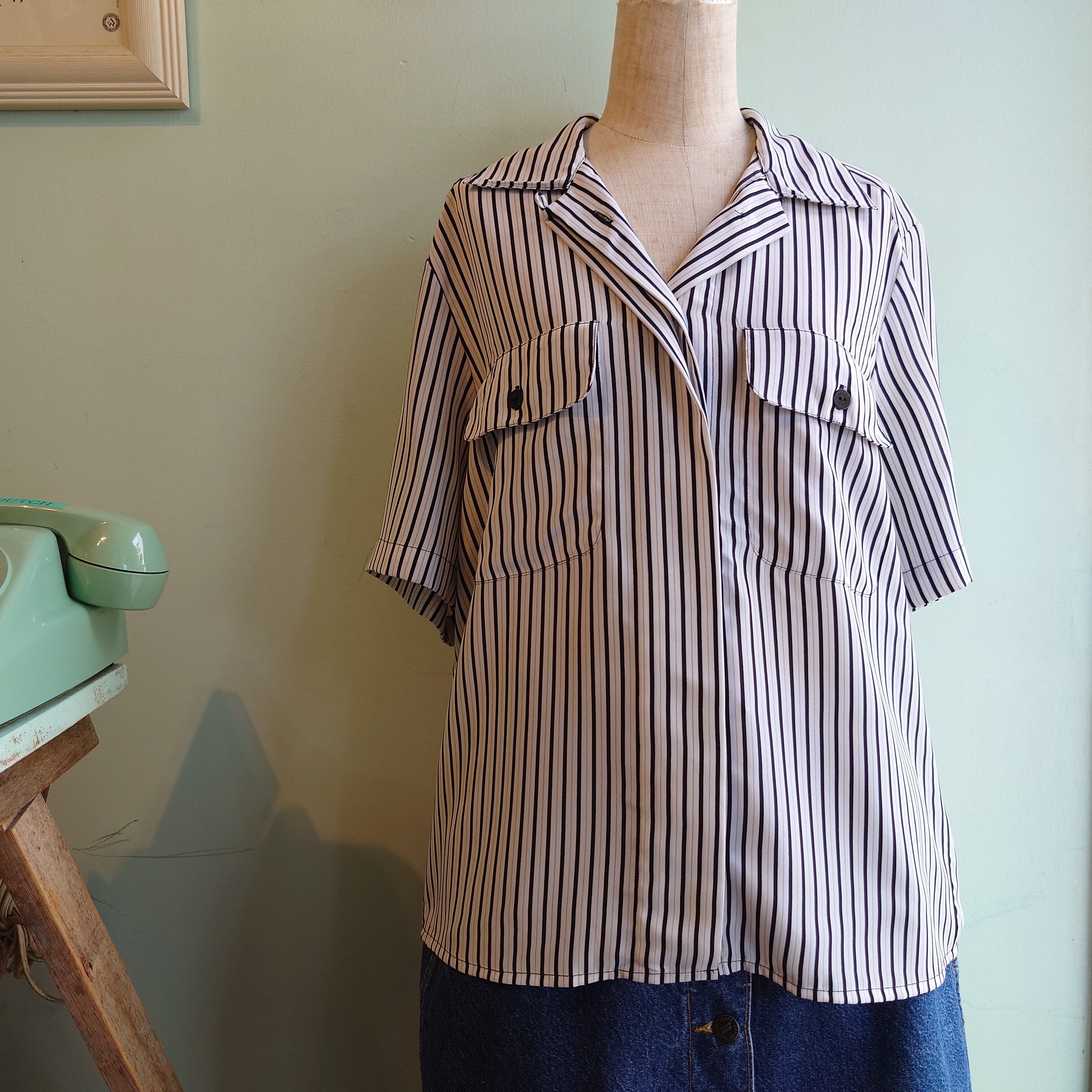 ワイド&ショートな丸みのあるシルエット、比翼あわせと襟周りがかわいいオールドブラウス。濃紺、白、グレージュのシンプルなストライプも、レディースらしいポイントでしっかり主張する1枚。