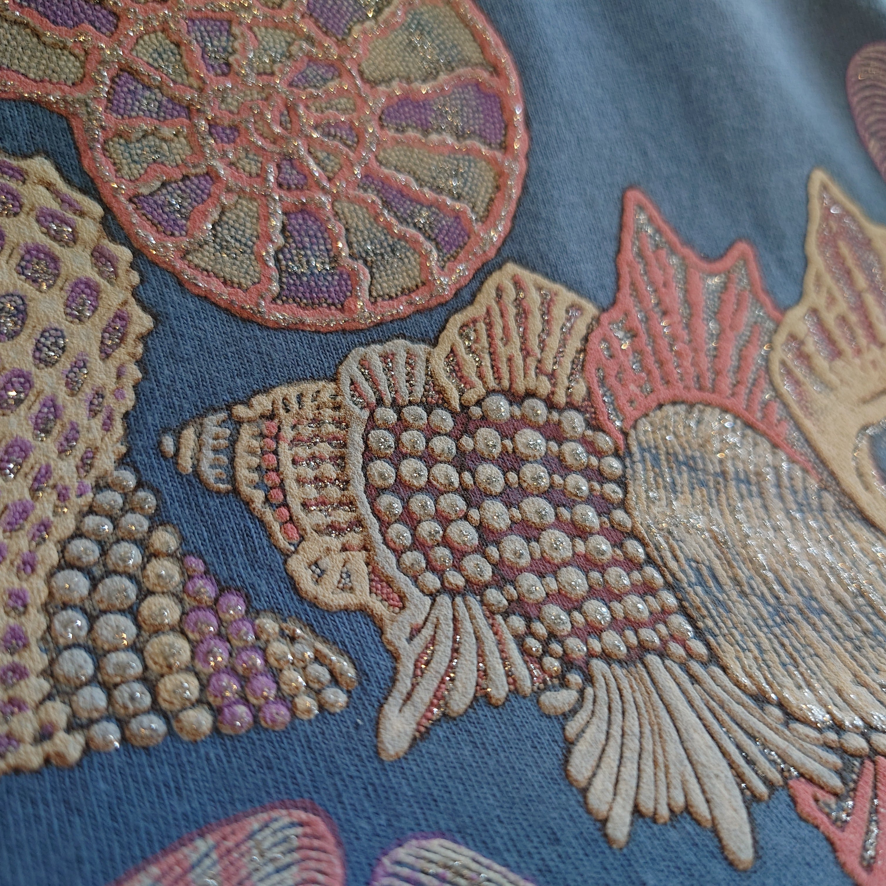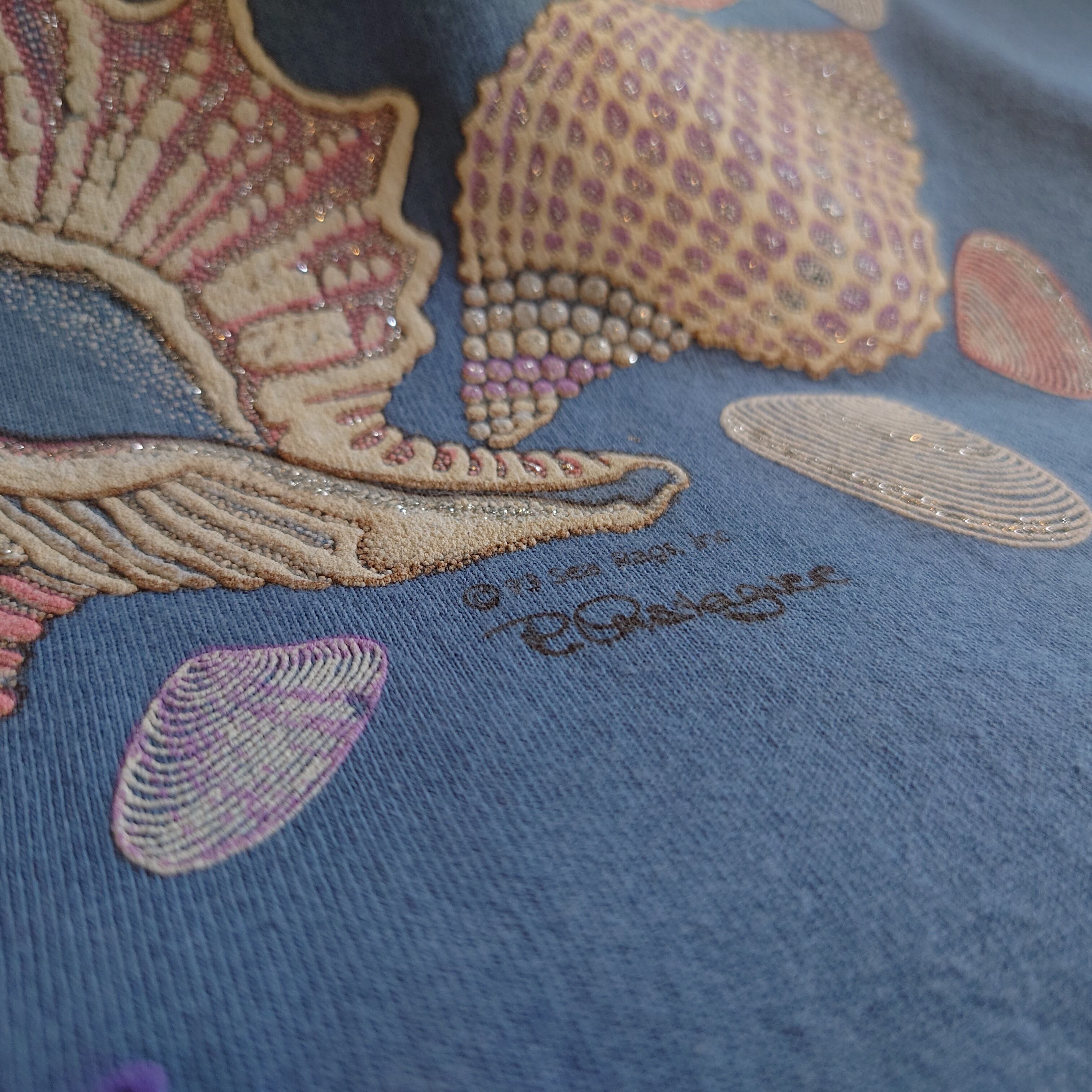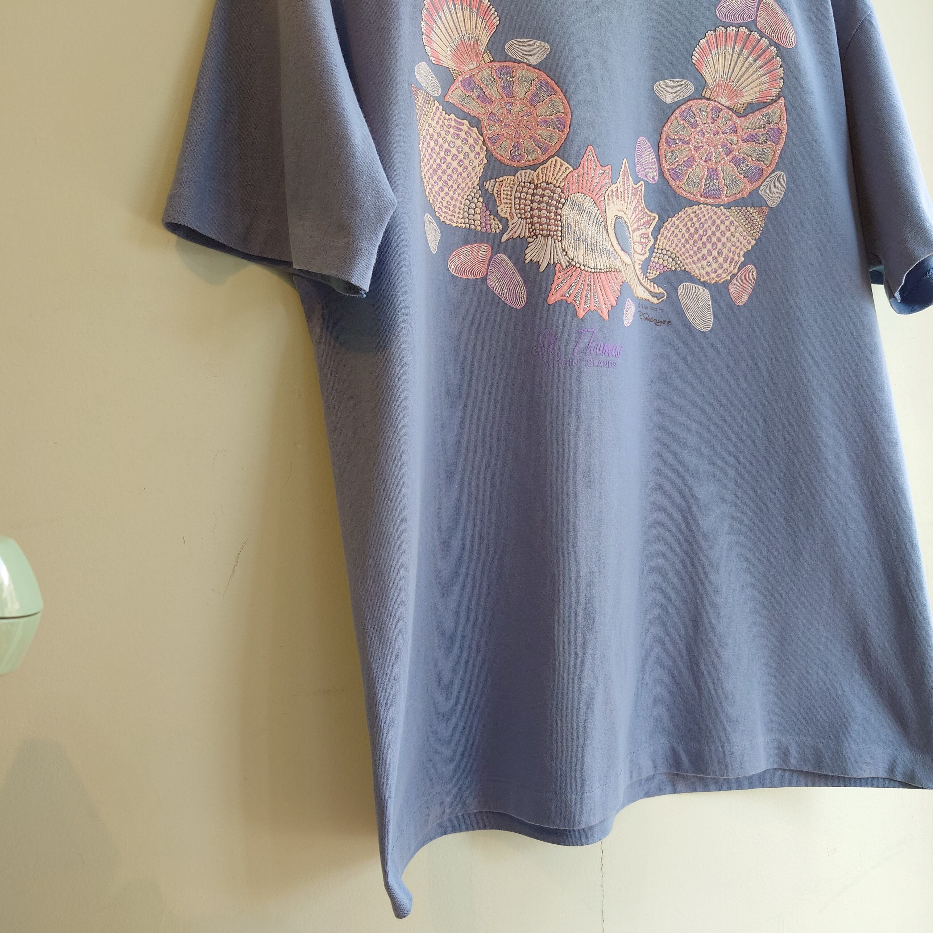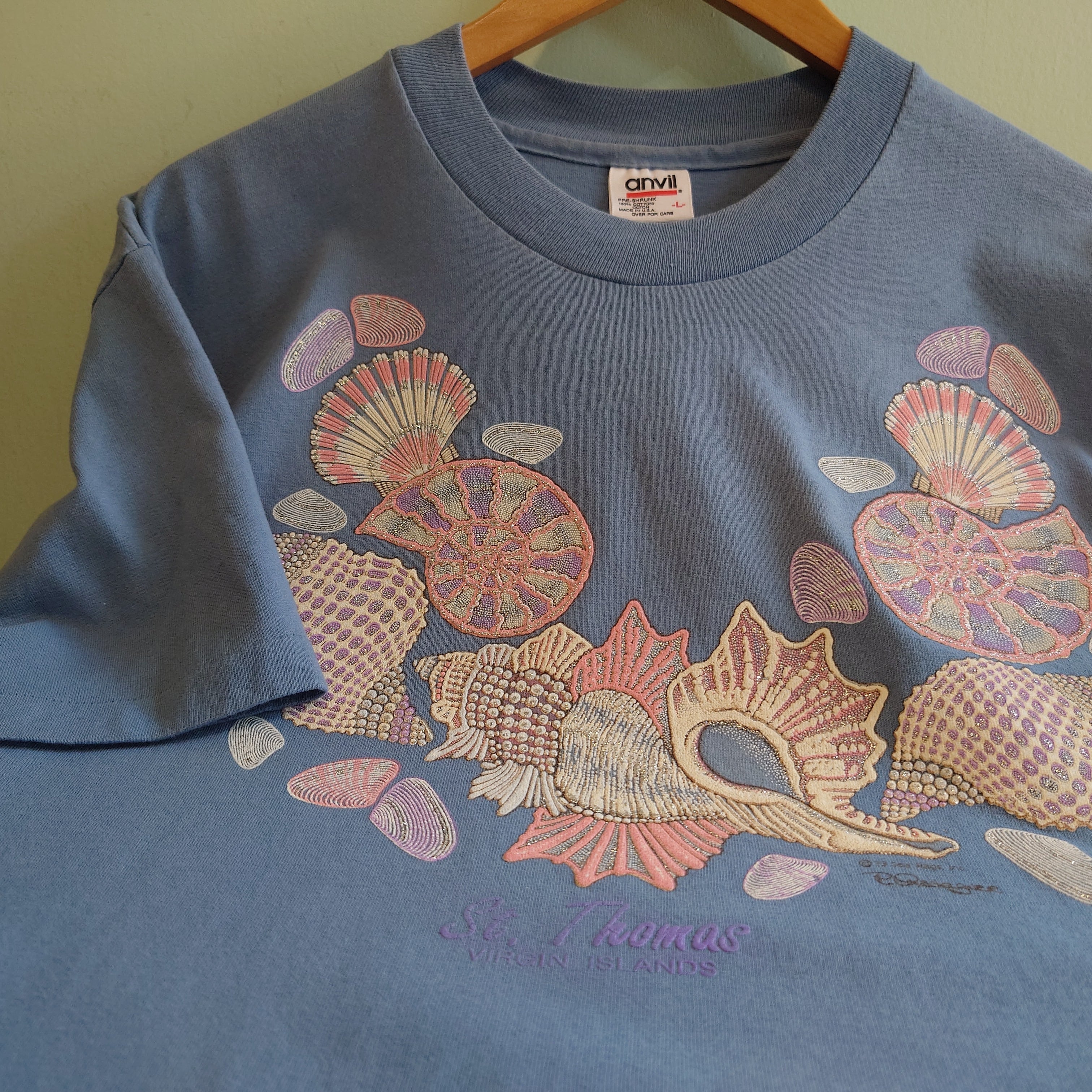★ラメの入ったが貝殻をモチーフにした、デコレーション系のスーベニアTシャツ。アメリカ領セントトーマス諸島のリゾート系ながら、トロピカルよりもドリーミーよりの淡い色合いが美しい。くすみ系ブルーグリーンのボディーはあわせやすさも抜群。