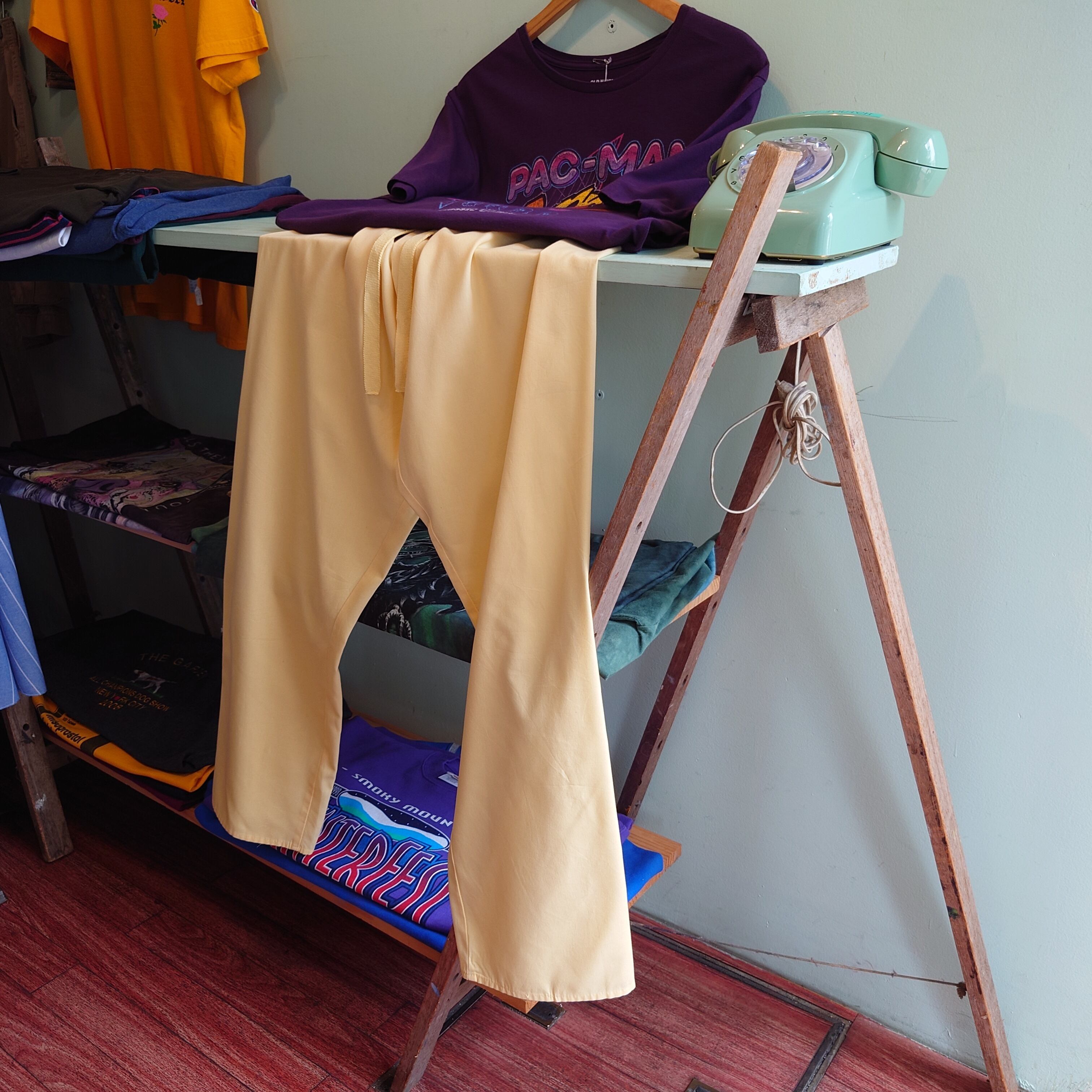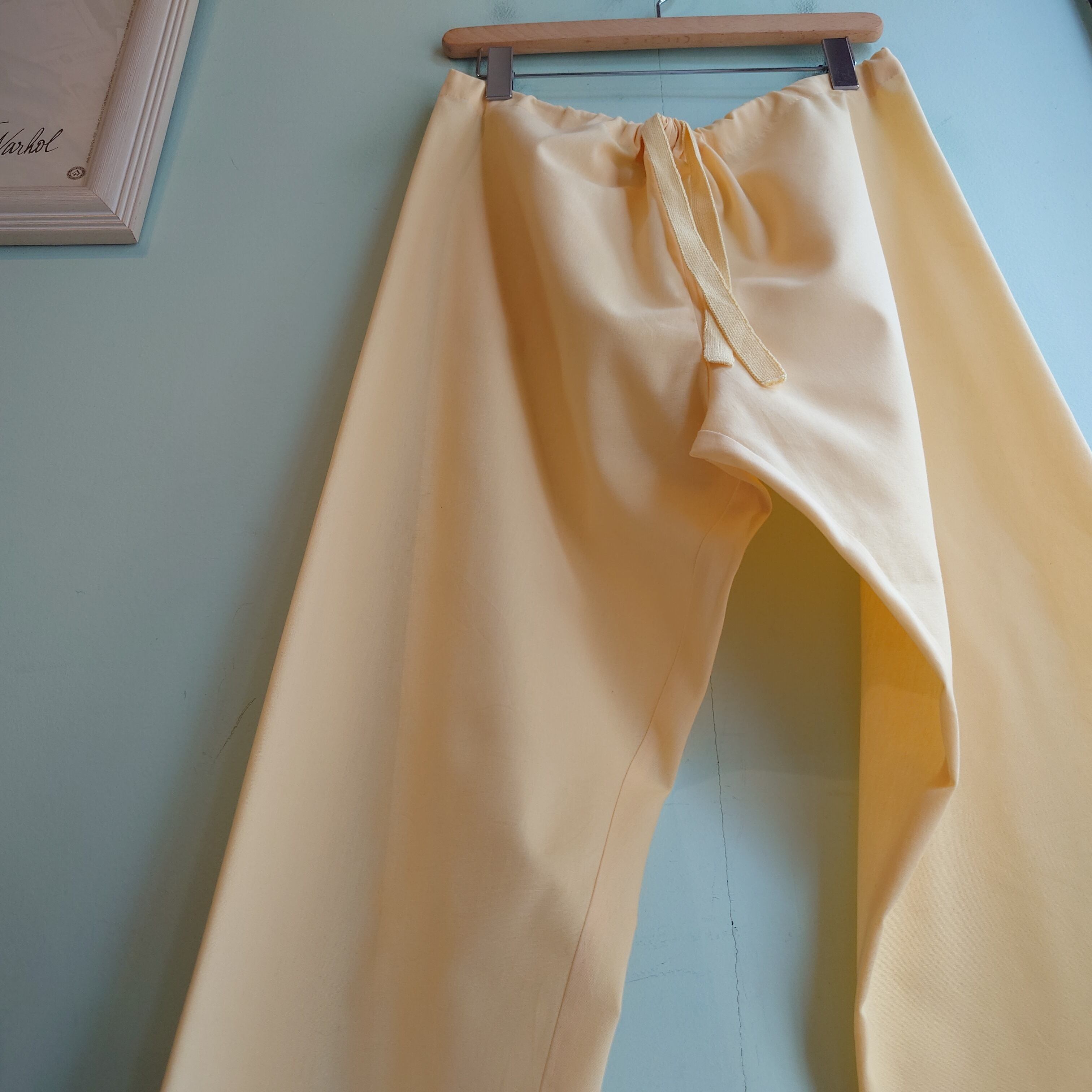 実際に米国で使われていたスクラブのイージーパンツ。メディカル系では珍しいイエローで、カラフルかつ爽やかな一本。紐でぎゅっと絞って履きこなすイージーパンツタイプで、涼しさ、ラフさが夏に心地よい。こちらはややテーパーよりでイージーパンツ感強めなシルエット。