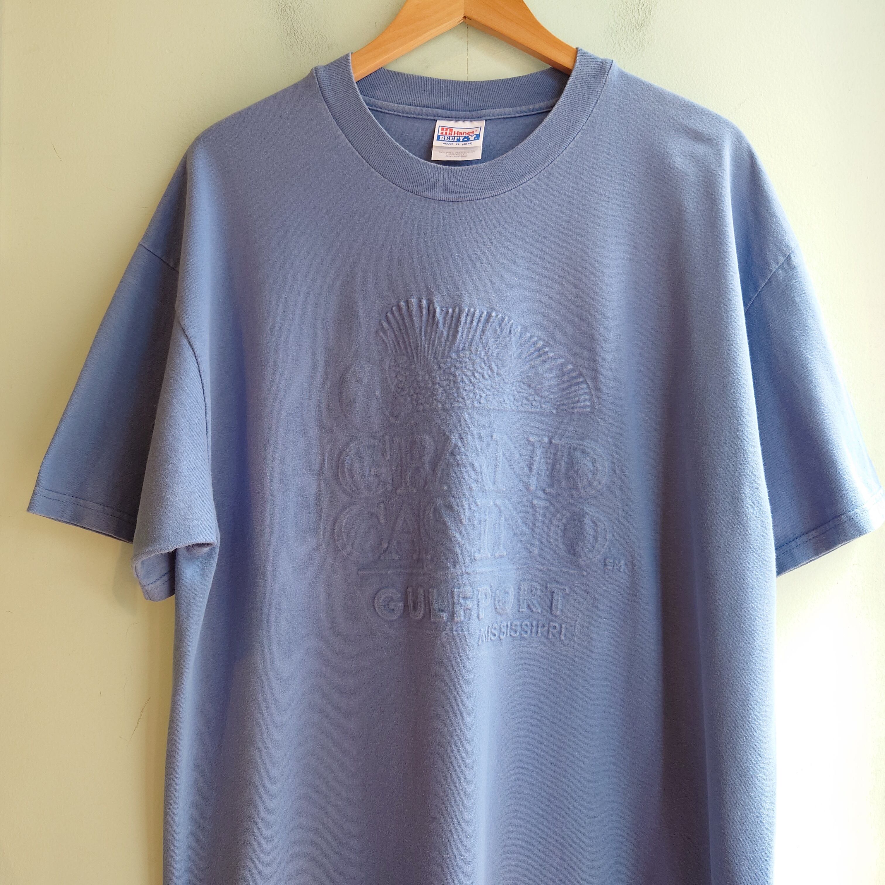 ミシシッピ州に実在するカジノリゾートのヴィンテージ・スーベニアTシャツ。プリントや刺繍ではなく、素材に凸凹に加工されたエンボス仕様がレアな1枚。ブルーグレーのあわせやすさもおすすめポイント。人とは違うヴィンテージTシャツをお捜しのお客様へ。