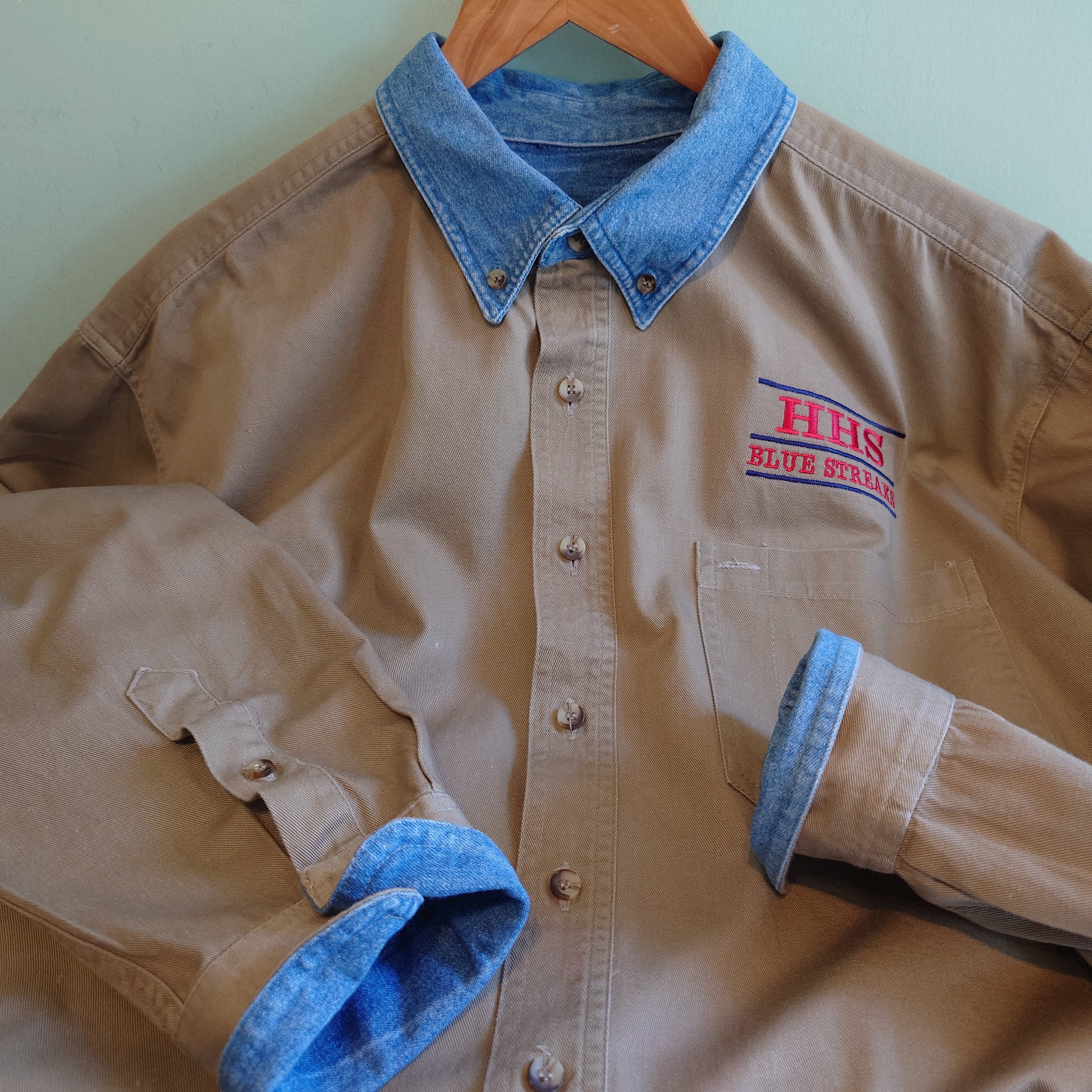 ◎aspen gold 90-00s ワーク/カレッジ バイカラーシャツ ワークシャツ ツイル デニム ベージュ L