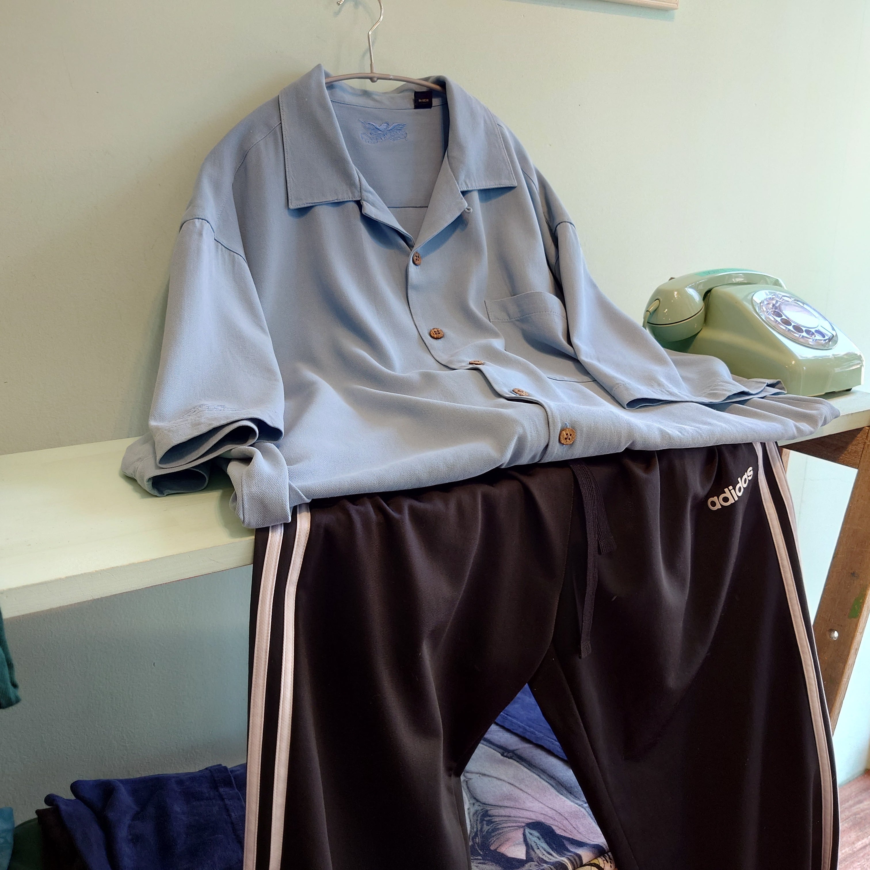 クタッとした柔らかさがドレッシーなオープンカラーシャツ。やや退色感のあるアクアカラーは渋めで、表面にツイル風の柄が入って、単色ながら雰囲気あり。袖にはカントリークラブのロゴ入り、ワーク系ニュアンスもあるアイテムです。