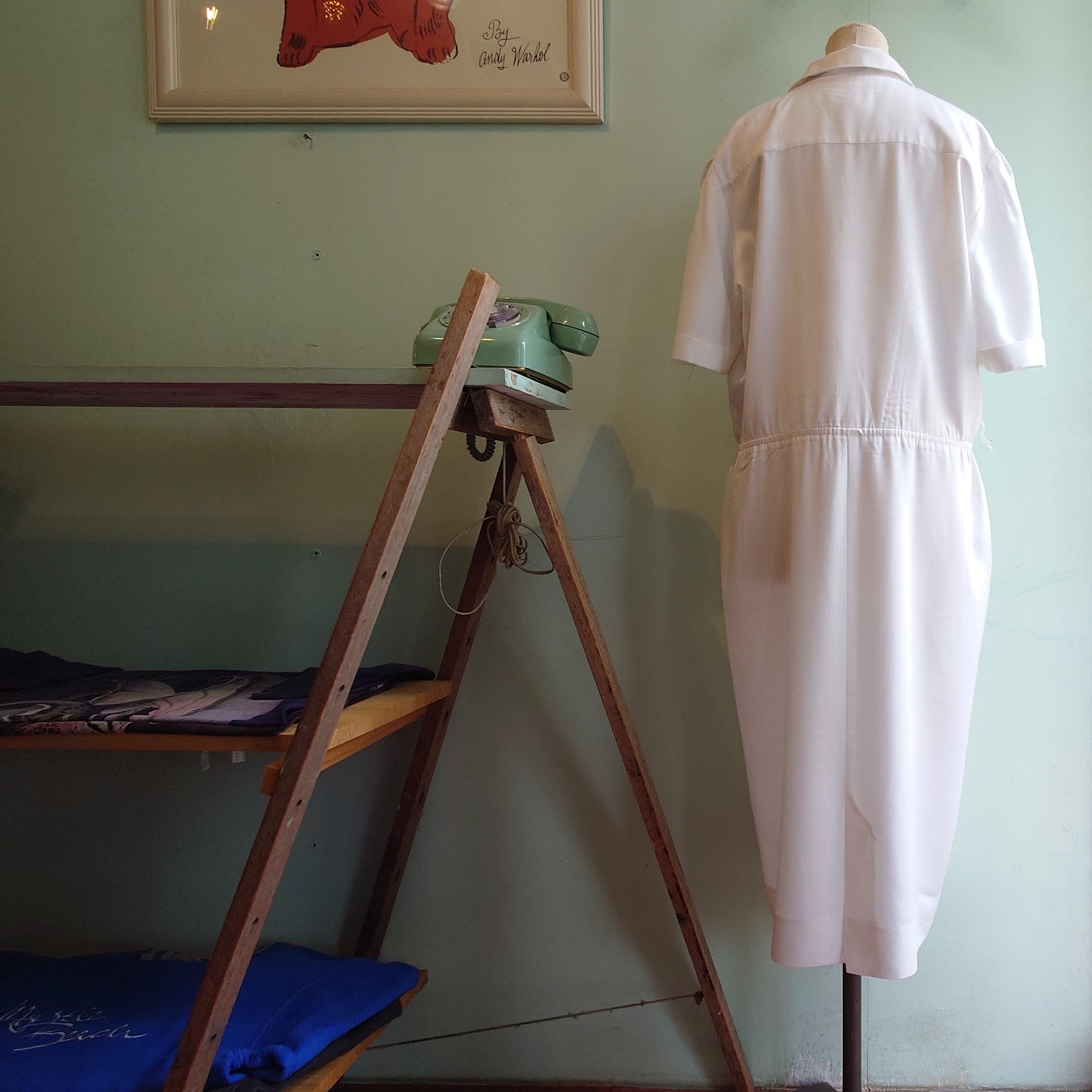 ダブルのジャケットのようなトップが80s らしい、プルオーバースタイルの白ワンピ。ゆるいシルエットながら、ウエストに絞りがないのもこの年代としてはレア。ナチュラル一辺倒にならず、ほんのりアクの強さが逆に可愛いホワイトです。