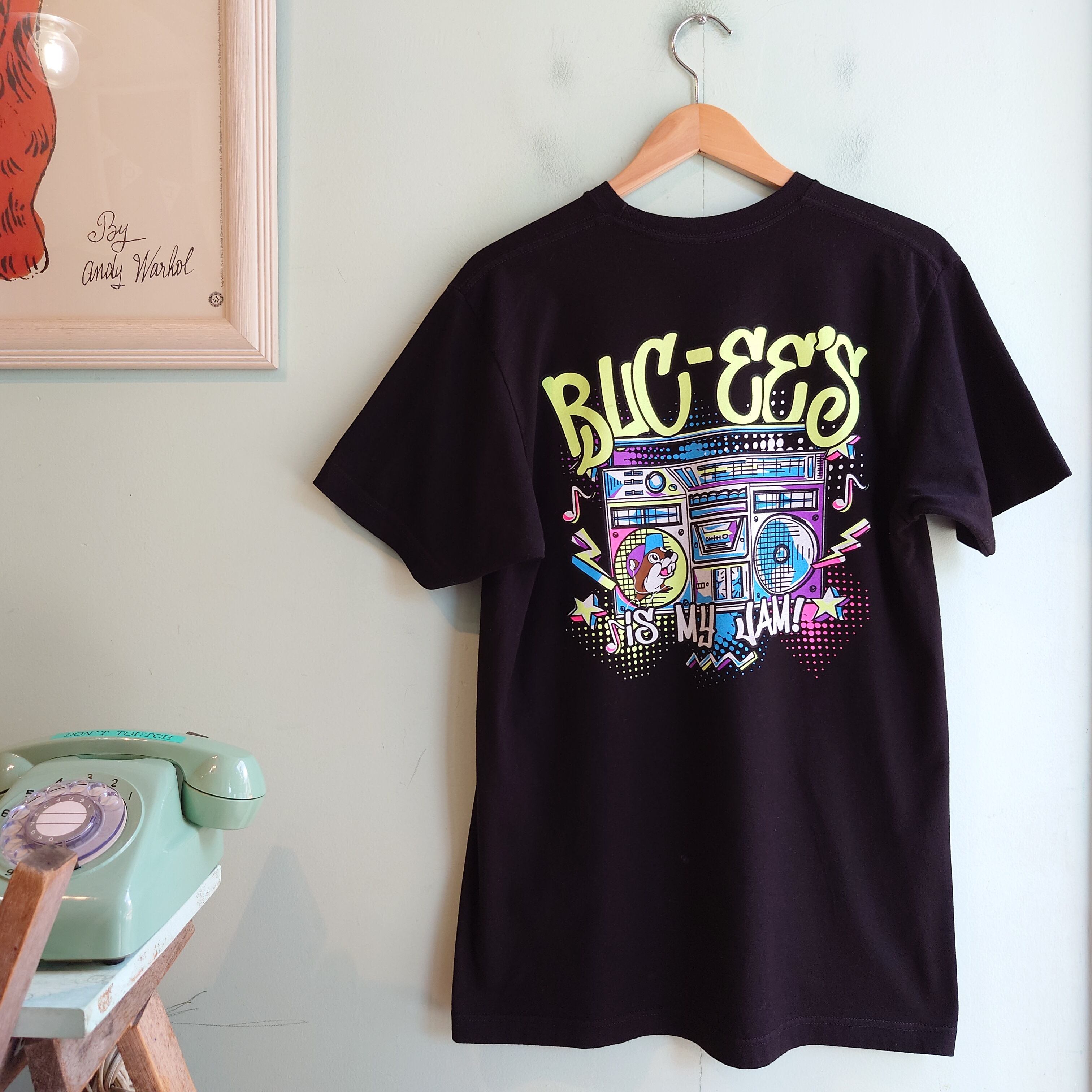 米国ドライブインチェーンの名門、バッキーズのアドバタイジングTシャツ。アメリカンなモチーフとは一線を画す、ライムカラーをフューチャーしたラジカセ柄で、音楽的、ポップさが際立つ1枚。