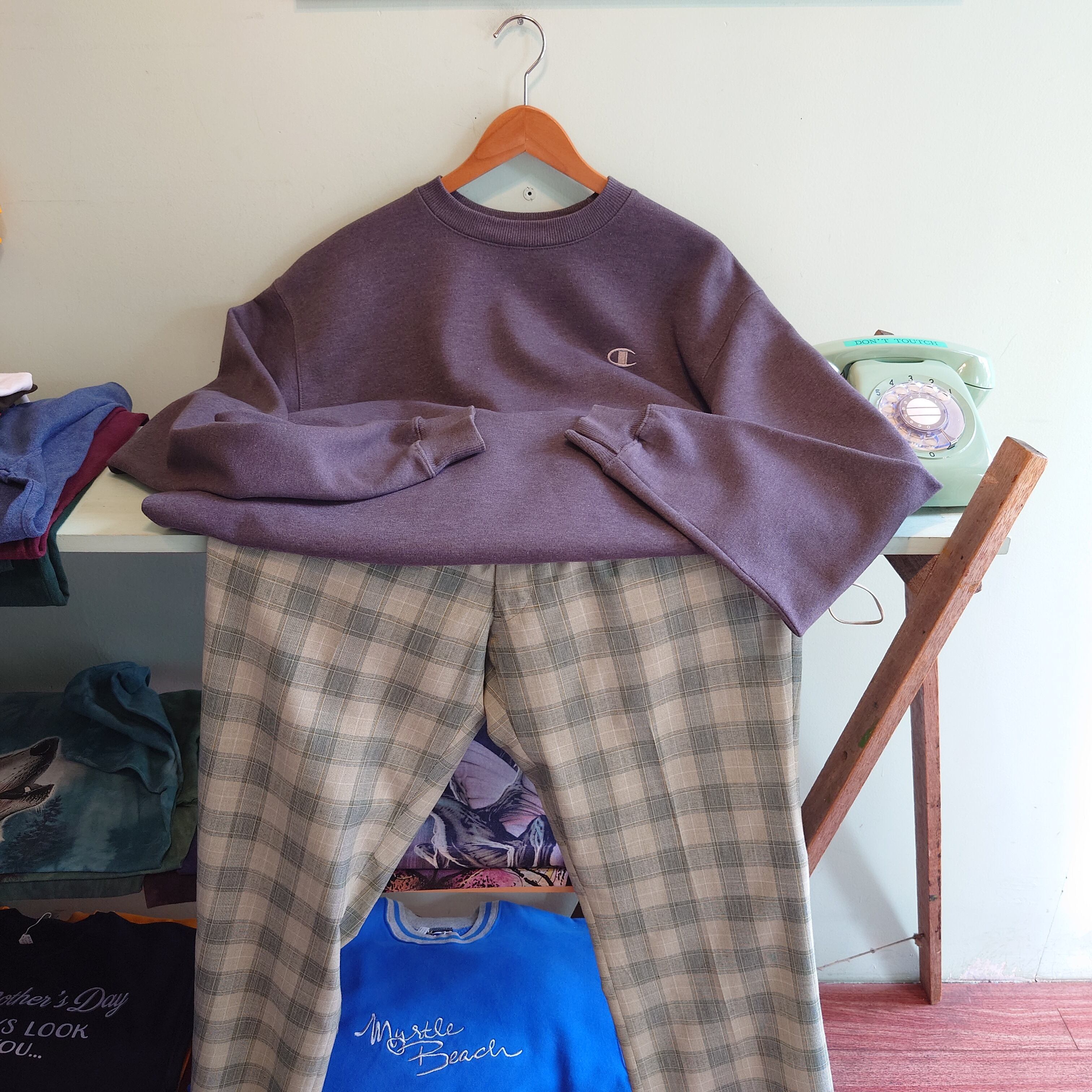 胸に刺繍ロゴが入ったダークグレーのChampion。グレーよりもシャープだけど、黒よりやわらかみがあるアメカジらしいダークグレー。きれいめにもクールにも似合う、定番中の定番。程よいコロンとした丸さ、ざっくり感でボトムも選ばない。