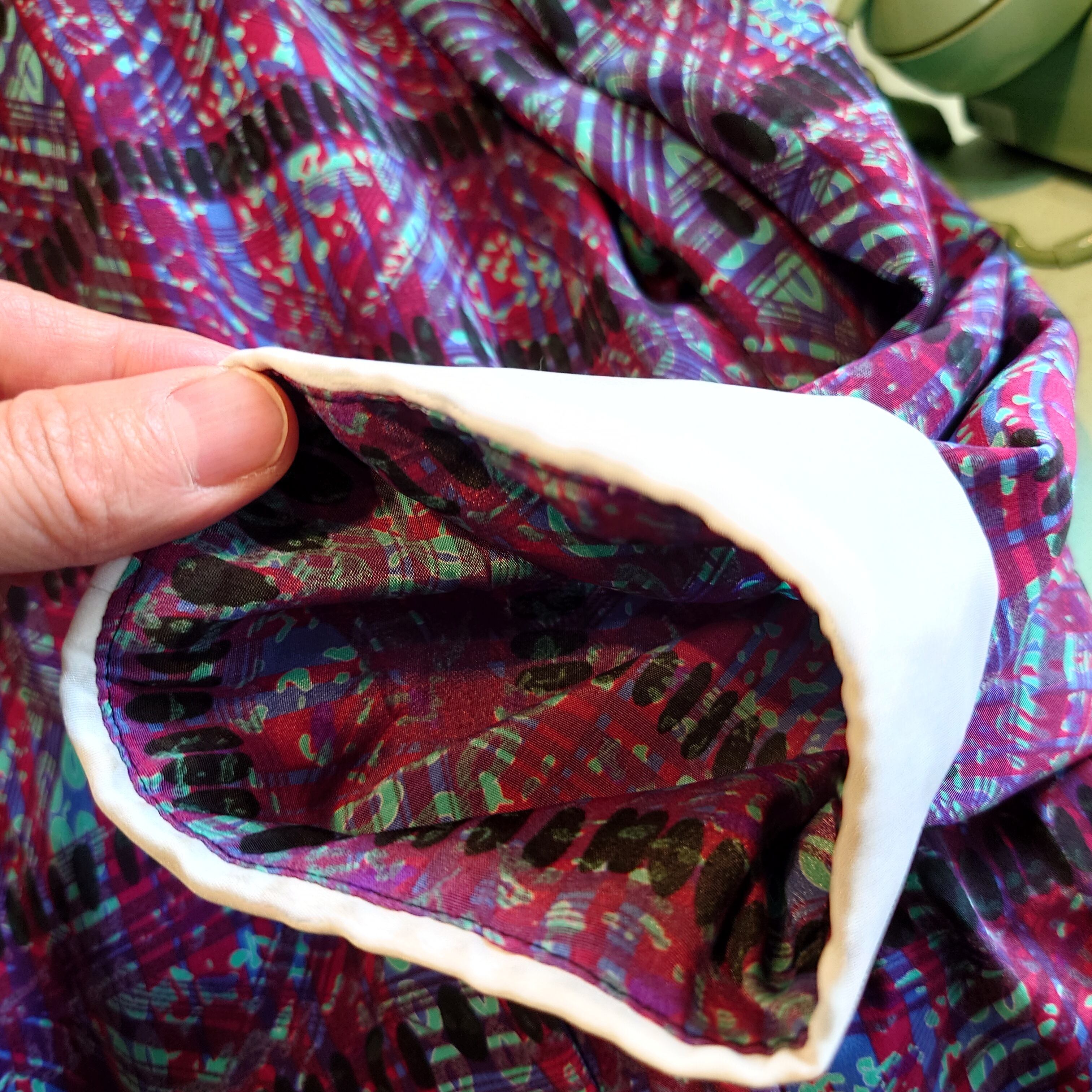 ありそうでない色合い、赤系にミントグリーンが個性的な総柄ワンピース。折返し袖は新鮮な白、裾のサイドから後ろにはさり気ないプリーツいり。トップはプルオーバーブラウスのようなシルエット、裾はほんのりマーメイドライク。程よく緩め、程よく大人っぽいシルエットの薄手ひらひらドレス。