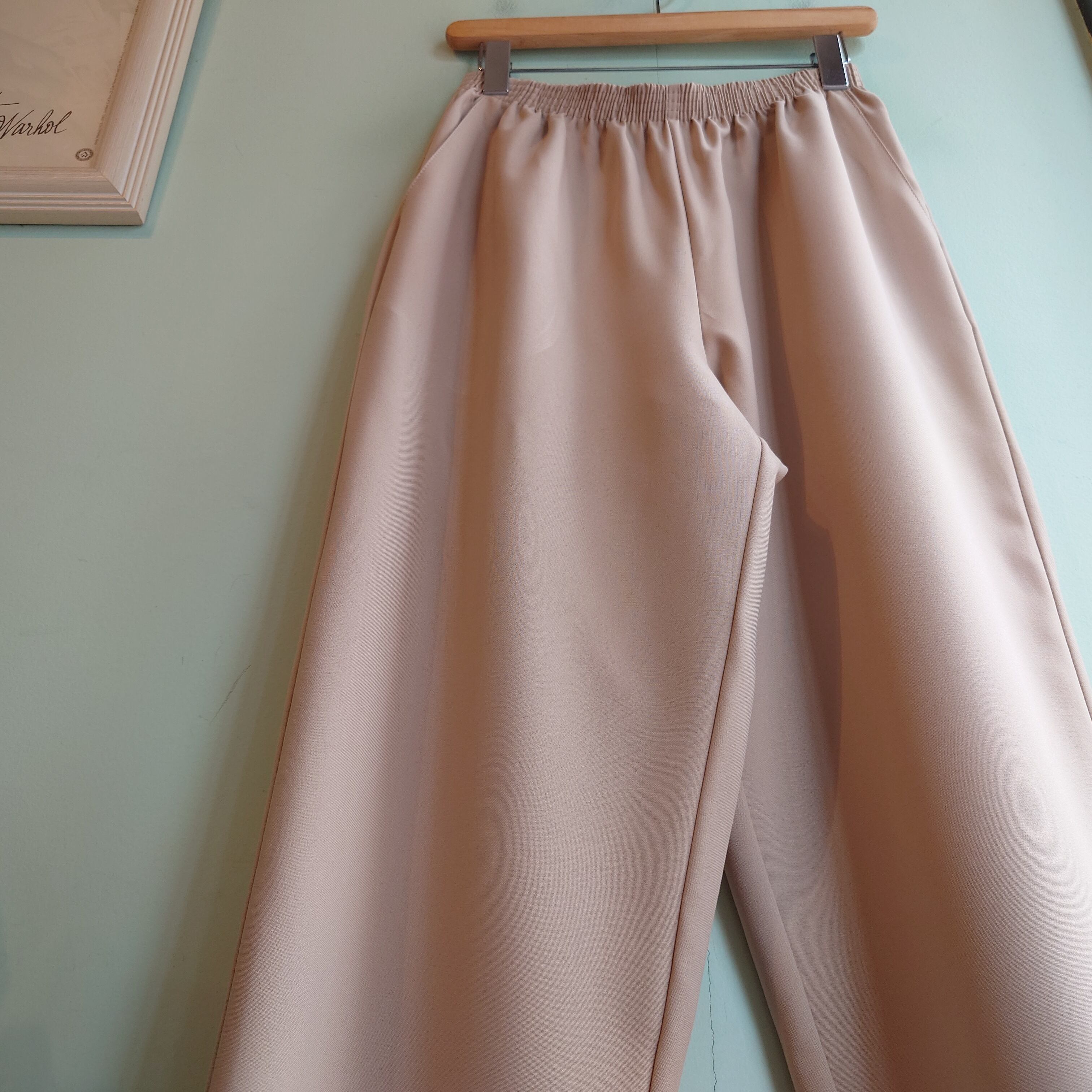 イージースラックスの中でもツイルではなく、スムースな薄手生地が爽やかな淡いベージュのカラーパンツ。古い時代ならではの、より丸さが際立つカーブのテーパードがレトロ。
