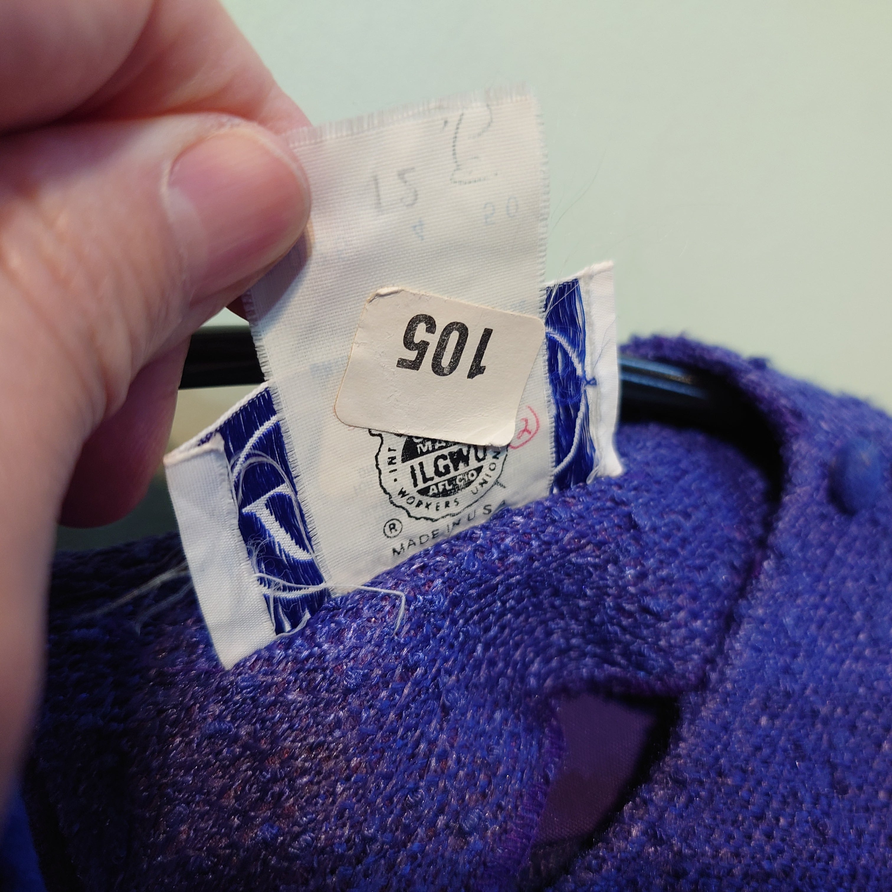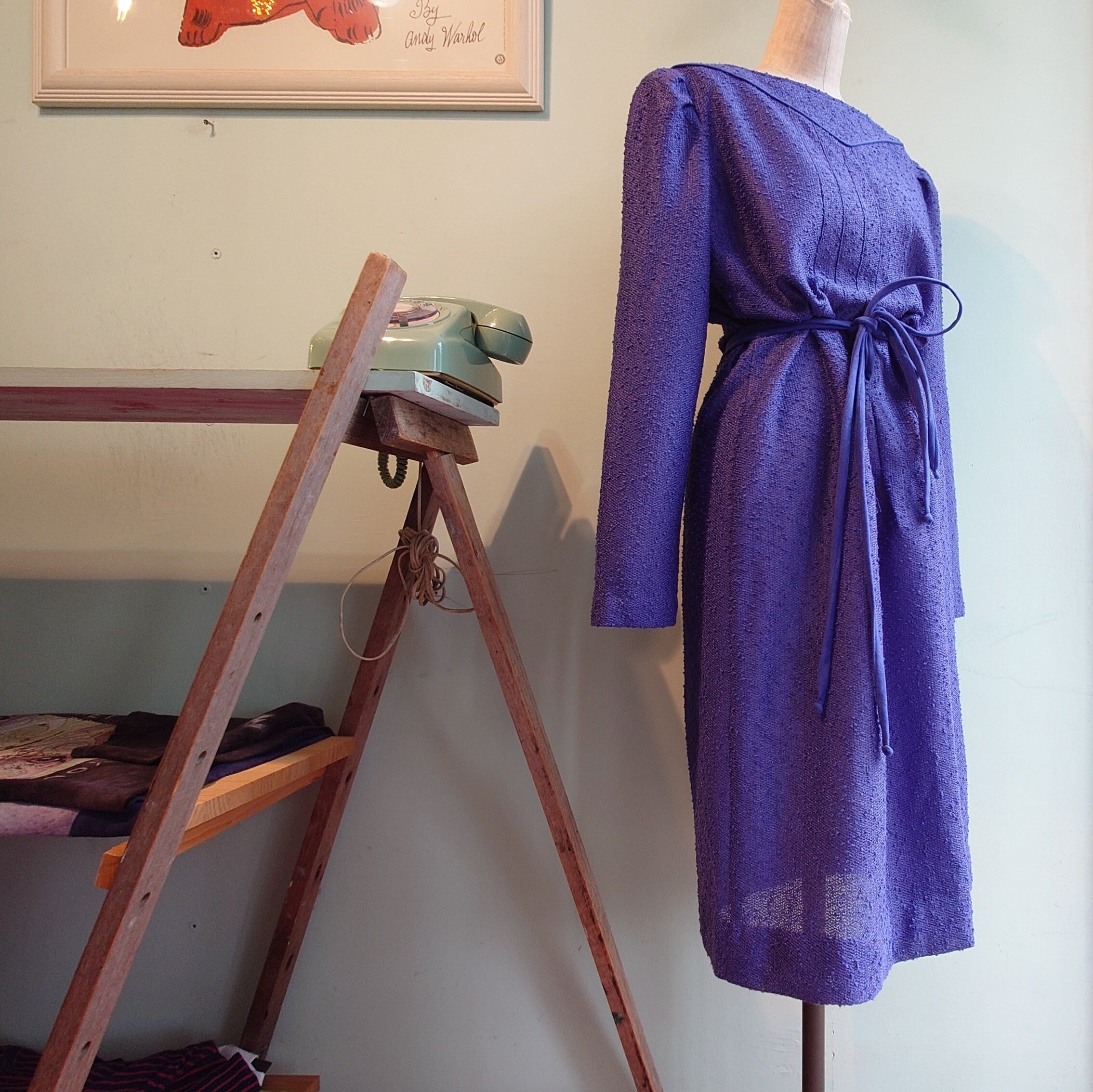 名門レズリーフェイのヴィンテージワンピース。ラベンダーよりの紫に、強めに飛び出す糸目が面白い。パフスリーブは上品なヨーロピアン的に、絞り紐で絞ればよりガーリーに。