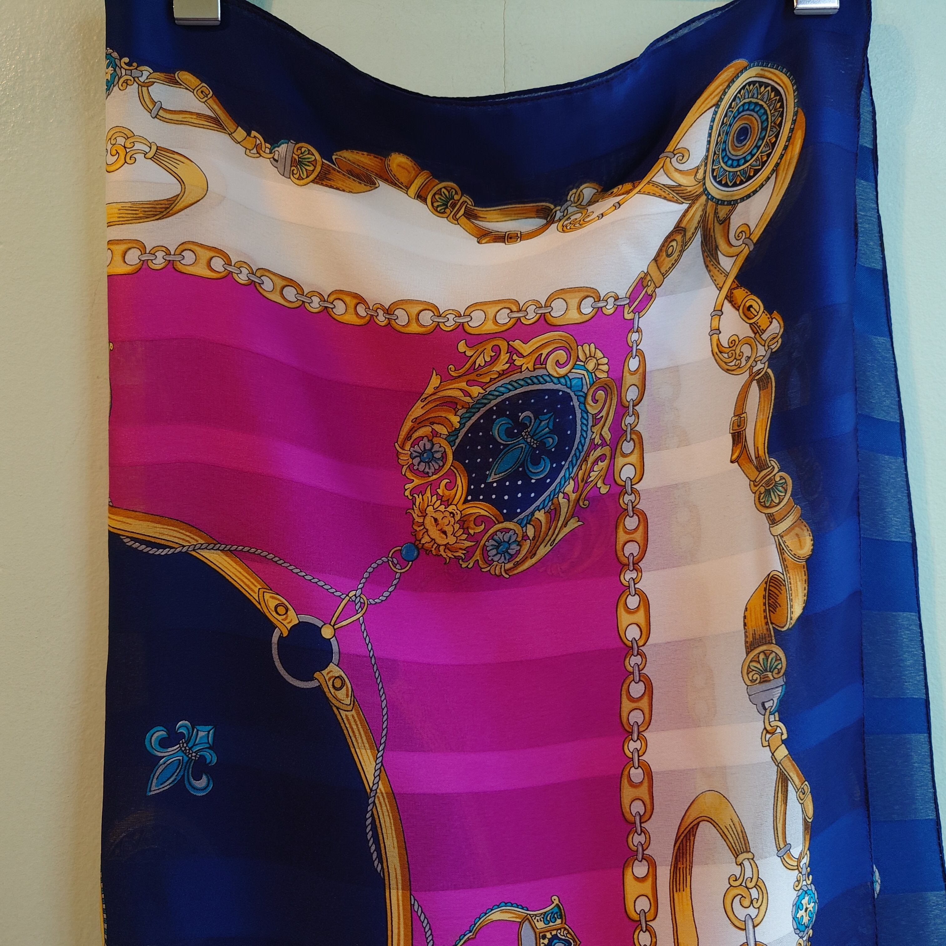 マリンカラーにゴールドとピンクをインストールした、宝石モチーフのヴィンテージスカーフ。サラッとした爽やかなガーゼライク素材がひらひら美しい。細かく折りたたんだり、大きく使ったり、程よいサイズ感も◎