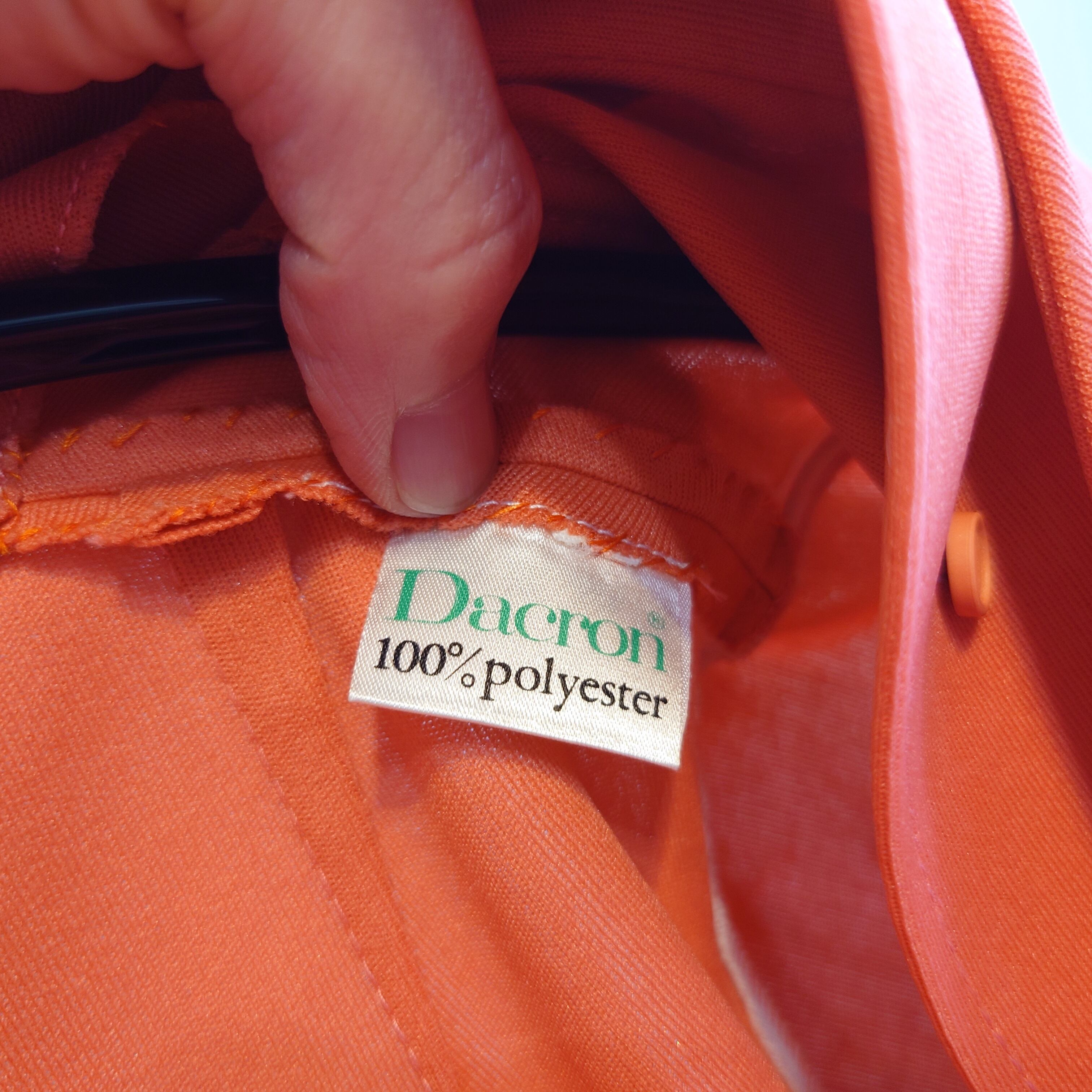 襟にリボンやスカーフを巻いたようなデザインのヴィンテージスカーフ。スタプレ系素材のまったり感、くすんだ色味のオレンジなど、現代のアイテムにはない表情も魅力。ゆるすぎずタイトでもない、きれいなショートシルエットはユーロ系ならではの美しさ。