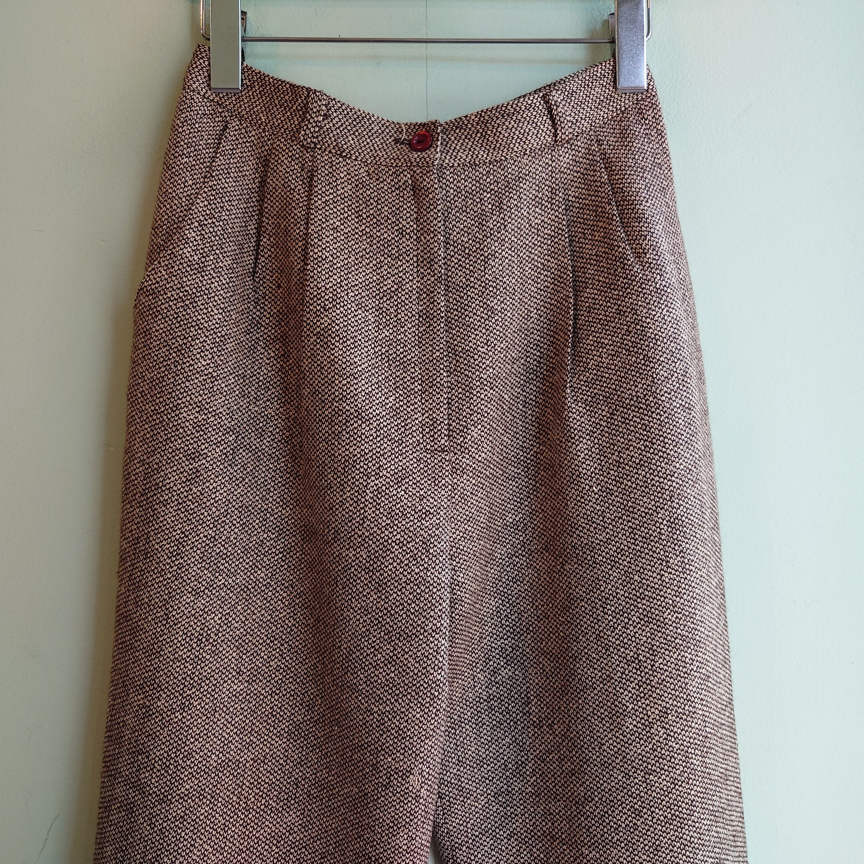 ブラウン×ホワイトのアクリル系の糸目で、ほんのり凸凹感がレトロなハイウエスト系のスラックス。タックのボリューム感、80年代系らしいテーパードのカーブがレディース古着の王道的シルエット。カットソー系と合わせれば元気なコーデに、ブラウスやニットと合わせれば上品に。