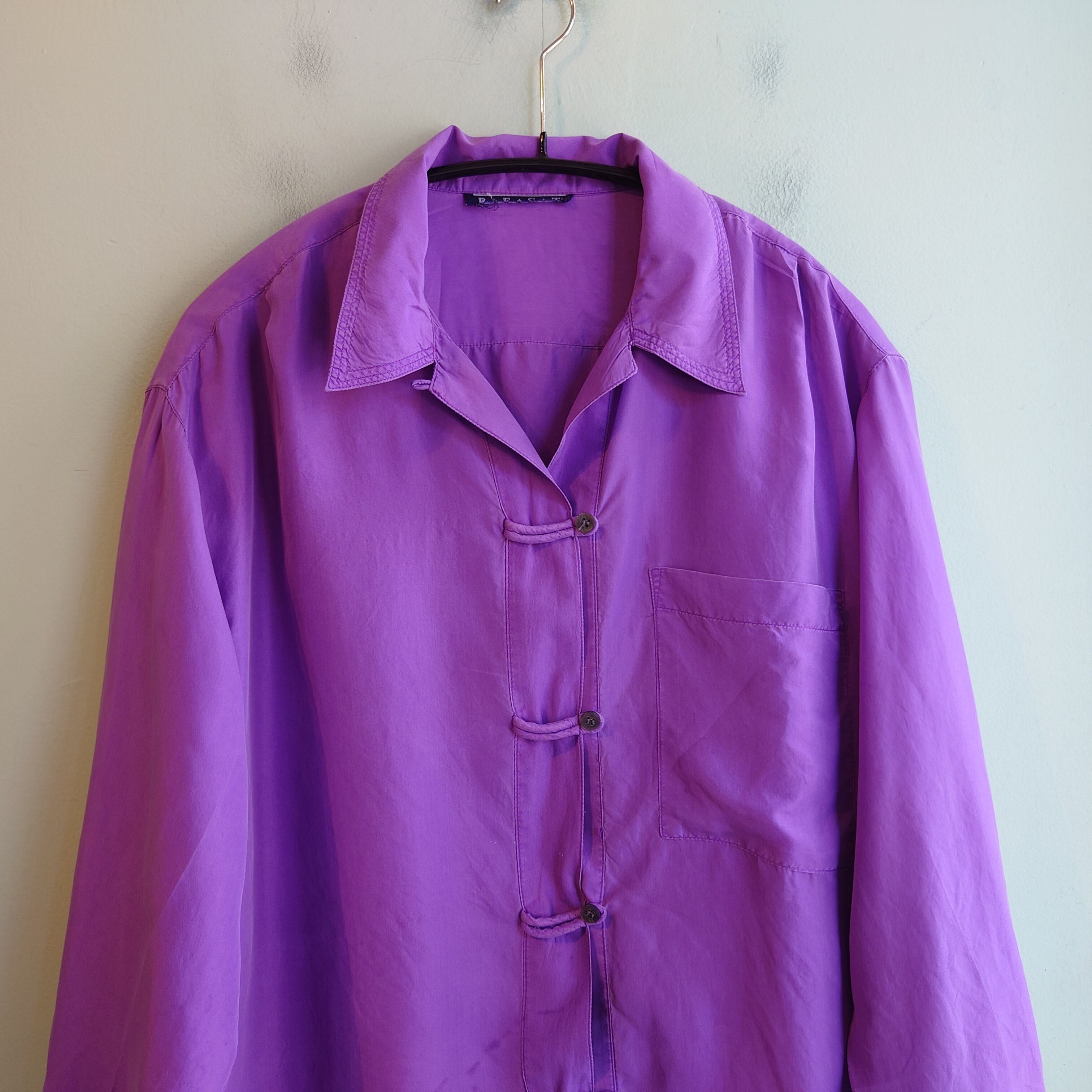~90s チャイナシャツ シルクブラウス デザインブラウス 紫 異素材