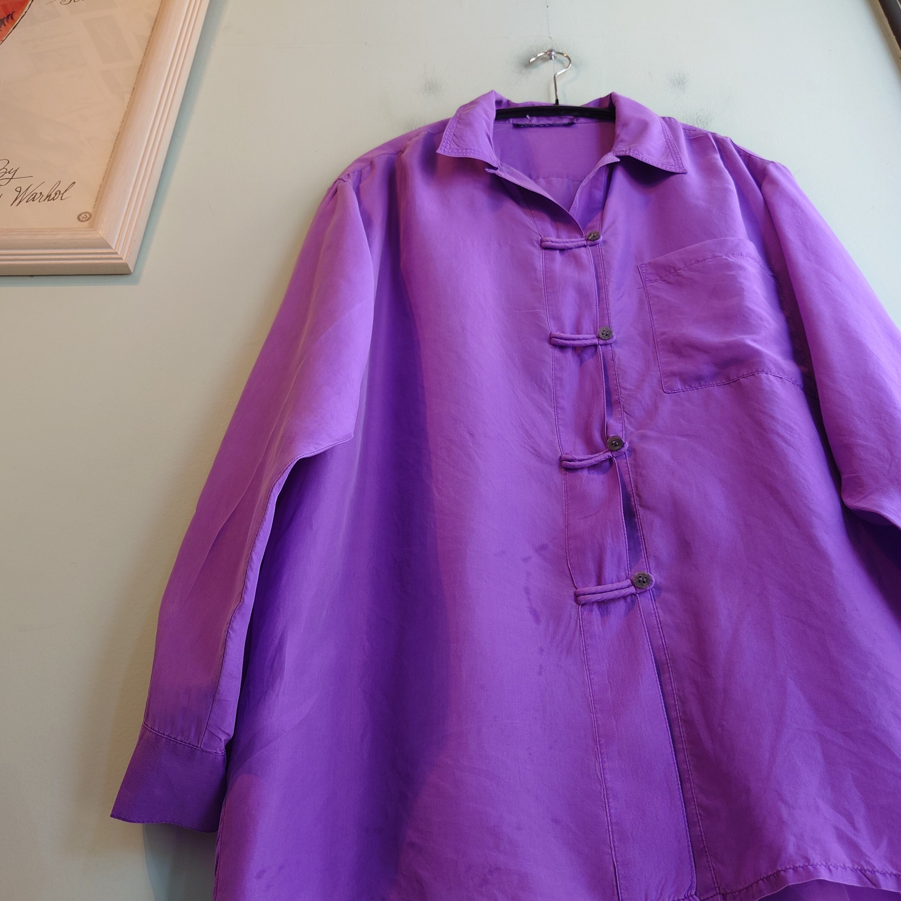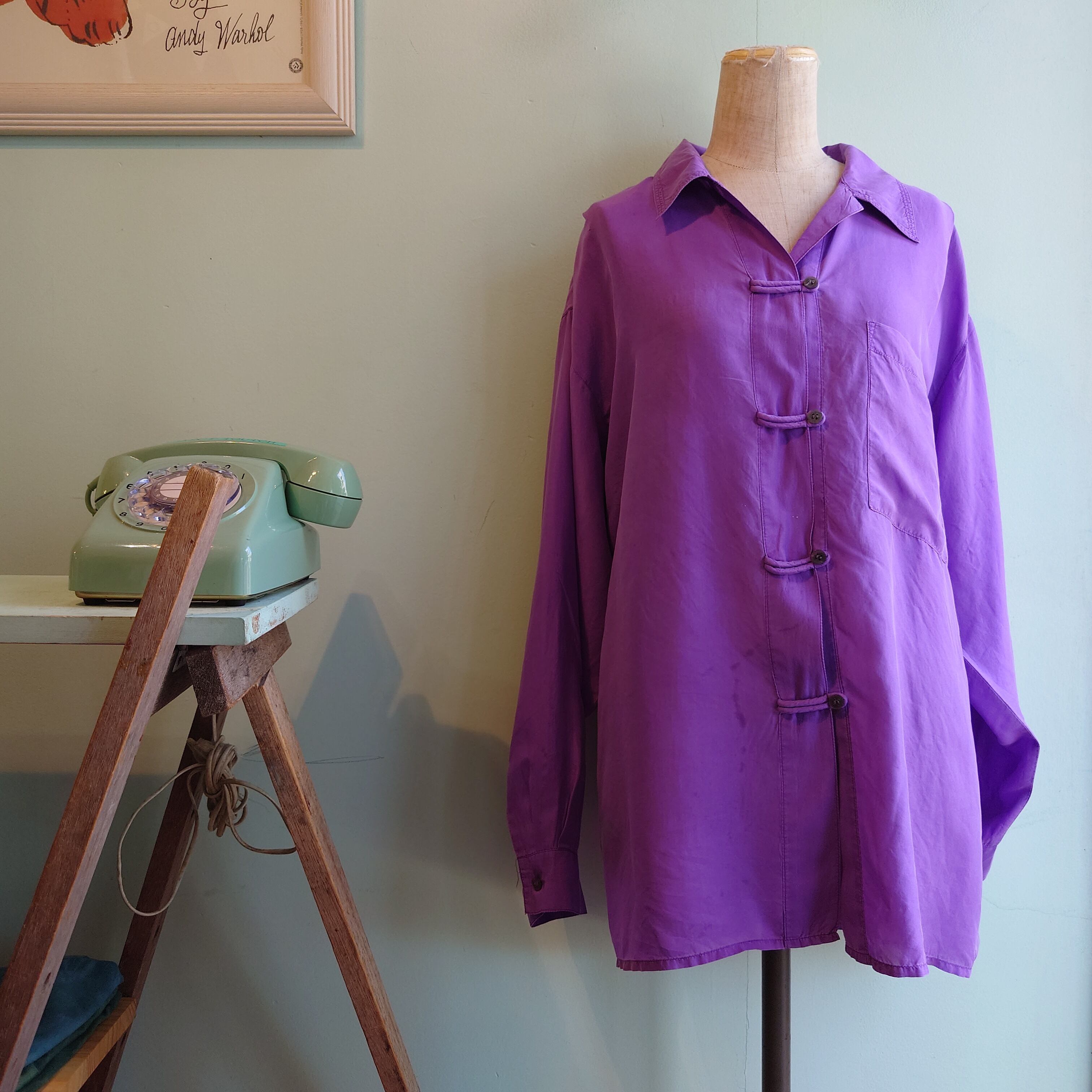 ◎~90s チャイナシャツ シルクブラウス デザインブラウス 紫 異素材