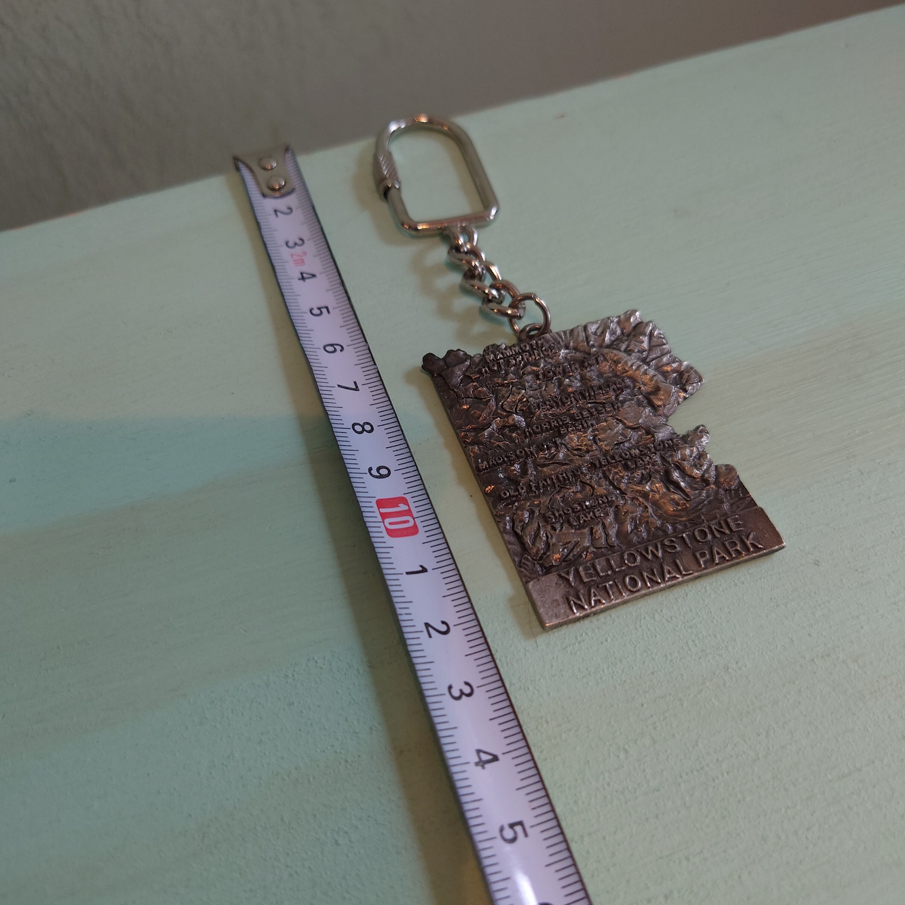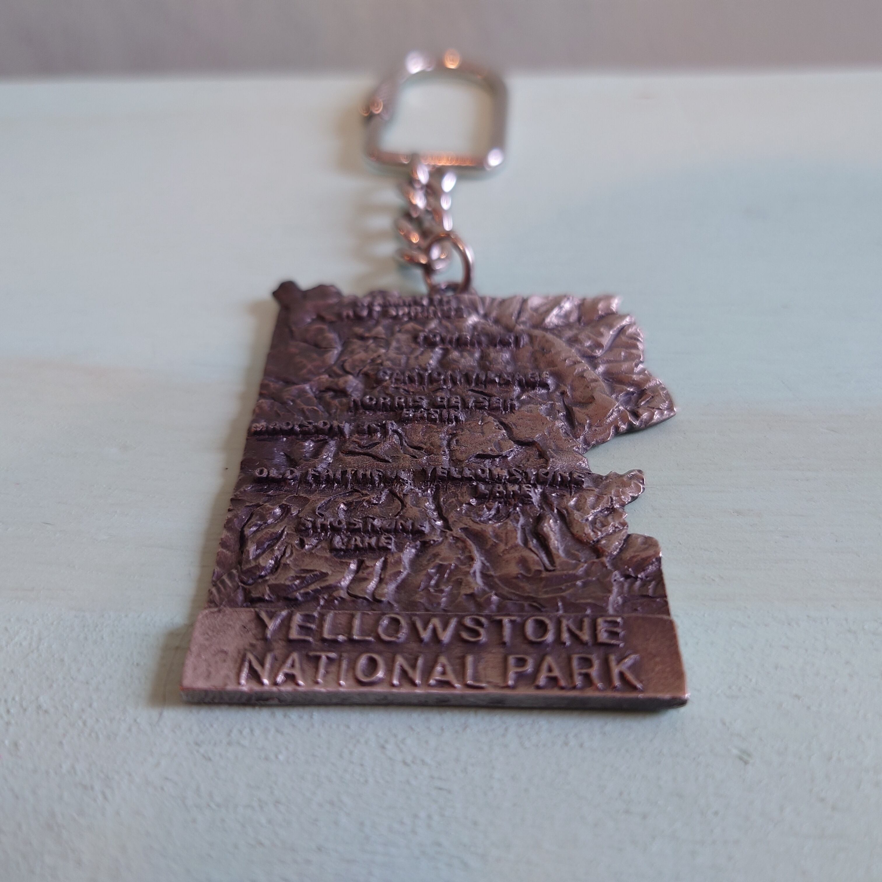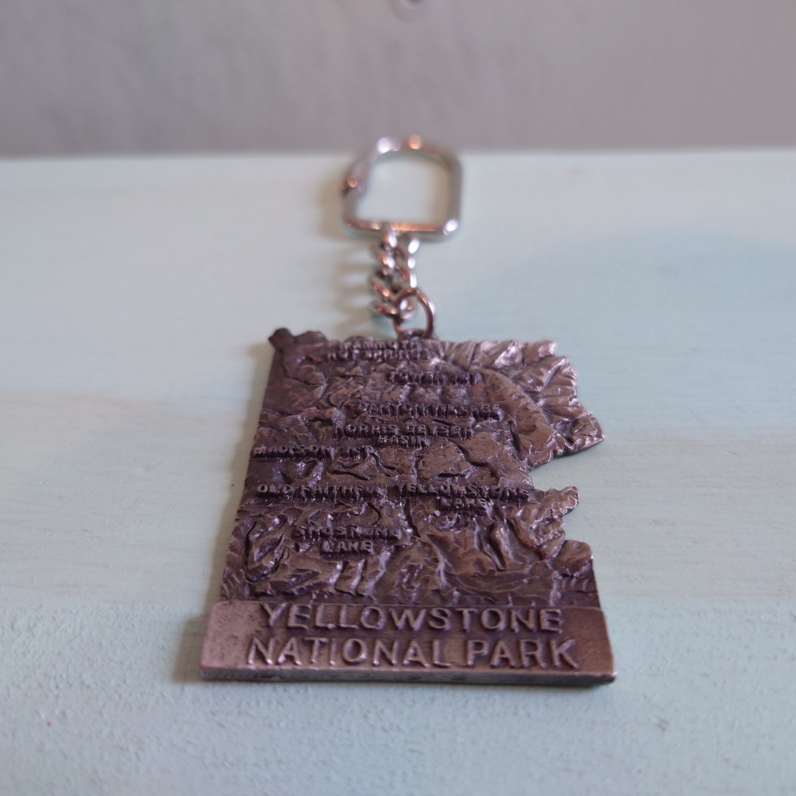 世界初の国立公園、イエローストーン国立公園を型どったスーベニアキーホルダー。金属系キーホルダーの中でも特にがっしり重めな素材で、古き良きキーチェーンの趣がある個体。