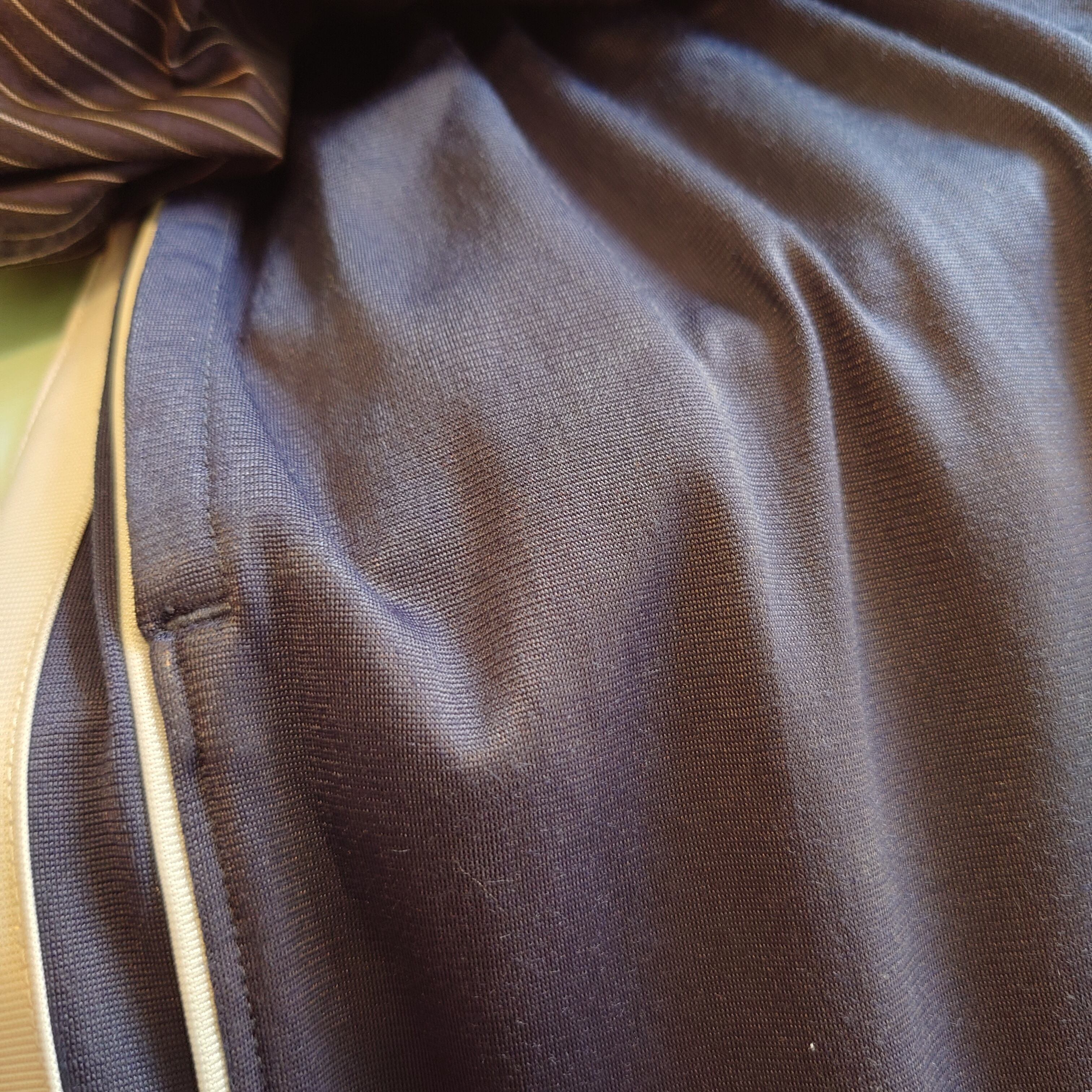 バスパン系のNIKE。ストンとした太めなシルエットのサイドラインパンツ。サテンのように光沢感あるネイビーと、立体感が付けられたサイドラインで動きのあるスタイルに。