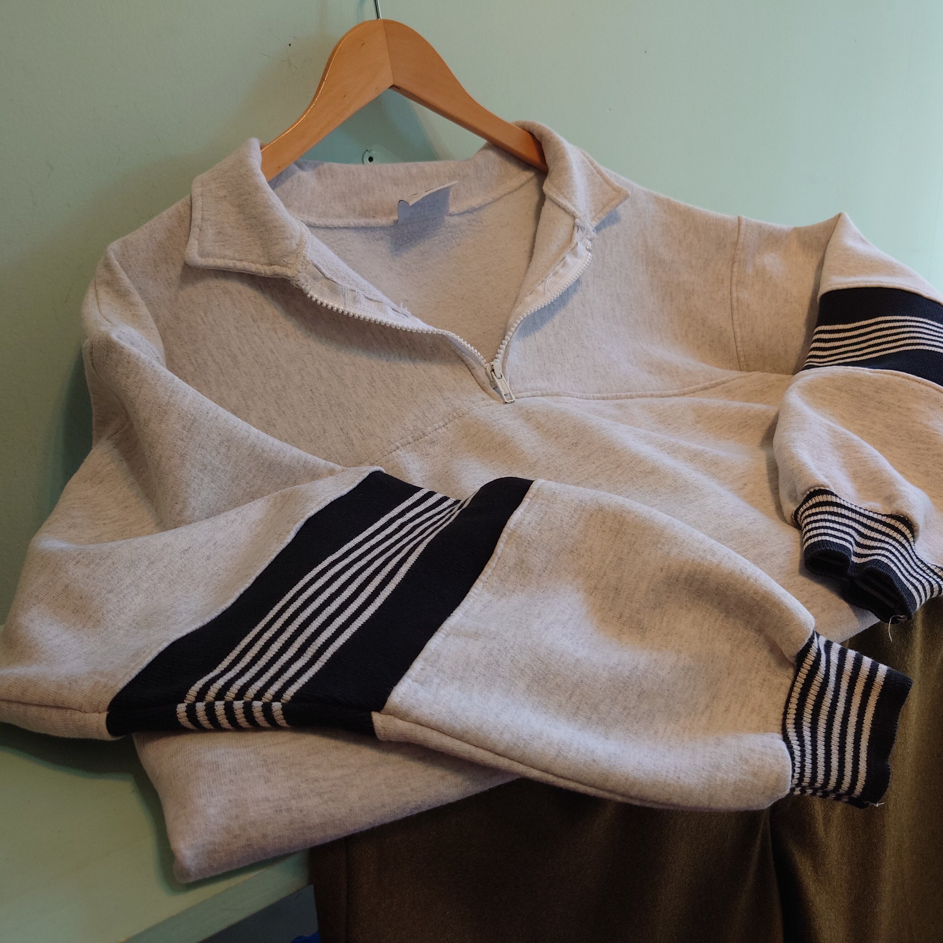 ジップが襟先までつながらず、セーラーシャツのようなシルエットになる、80sライクなデザインスウェット。切り替えのデザイン部はリブ素材が使われていて、素材素材の面白さが生きたデザイン。ワイドでショートなスタイルで、ユニセックスな雰囲気がかわいい◎