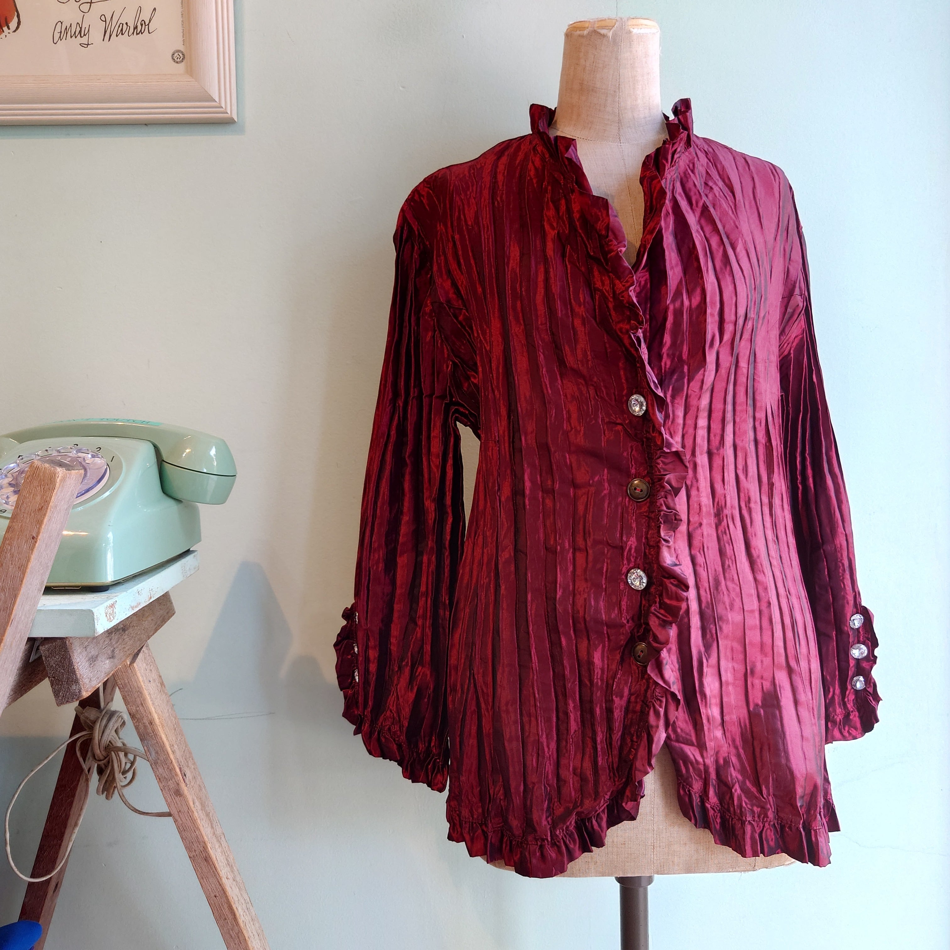 折りたたんでプレスしたような独特な縦畝が面白いフリルブラウス。陰影があるボルドーや、上と下にV字で広がる合わせ、袖のカーブも見逃せない。カーディガン的に羽織ったり、インナーに使ってもアクセントになる。