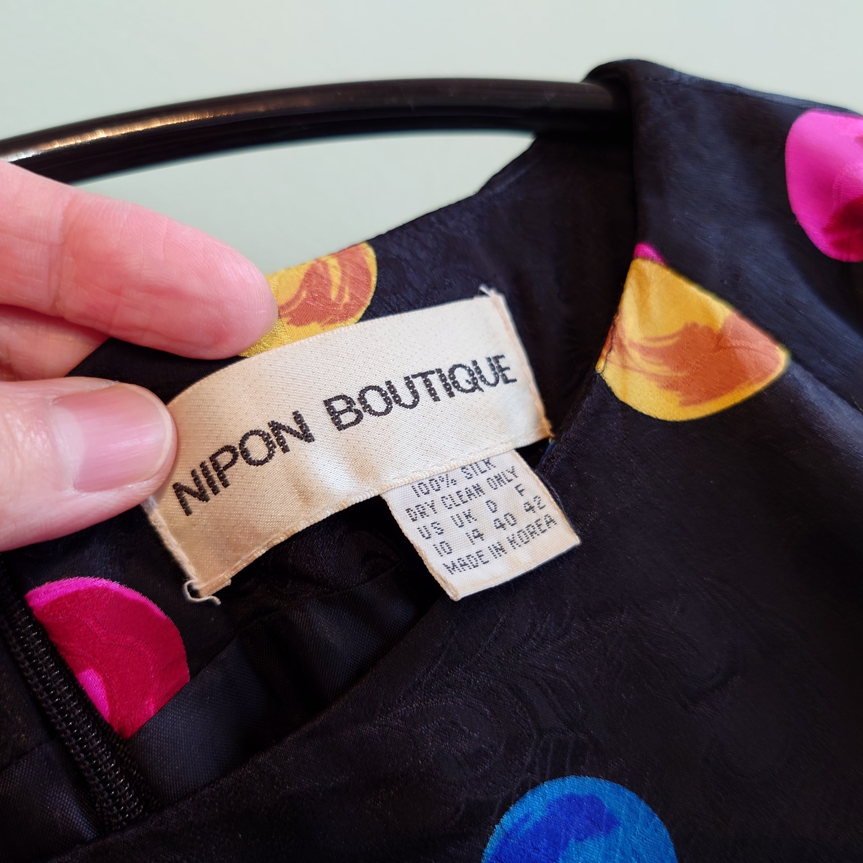 NIPONBOUTIQUE 〜90s vintage ヴィンテージドレス 総柄ワンピース サテンワンピース 黒