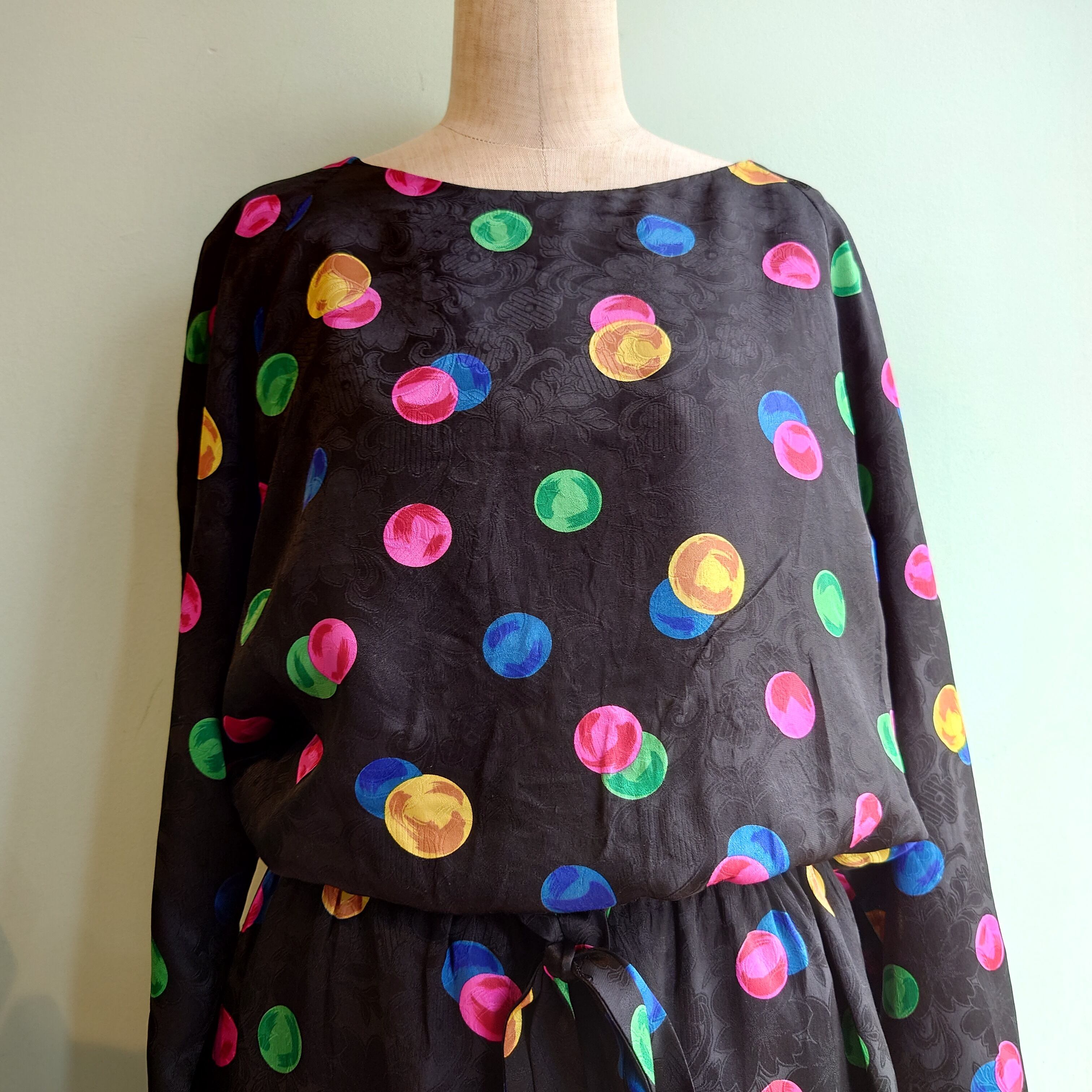 サラッとひらひらしたシルク系素材の総柄ワンピース。黒にさりげなくペイズリー柄が入ることで、カラフルなドットも大人っぽさあり。ウエストに付いた飾り紐もナイスアクセント。