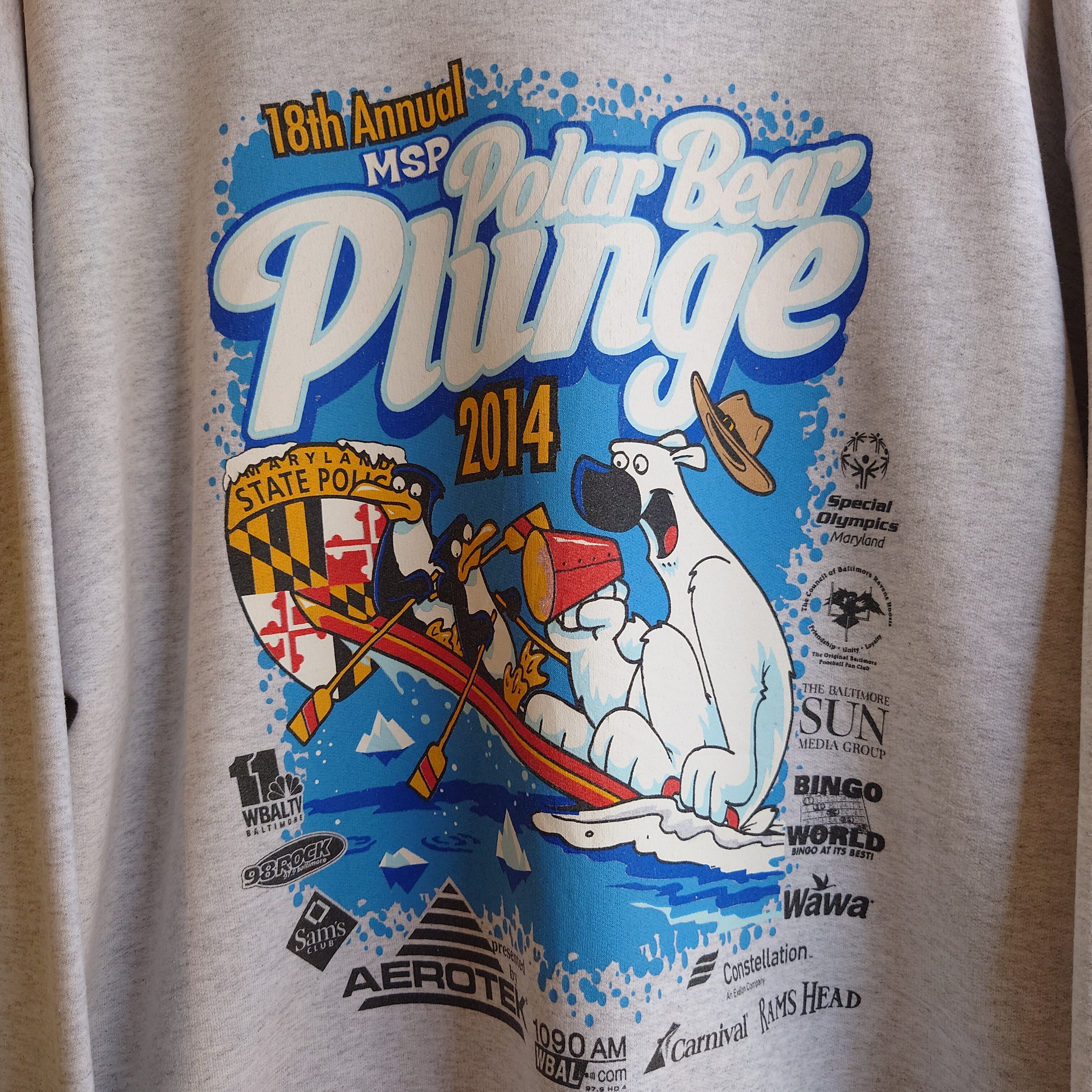 メリーランド州の警察による募金イベント、"ホッキョクグマプランジ"のアドバタイジングスウェット。ペンギンとしろくまのアメコミ風のプリントが可愛すぎる。バックには企業系ロゴ盛りだくさんで、警察系のロゴの羅列がなかなか珍しい。