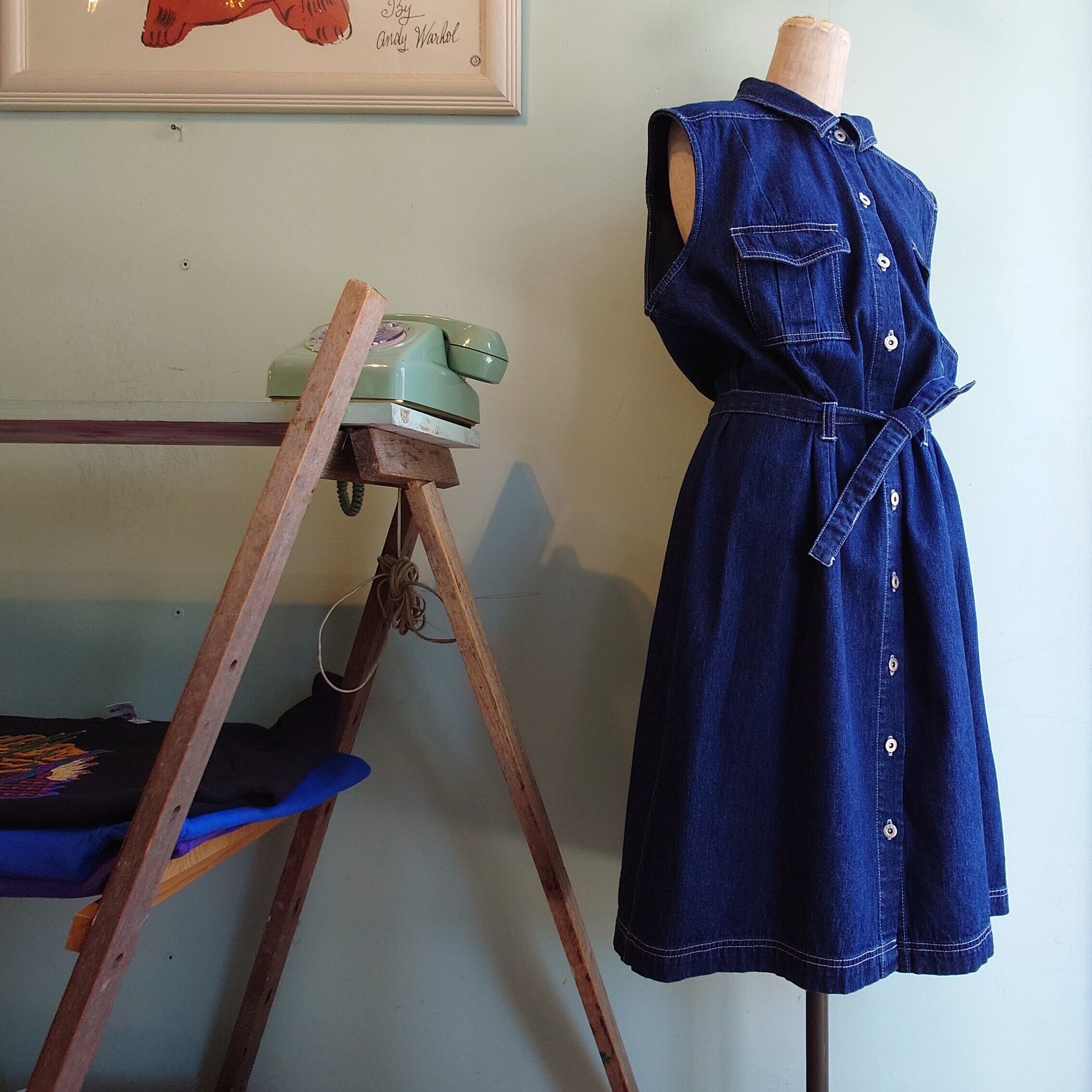 FADEDGLORYのノースリーブドレス。ワンウォッシュに近いインディゴの濃さに、白のステッチが爽やか。ボタンフロントだから着こなし自在、定番の重ね着からガウン風の羽織まで、季節やスタイル選ばずに使えます。デニム生地は厚すぎないタイプで、軽みがあるのもポイント。取り外し可能な紐付き。