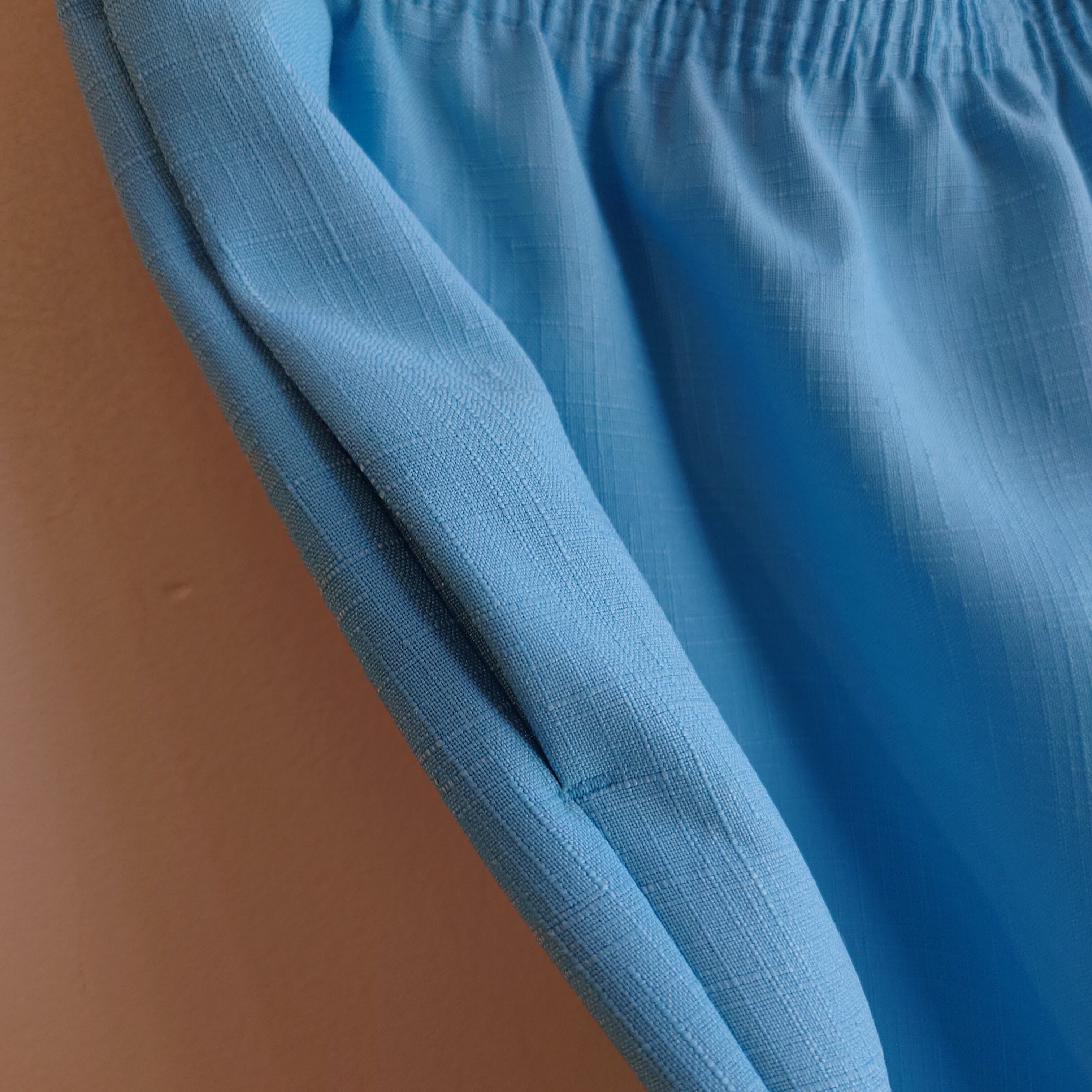 スカイブルーやシアンのように、明るさが武器になる系の青みがフレッシュなイージーパンツ。リネンのジャケットのようなザラつきと、織りの模様がつけられた異素材で、明るさだけでなく大人っぽさも。比較的新しいタイプですが、80sのようにテーパードのカーブが強めなレトロなシルエットです◎