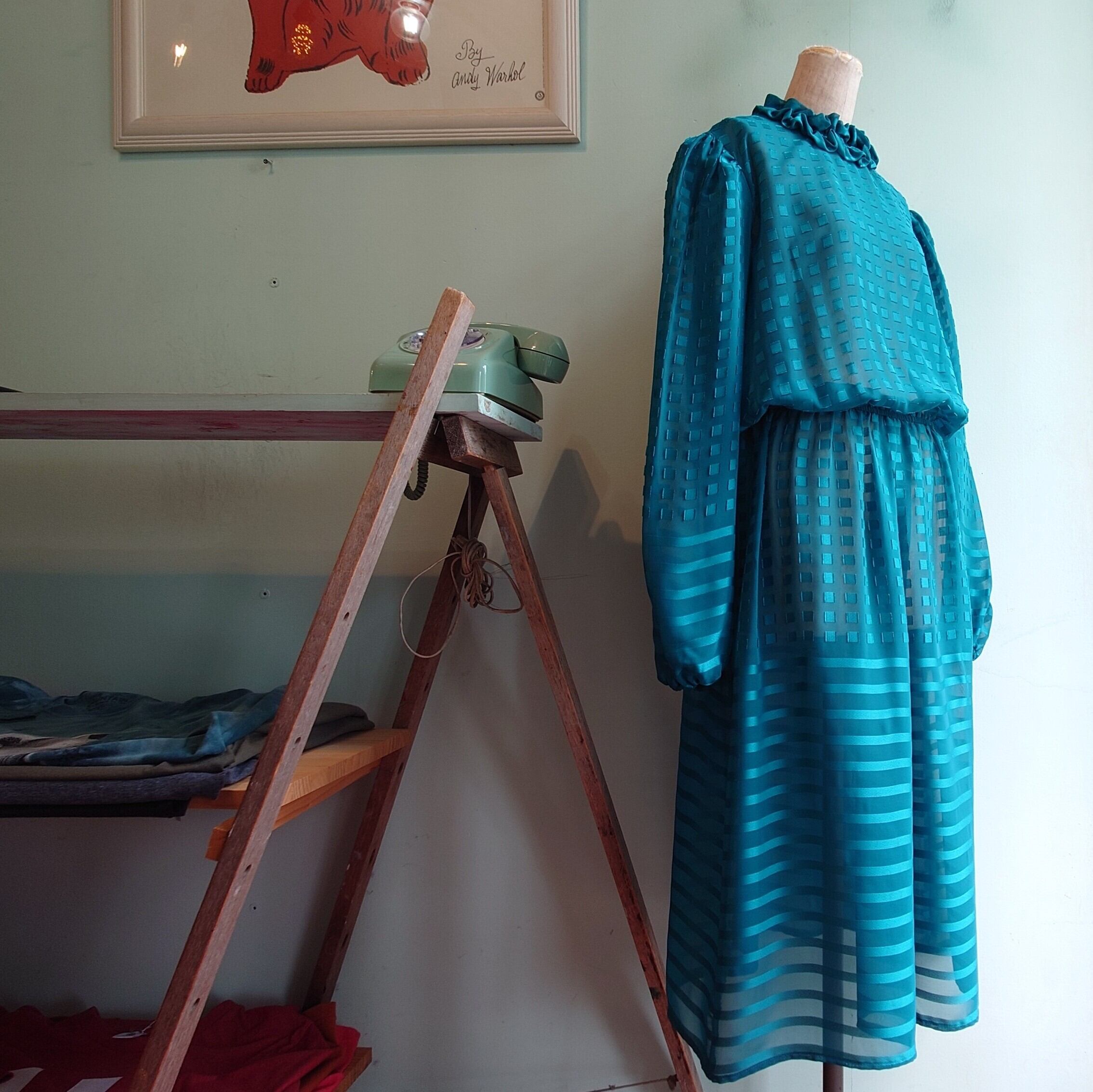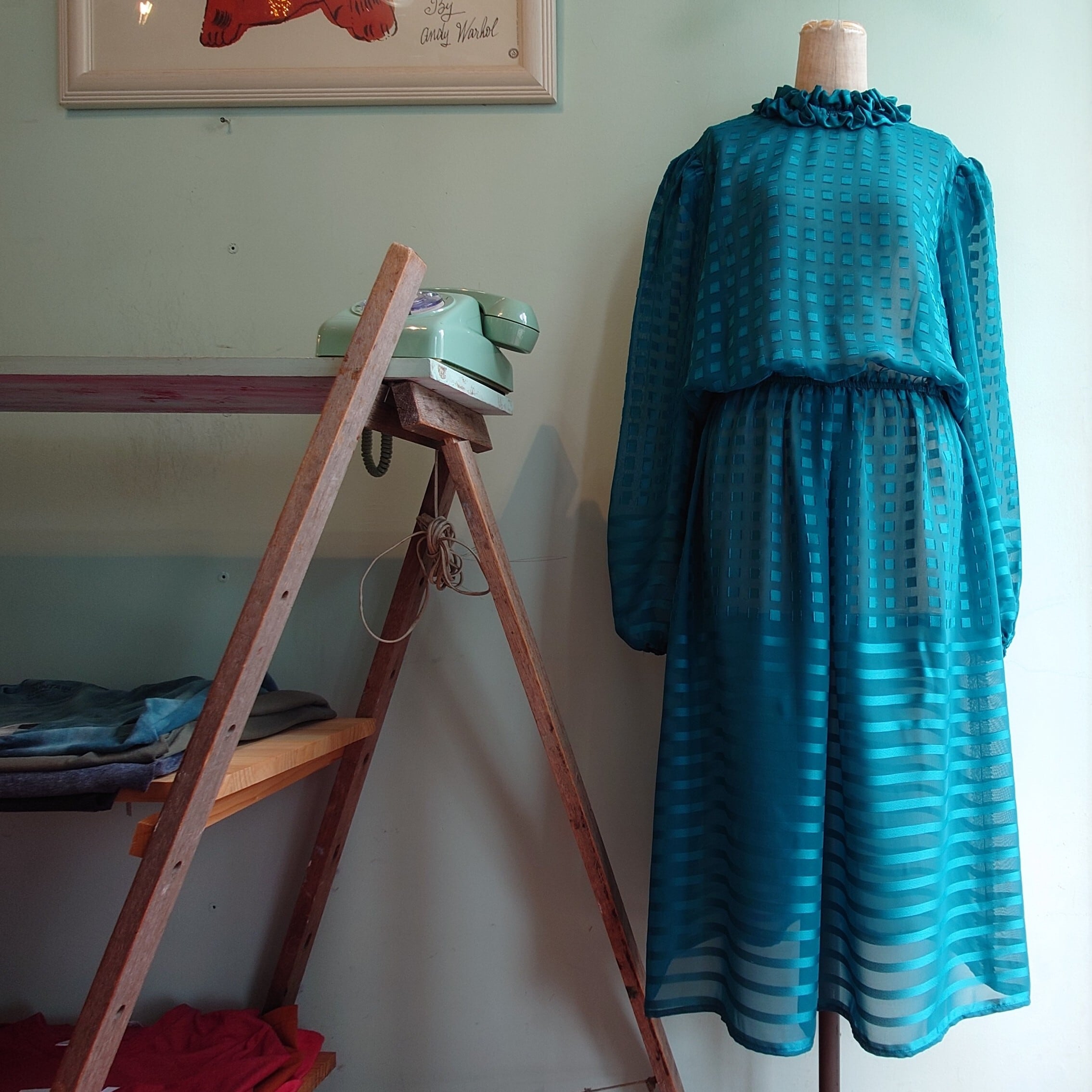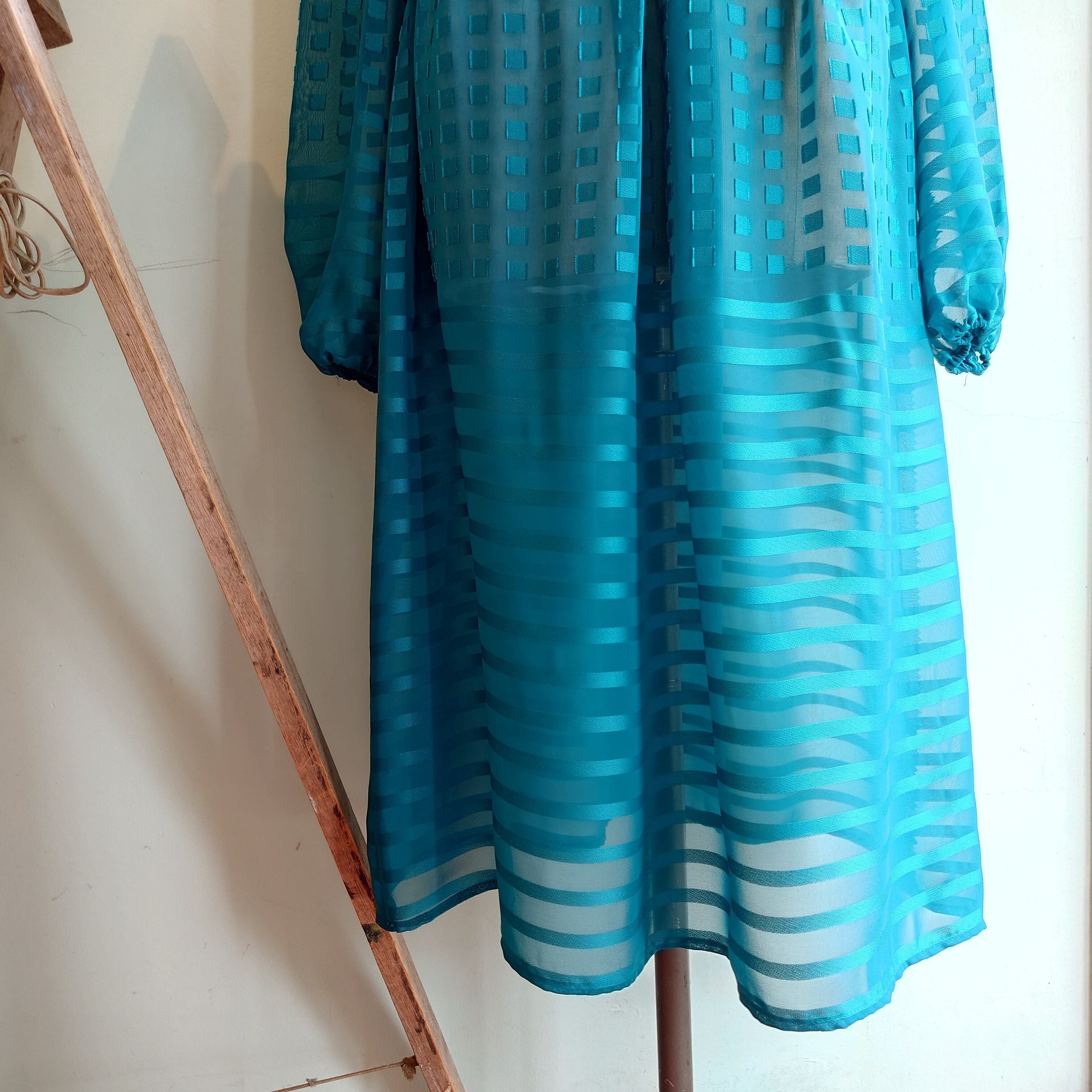 スクエア柄とボーダー柄がワントーンで見え隠れする、グリーンのシースルーワンピース。ほんのりパフスリーブがヨーロピアンで、クルーネックシュシュタイプの襟元も珍しい。インナーにドレッシーなナイトウエアを合わせたり、デニム×Tシャツに重ねても◎、透け感を活かしたコーデに。