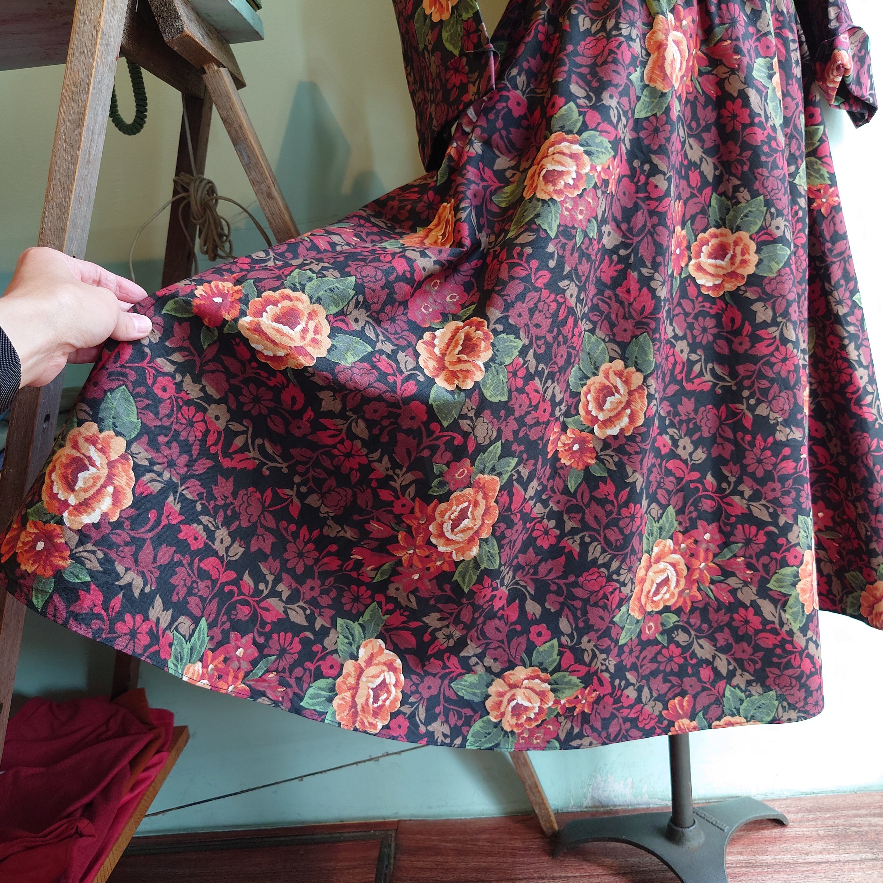 ナチュラルなコットン素材、黒に浮かび上がるゴブランタッチの花柄が美しいヴィンテージドレス。トップと袖はゆるっと、ウエストしっかり、裾にかけては広めにフレアする絶対にかわいいシルエット。希少なヴィンテージ、未使用アイテムとなります。