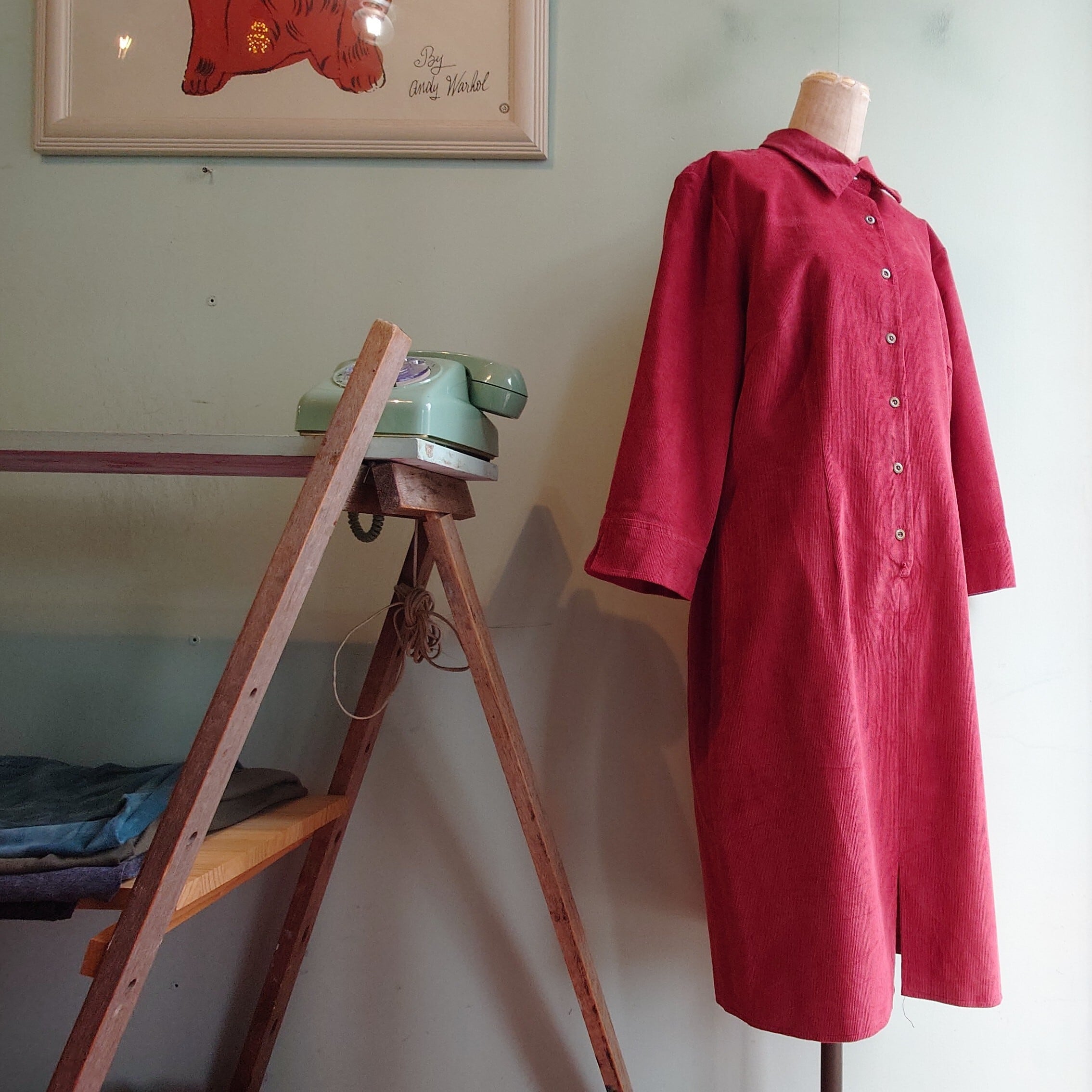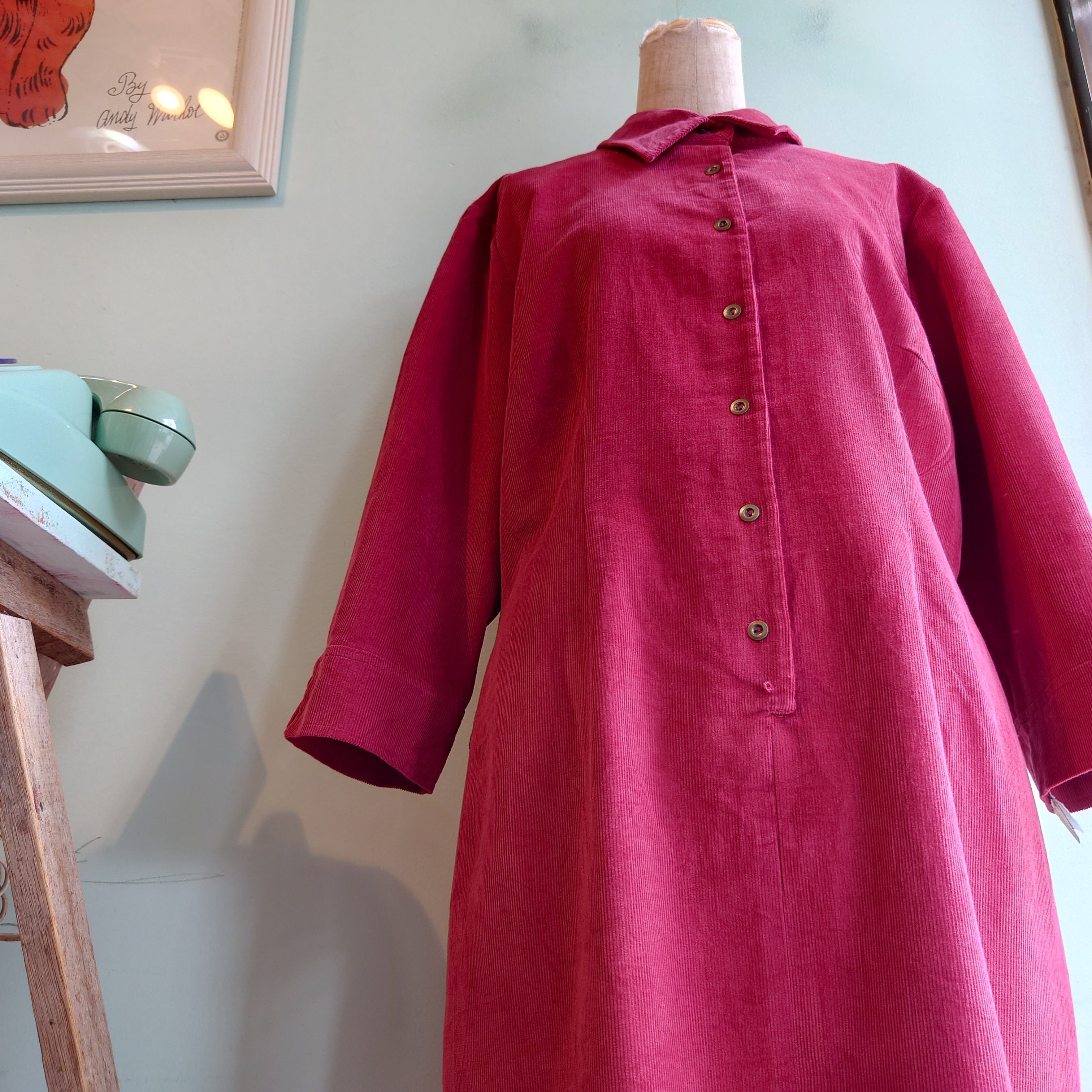 タグ付き、デッドストックのコーデュロイワンピース。ボルドーにピンクを混ぜたような中性的な赤系に7-9部丈のスッキリさ。ストンとしつつもやや丸みのある作りがキッズライクな一枚。ベルト付きでウエスマークしたスタイルも◎。タグ付きのデッドストックとなります。