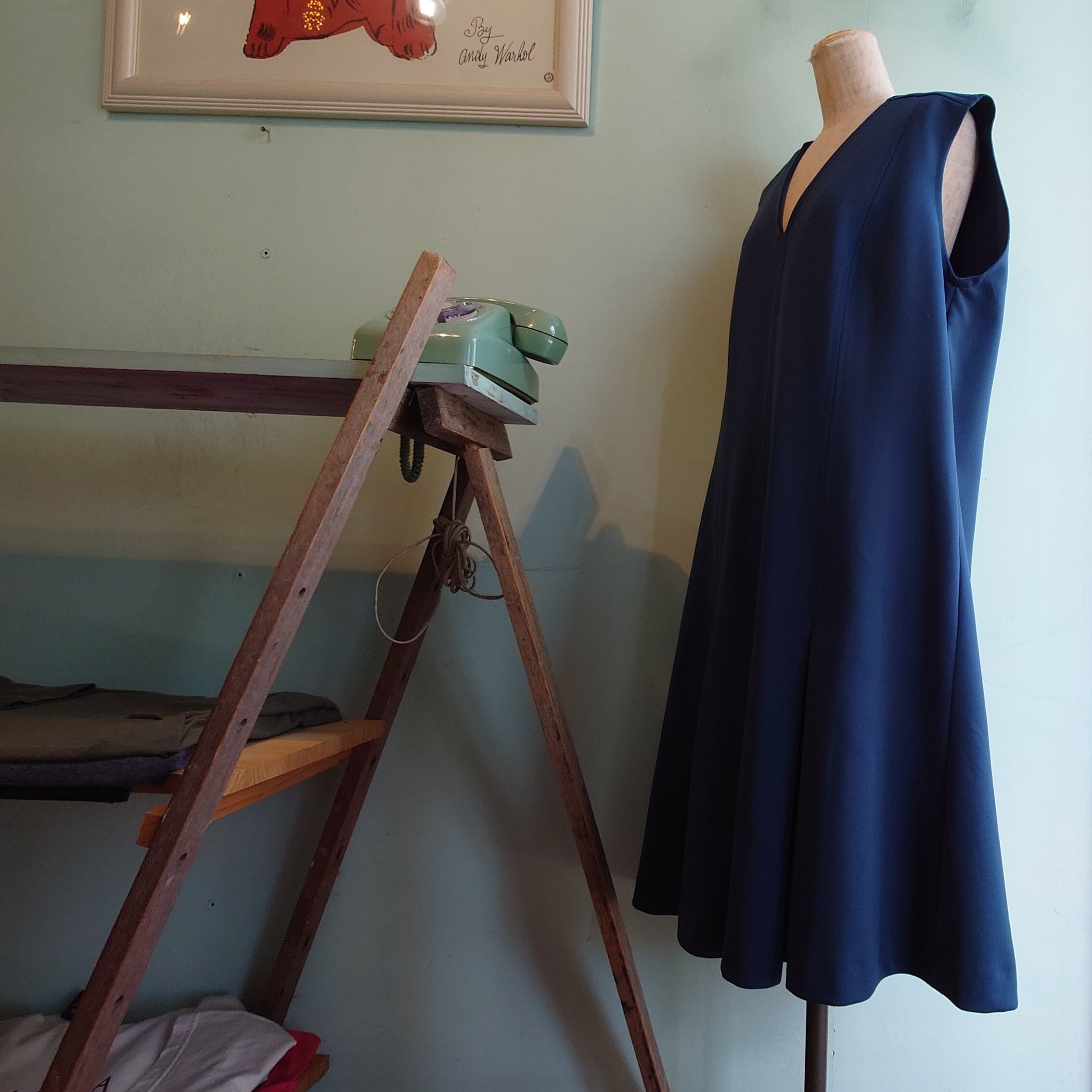 70年代らしい、まったりとしたスタプレ素材がレトロなヴィンテージドレス。ノースリーブと深いVネックが意外なコントラストで、スタプレ系では珍しく、強いAラインがかわいい。深みのあるブルーグリーンで、意外とインナーも自由度高め。